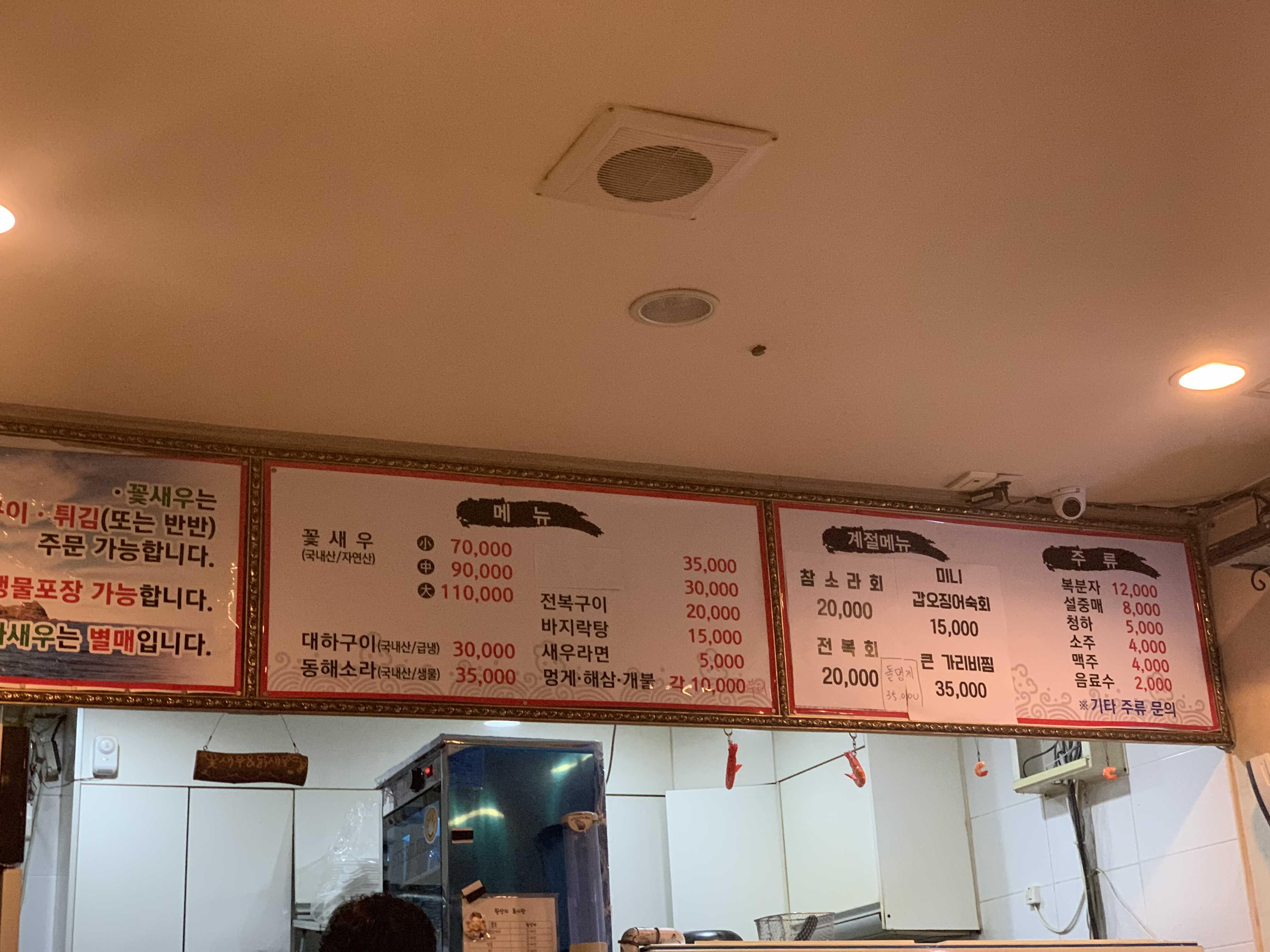 새우 가격대는 3가지로 "대" 11만 원, "중" 9만 원, "소" 7만 원으로 가격대는 저렴하게 느껴지지 않은 구성입니다. 자연산 새우를 감안하면 비싸다고 할 수는 없지만, 이미 저녁식사를 한 상태라^^ 부산은 "대선" 소주가 지역 소주라 대선으로 주문했습니다.