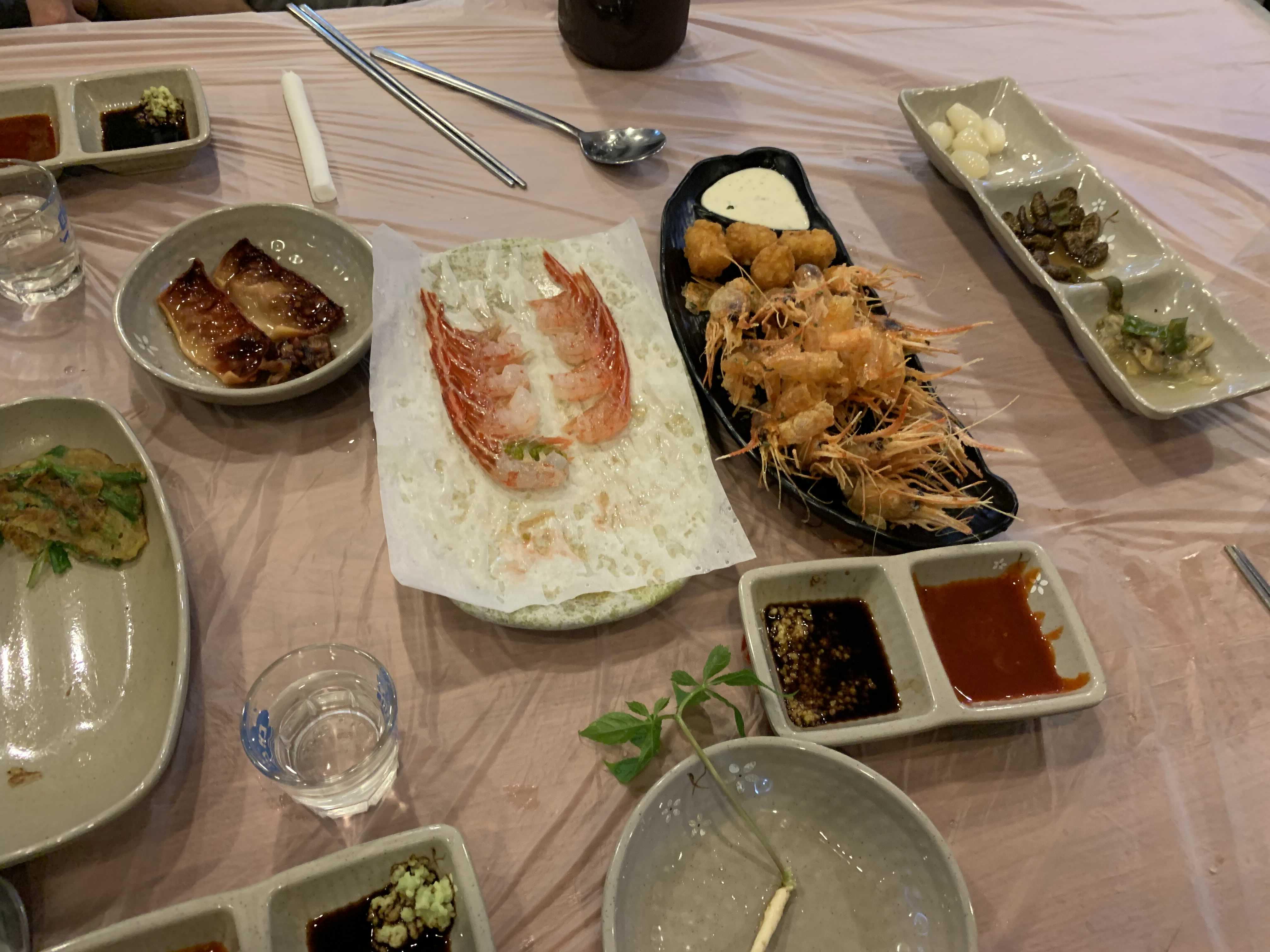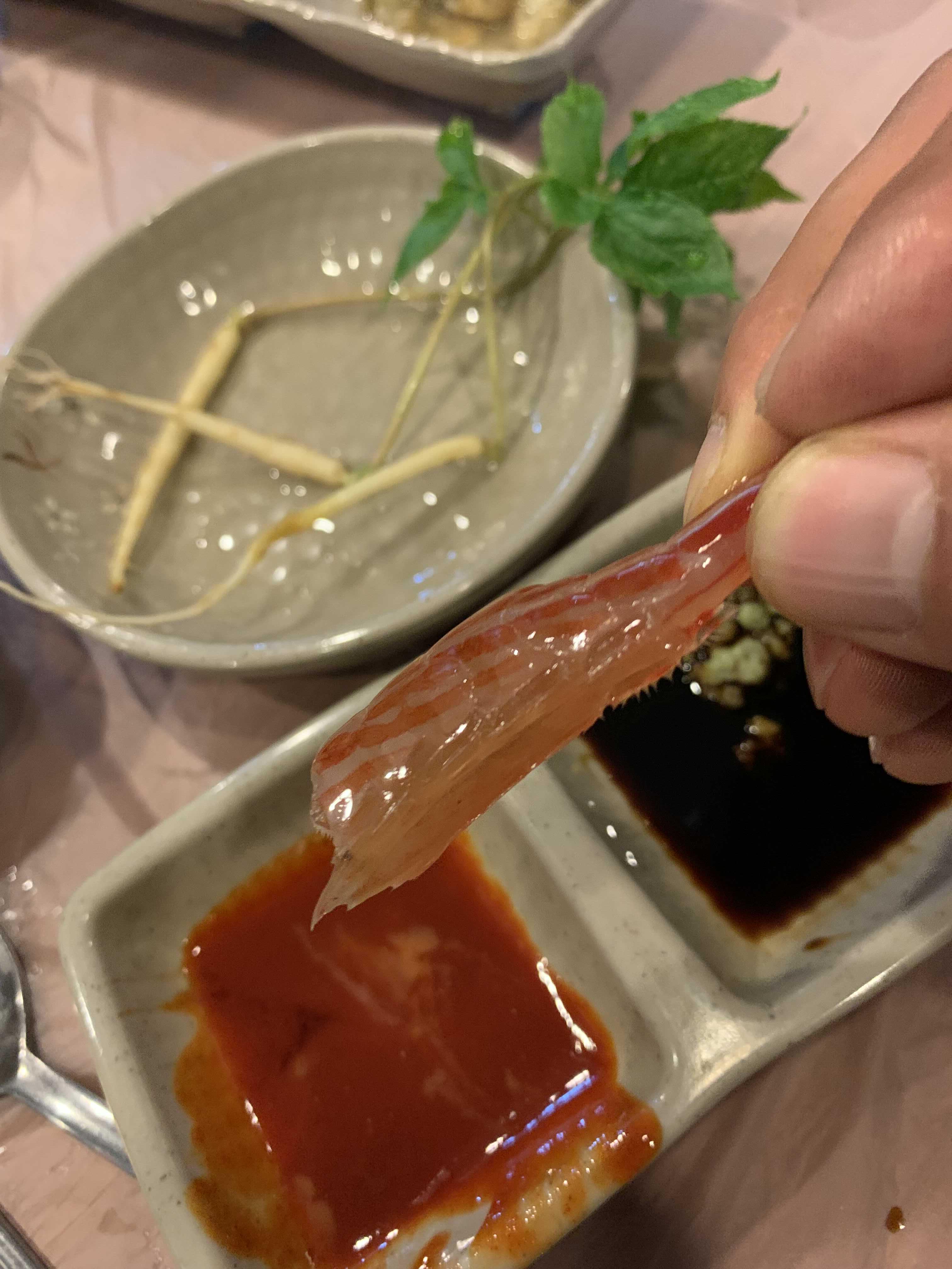 새우 머리만 잘라 그릇에 담으시고, 껍질을 발라 주시더군요. 몇 개의 새우는 새우알이 들어있더군요. 새우는 별다른 소스를 함께 먹지 않아도 단맛이 나더군요. 더욱이 식감이 탱글탱글하여.... 생으로 먹기를 완전 추천드리고 싶습니다. "생" 새우 한 점에 소주 한 병은 마셔도 좋겠더군요.ㅎㅎ