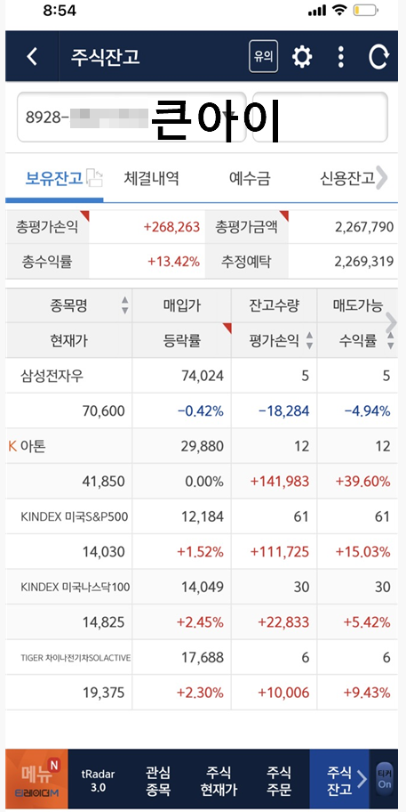 - 삼성전자 : 삼성전자만 마이너스를 기록하고 있습니다. ㅎㅎ 당장 매도할 종목이 아니니 애교로 참아주고 있습니다. 아이들이게 가끔 주식계좌를 보여주는데..... 삼성전자 엄청 싫어하더군요.ㅎㅎ 그래도 존버라는 인내심을 알려주고 있습니다. 삼성전자 우는 목표주가 8만 원 이상 도달하면 매도하고 미국 S&P500 ETF를 매수할 예정입니다.
