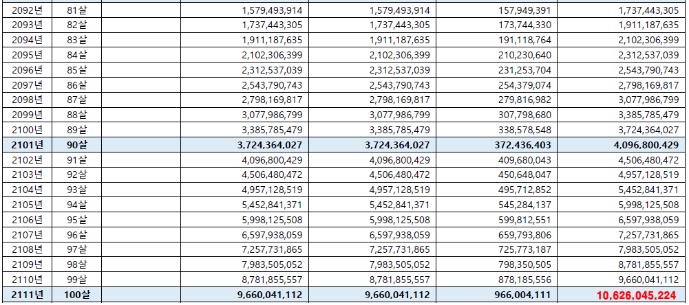 - 자녀의 계좌를 통해 매년 10% 수익을 유지하면 자녀가 100살이 되는 2111년도에는 200만 원이 10,626,045,224원이 되더군요.
