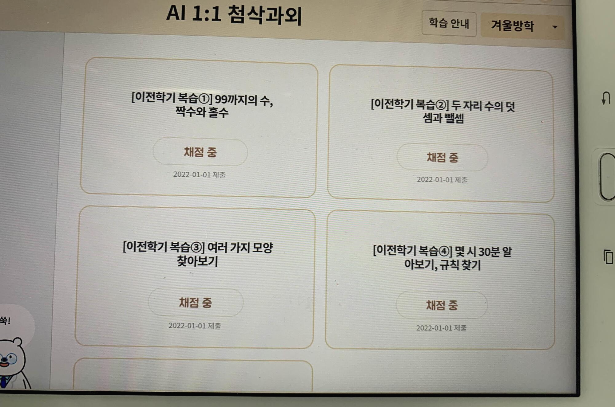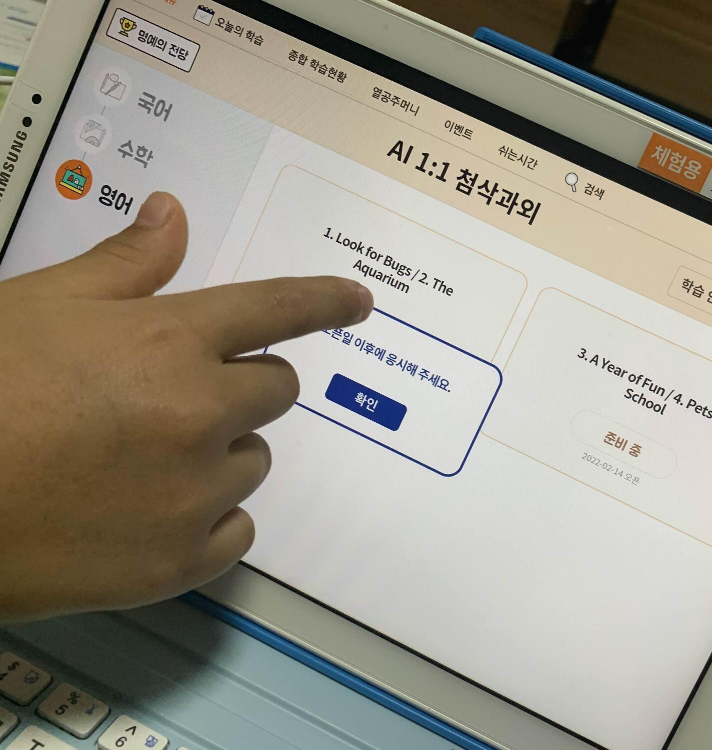 초등학교 교과서를 이용한 콘텐츠... 다양한 콘텐츠가 있더군요. 콘텐츠의 양 보다는 아이들이 이용하기 편하게 재가공은 좀 부족한 느낌이 있더군요. 체험판으로 갤럭시 탭 구형을 지급하는 것보다는.... 어플을 판매하는 방식이 더 좋아 보이기도 하더군요. 애플 패드+펜슬 또는 샤오미 패드+펜슬을 이용하여 학습하는 방식이.. 더 좋을 듯싶은 제품이더군요.