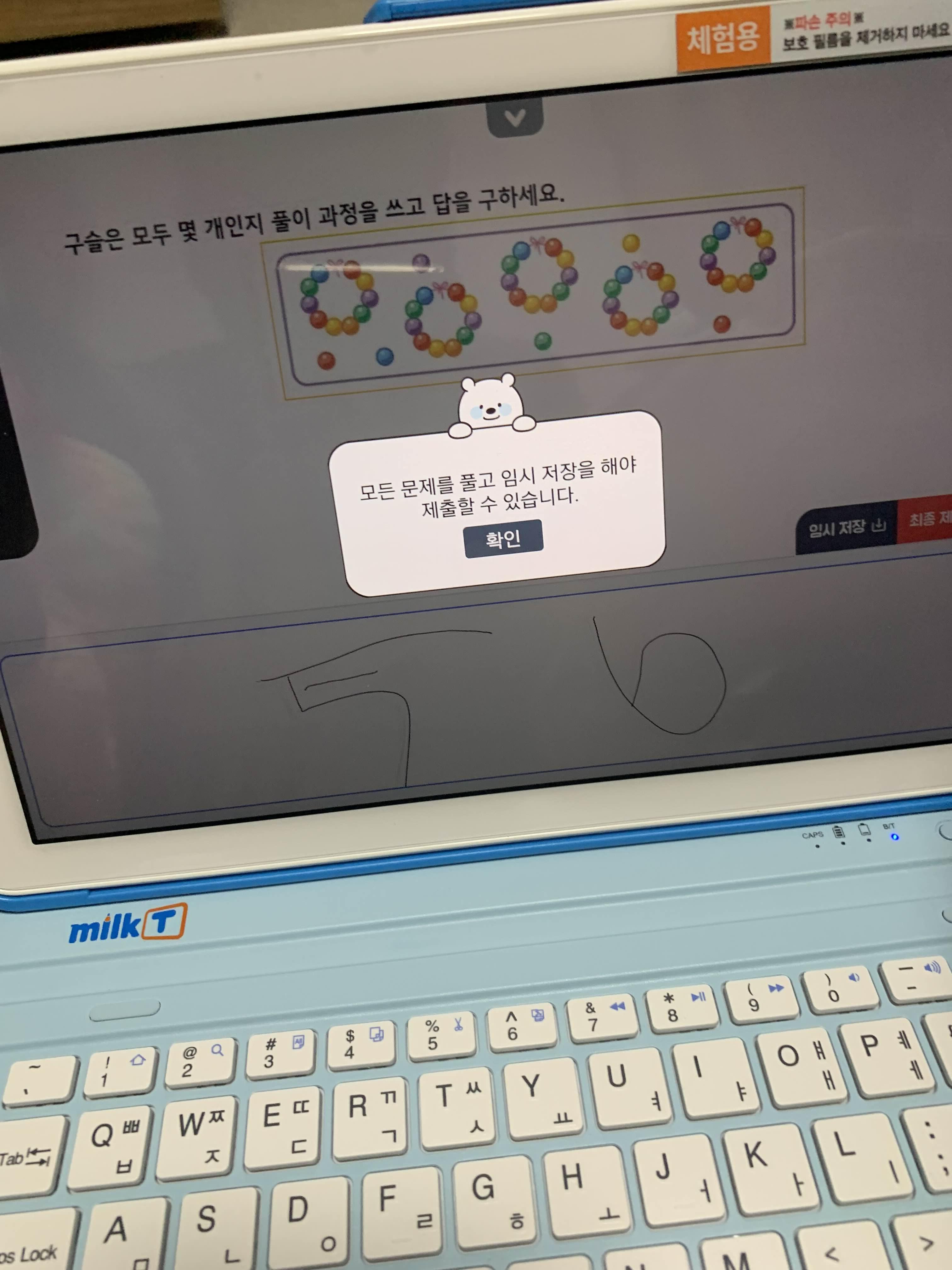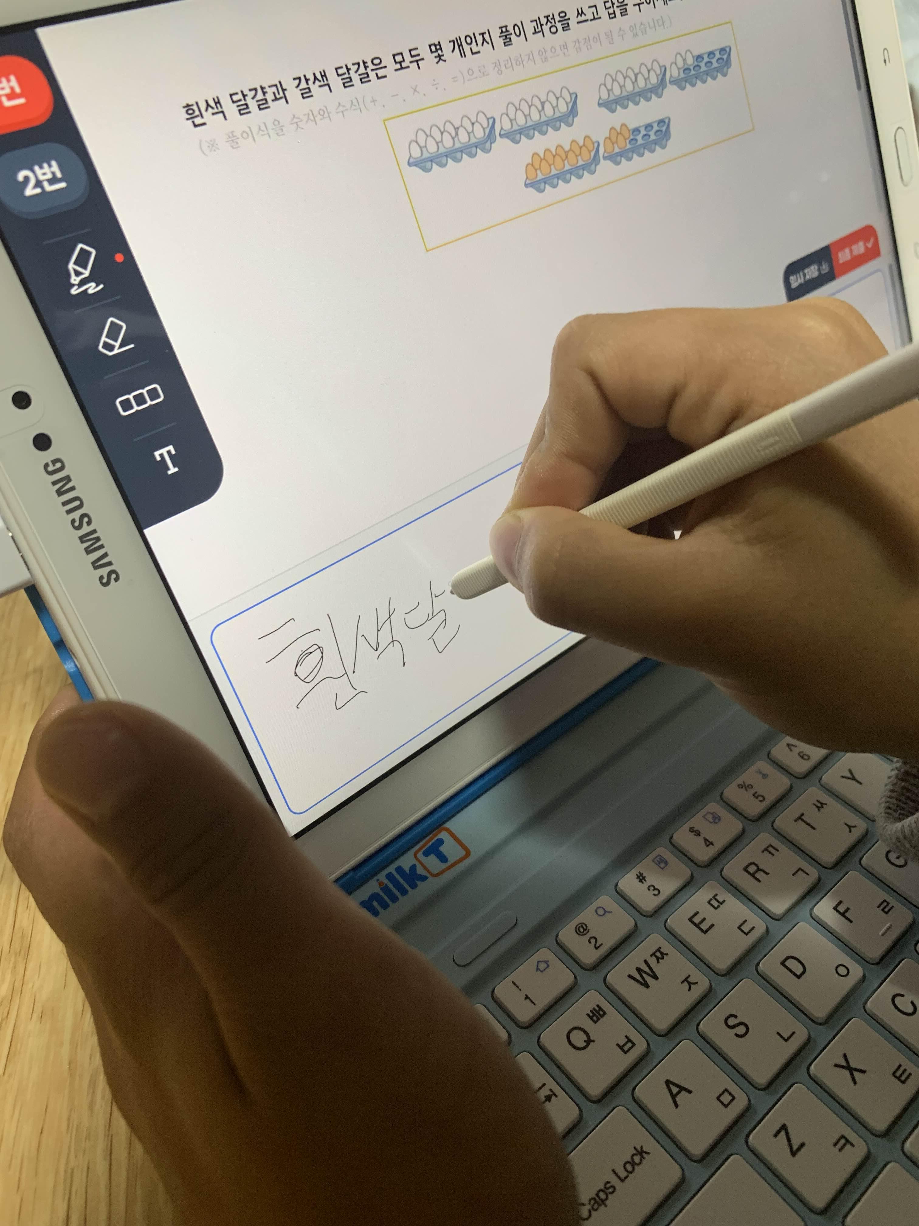 학습용 펜을 별도 제품을 이용하면 더 좋겠다는 생각이 들더군요. 풀이과정과 답을 쓰려면, 기본으로 제공된 펜을 이용하여 아이들이 작성하기란 상당히 불편하더군요. 갤럭시탭에 붙어있는 키보드... 이 키보드로 풀이 과정을 작성하라는 의도 같은데....ㅎㅎㅎ 아이들이 키보드로 풀이과정을 작성하기에는 5~6학년 고학년이면 몰라도 초1 학생이 키보드로 풀이과정 작성하기란,ㅋㅋㅋ