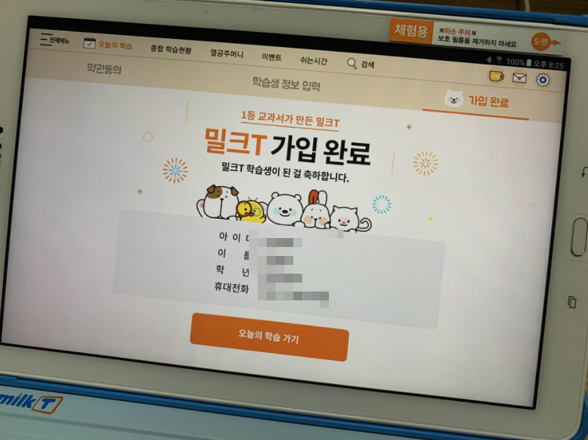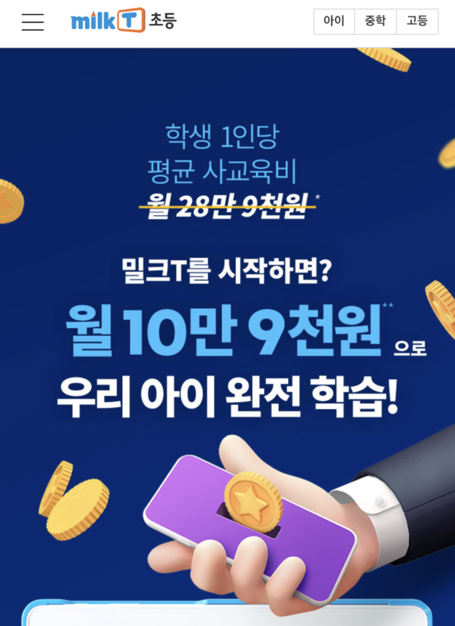 체험을 신청하며... 밀크 T 가격을 얼마일지 찾아보니 10.9만 원/월이더군요. 11만 원 상당하는 비용을 매달 납부하며 이용하기에는 상당히 비용 부담을 크게 느껴지더군요. 1인당 평균 사교육비가 28.9만 원이라 하는데.... 이 28.9만 원 절감되어 10.9만 원으로 내려간다는 생각보다는, 10.9만 원 추가되는 느낌이 드는 건.... 저만 그렇게 생각이 드는 걸까요?ㅎㅎ