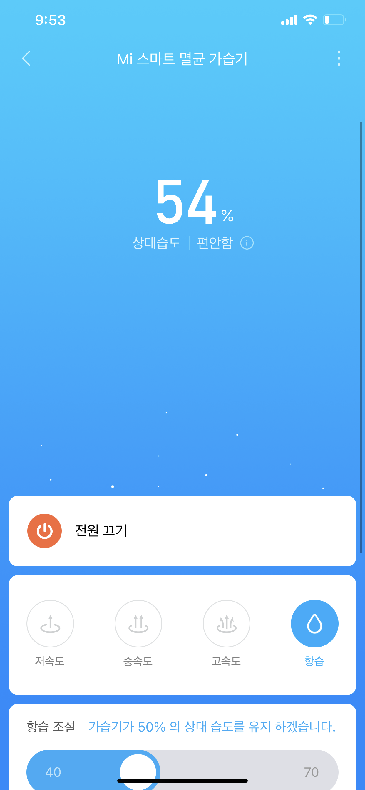 가습기의 3단 모드(저속도, 중속도, 고속도)로 작동이 가능합니다. 단순한 이 3가지 모드를 사용하기 위해서 샤오미 제품을 구입하지 않았습니다. 샤오미 제품을 구입하게 된 이유는 바로, "항습" 메뉴를 이용하여 상대습도를 설정해 주면 자동으로 작동이 가능합니다.