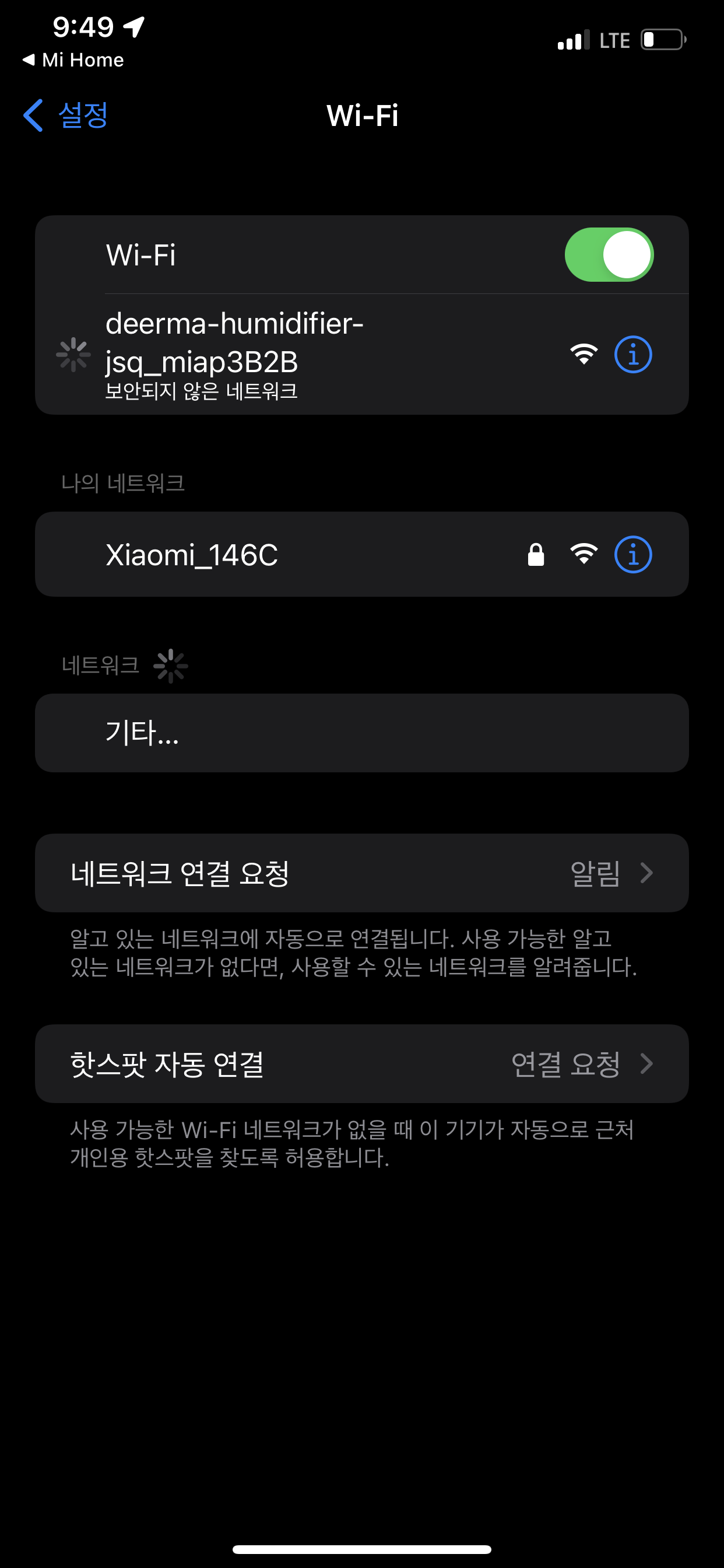 가습기 뒷부분의 와이파이 버튼을 눌러주면, 핸드폰의 와이파이 접속메뉴에 들어가면, 가습기 와이파이가 보입니다. 그 버튼을 눌러주면, 자동으로 미혼에서 연동을 시작합니다.