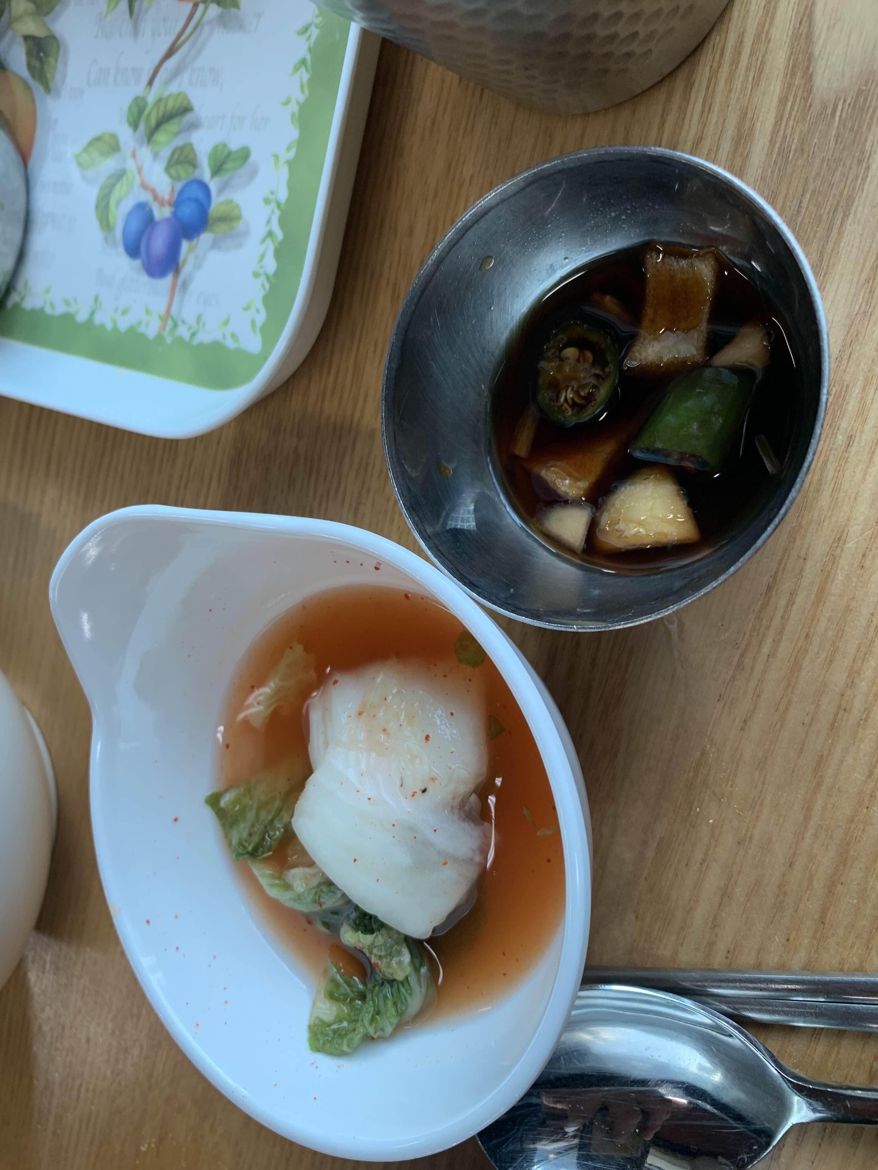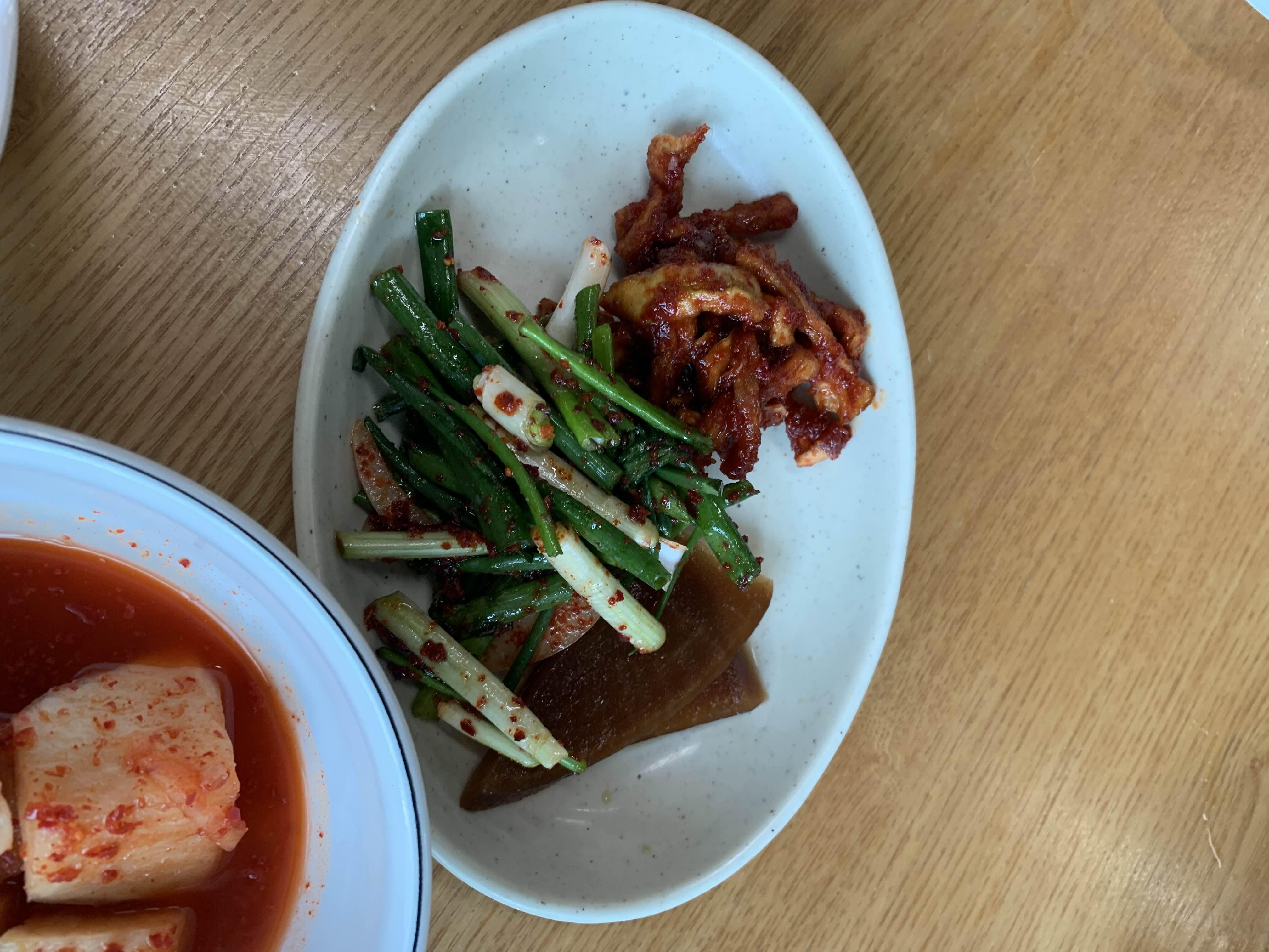 곰탕 가격을 보고 놀랐지만, 식당 내외부의 모습은 단숨에 맛집이라는 느낌이 풀풀 풍겼습니다. 곰탕을 주문하고 잠시 기다리니, 다른 곰탕 전문점과 다른 밑반찬이 나오더군요. 우선 물김치와 무절임과 쪽파 무침 그리고 무 간장 조림이 나왔습니다.