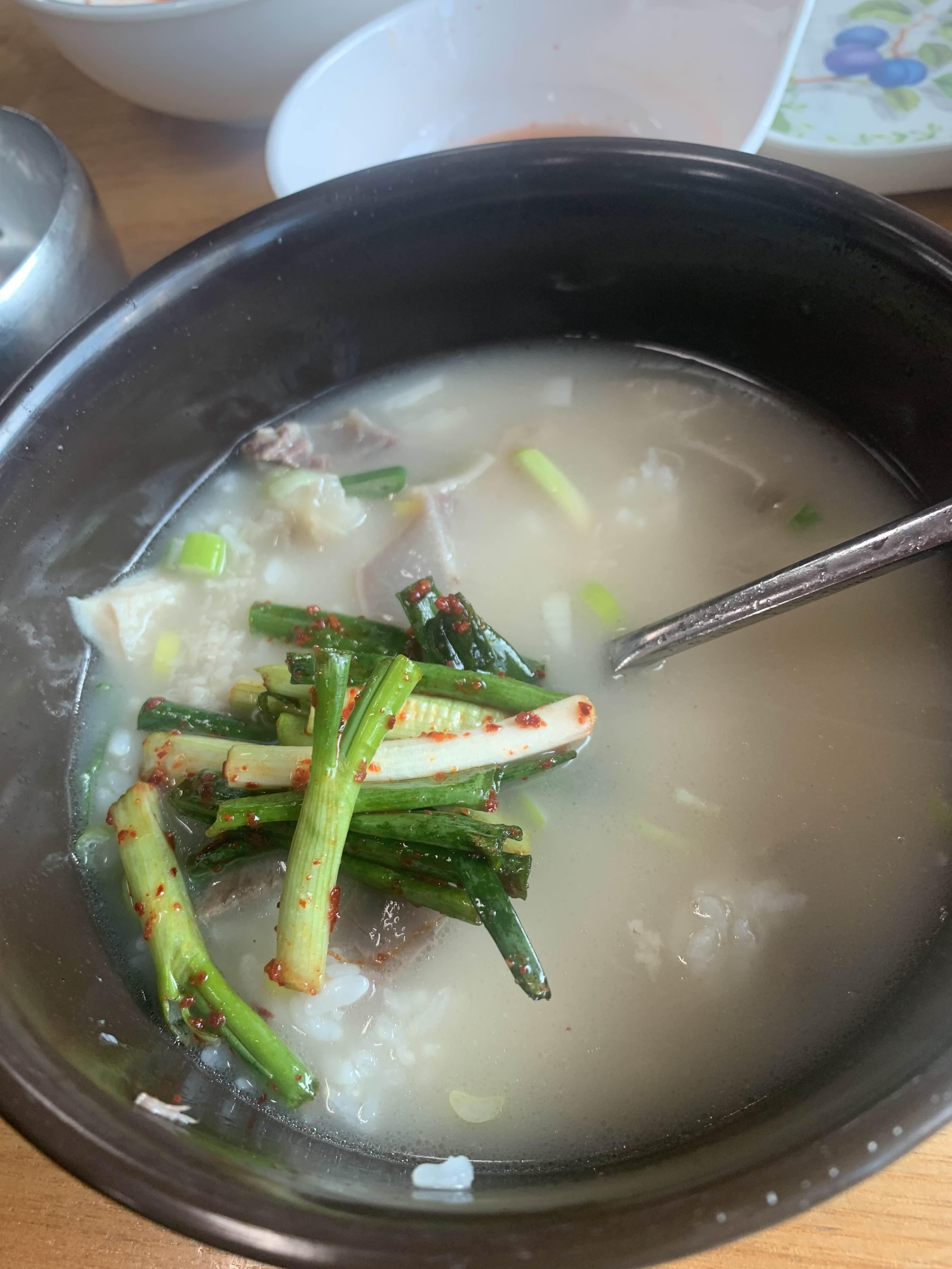 그리고 기다리고 기다리던 13,000원 곰탕이 나왔습니다. 곰탕 뚝배기는 맨손으로 잡고 먹어도 될 정도로 뜨겁지는 않았습니다. 곰탕을 콩나물국밥에서 하는 토렴? 방식으로 만드는 방식으로 보이더군요. 밥은 별도로 나오지만^^ 국밥은 소박한 뚝배기에 대파가 올려져 있는 하얀 국물의 비주얼이었습니다.
