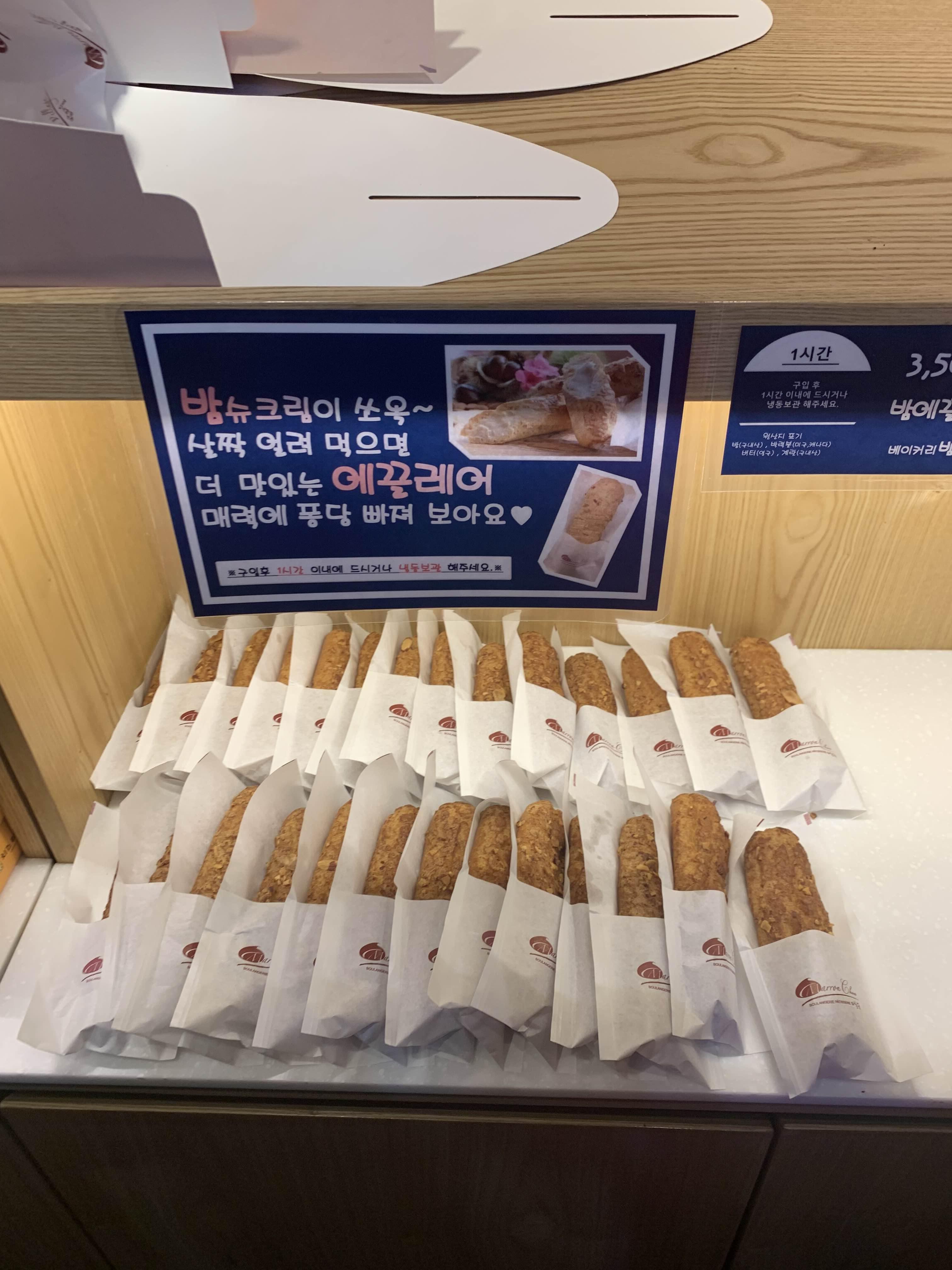 방문하여 빵을 스캔하는데.... 많은 빵이 준비되지 않고, 밤을 특화한 4개? 종류의 빵만 준비되어 있더군요. 이미 식사를 마친 상태라... 후식으로 밤 팡도르 6,800원 하나와 밤 에끌레어 3,500원 하나씩 주문해 보았습니다.