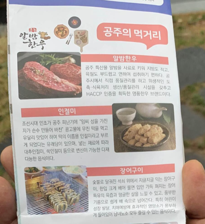 공주에는 인절미가 유명합니다. 공주에서 인절미 축제를 진행할 정도로 공주는 인절미가 유명합니다. 인절미의 유래를 찾아보면 인조가 이괄의 난으로 공산성으로 피난 시 농부가 떡을 바쳤는데, 그 떡이 인절미라고 했다고 합니다. 사실인지 아닌지는 모르겠지만, 이 "썰"을 인용하여 공주에서 인절미를 태마로 축제도 진행하더군요.ㅎㅎ
