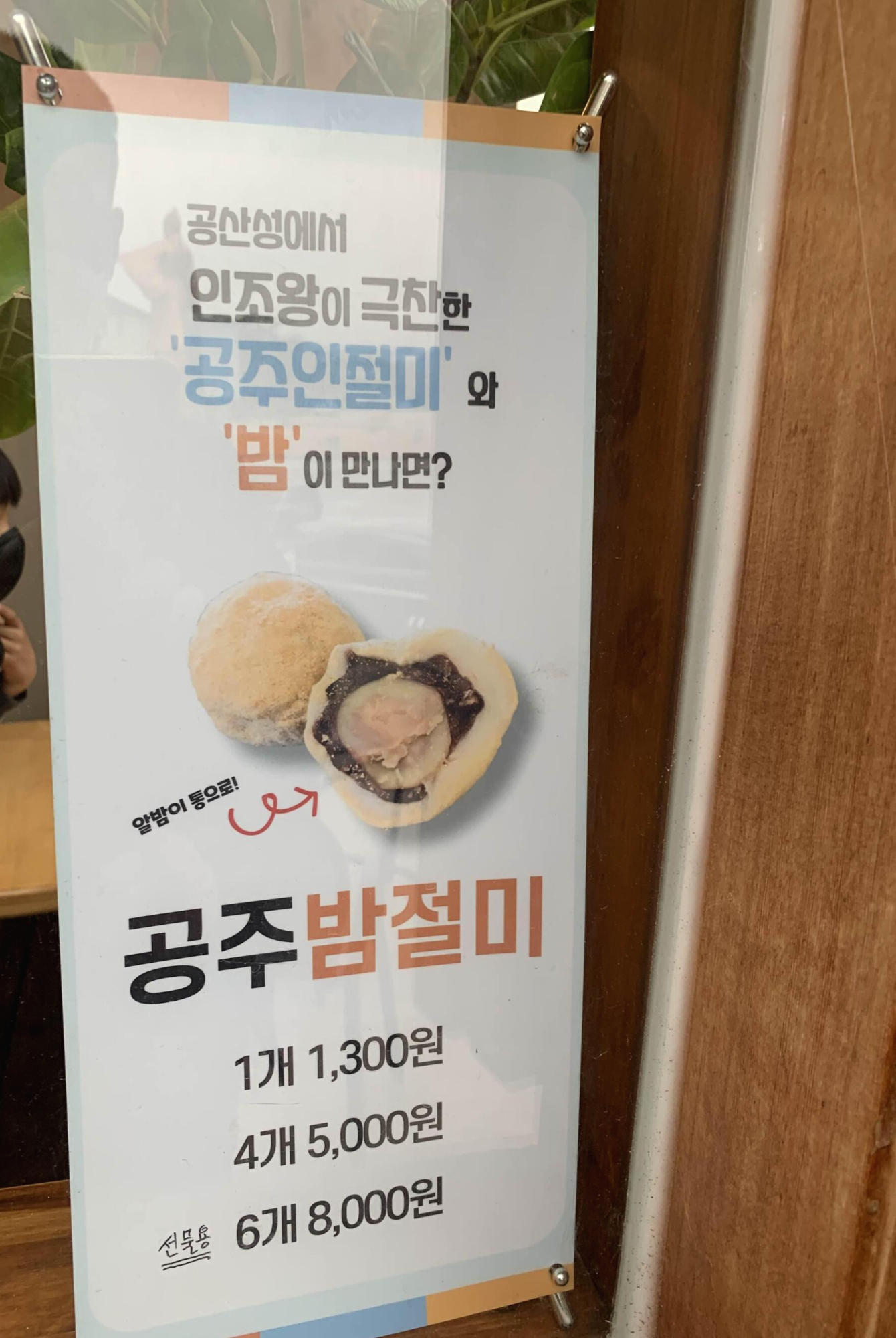 공주의 인절미! 특산물 밤을 이용한 밤 절미! 가격은 좀 비싸게 느껴지지만, 공주 여행에서 꼭 맛보아야 할 음식이라 생각됩니다. 나중에 공주 여행 시 포장하고 싶은 음식이라 생각됩니다.