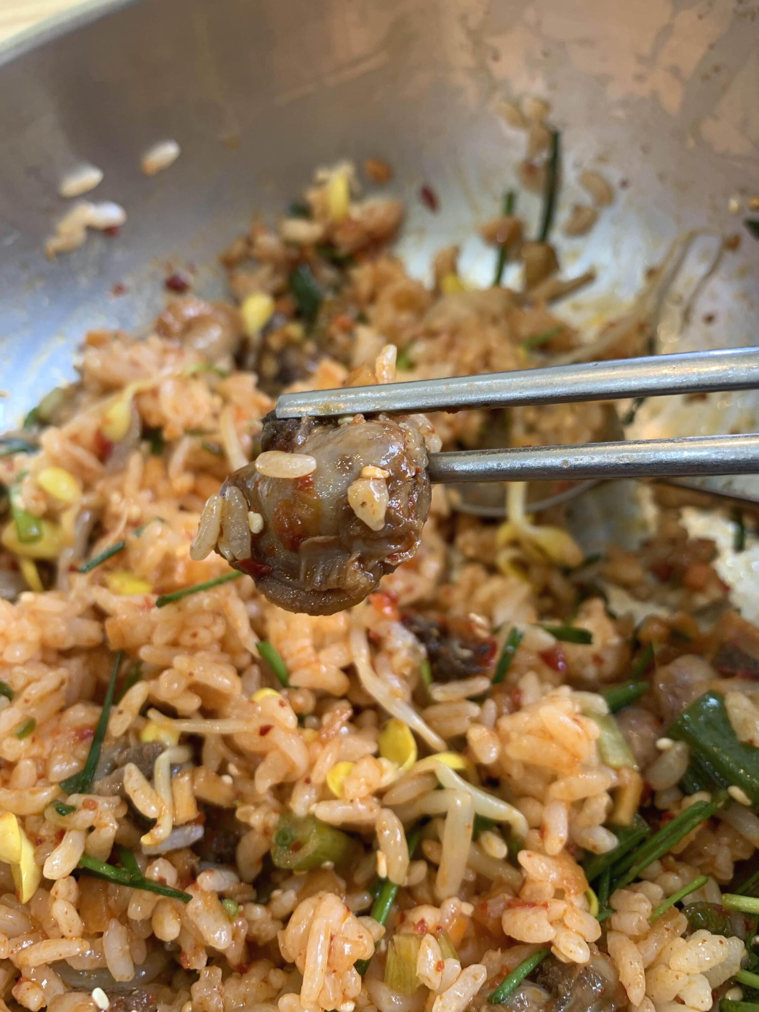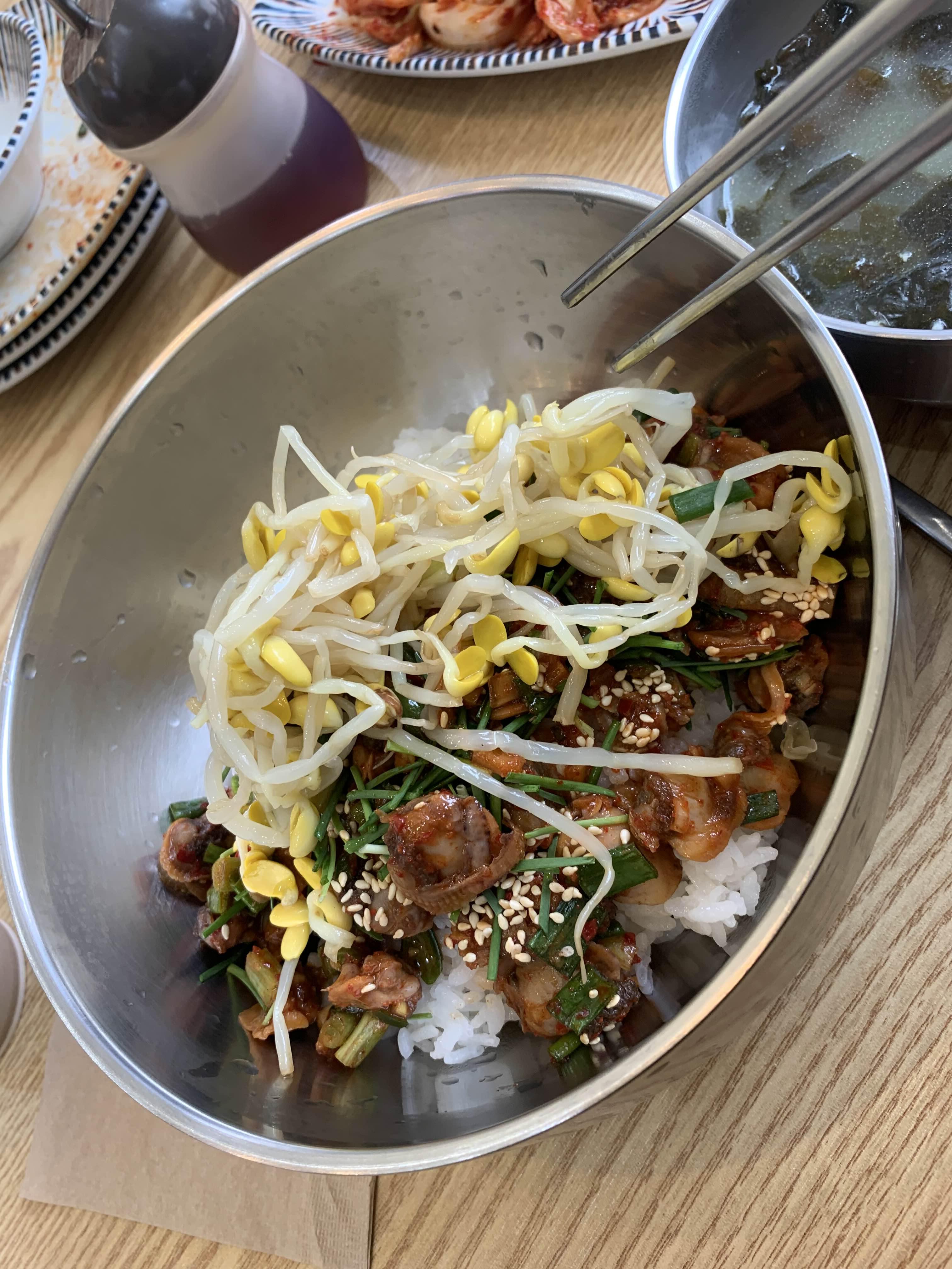 꼬막 알맹이는 그리 큰 알맹이는 아니지만, 비밥 밥에 들어가 있어 밥과 함께 먹기 적당한 사이즈이더군요. 더욱이 꼬막 양념장이 좀 많아 짜겠다는 생각이 들었는데 콩나물을 함께 비벼서 그런지 짜지 않고 싶으면 십을수록 달달함이 올라오더군요. 평소 좋아하는 오징어젓갈!!! 비빔밥에 젓갈 하나 올려서 꿀꺽하니 맛이 기막히더군요.ㅎㅎ