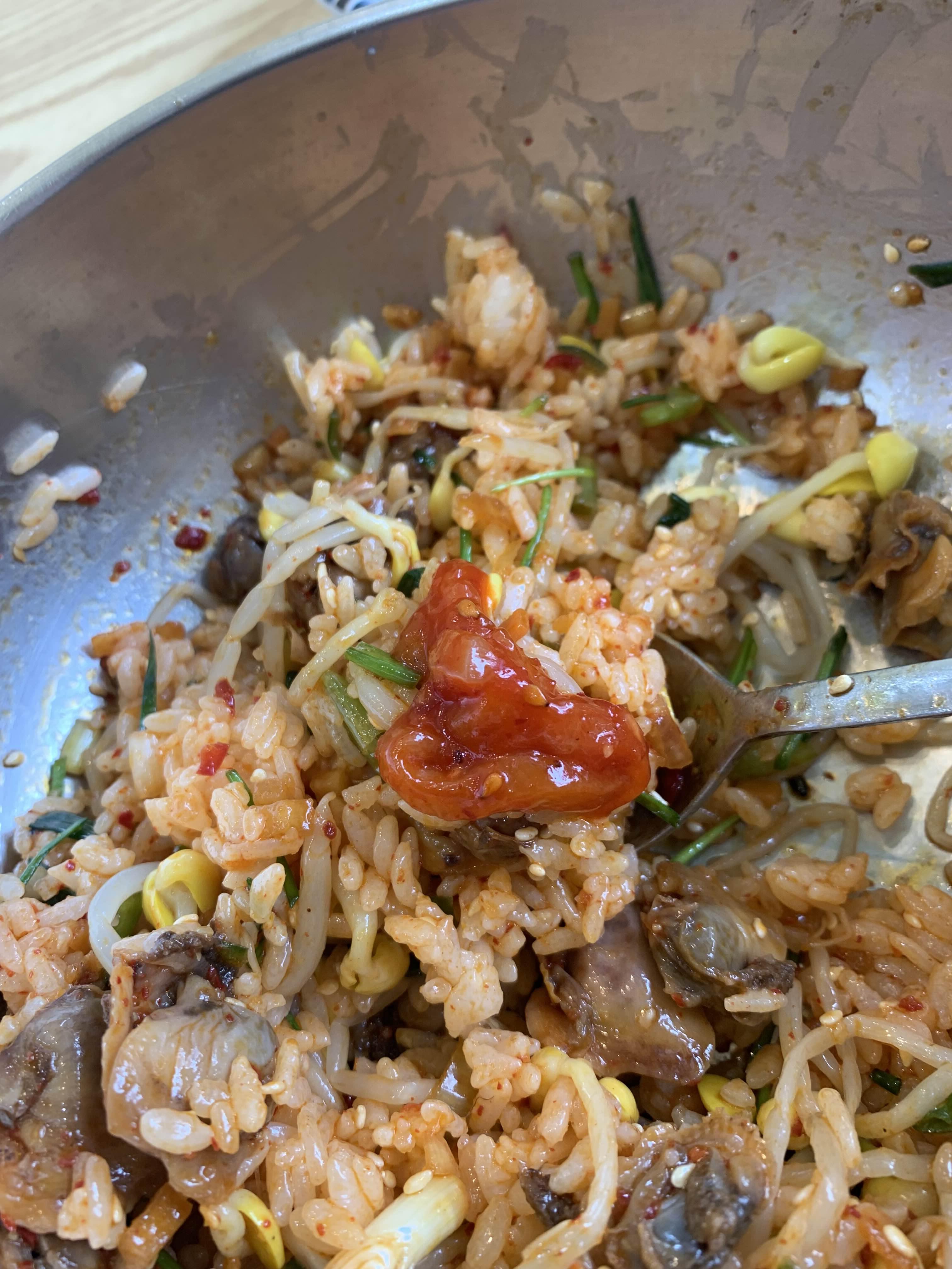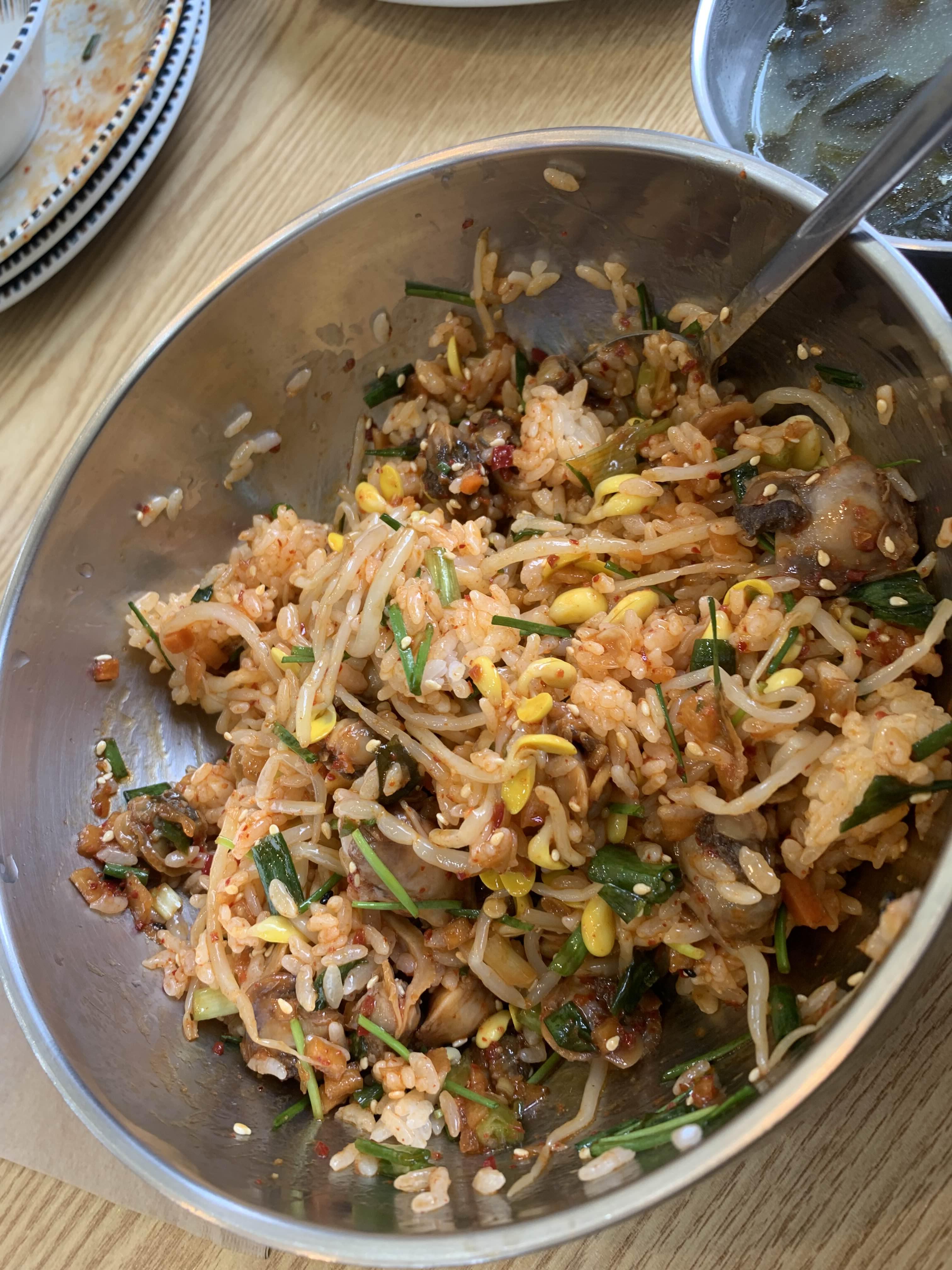 접시에 나온 꼬막을 모두 넣어주고, 밑반찬으로 나온 콩나물도 듬뿍 넣어 비벼주었습니다. 그리고 쓱쓱 싹싹 비벼주기~~~
