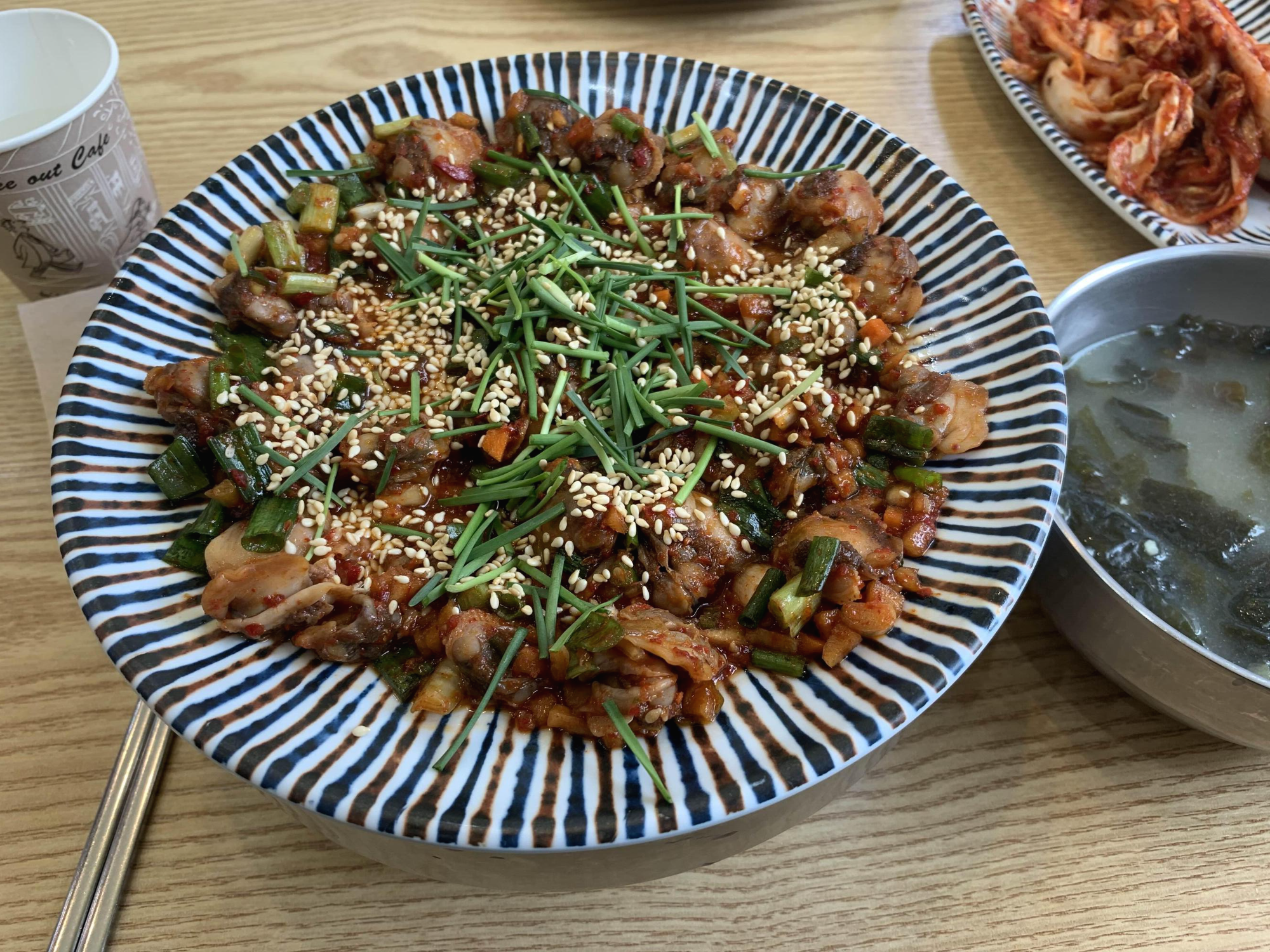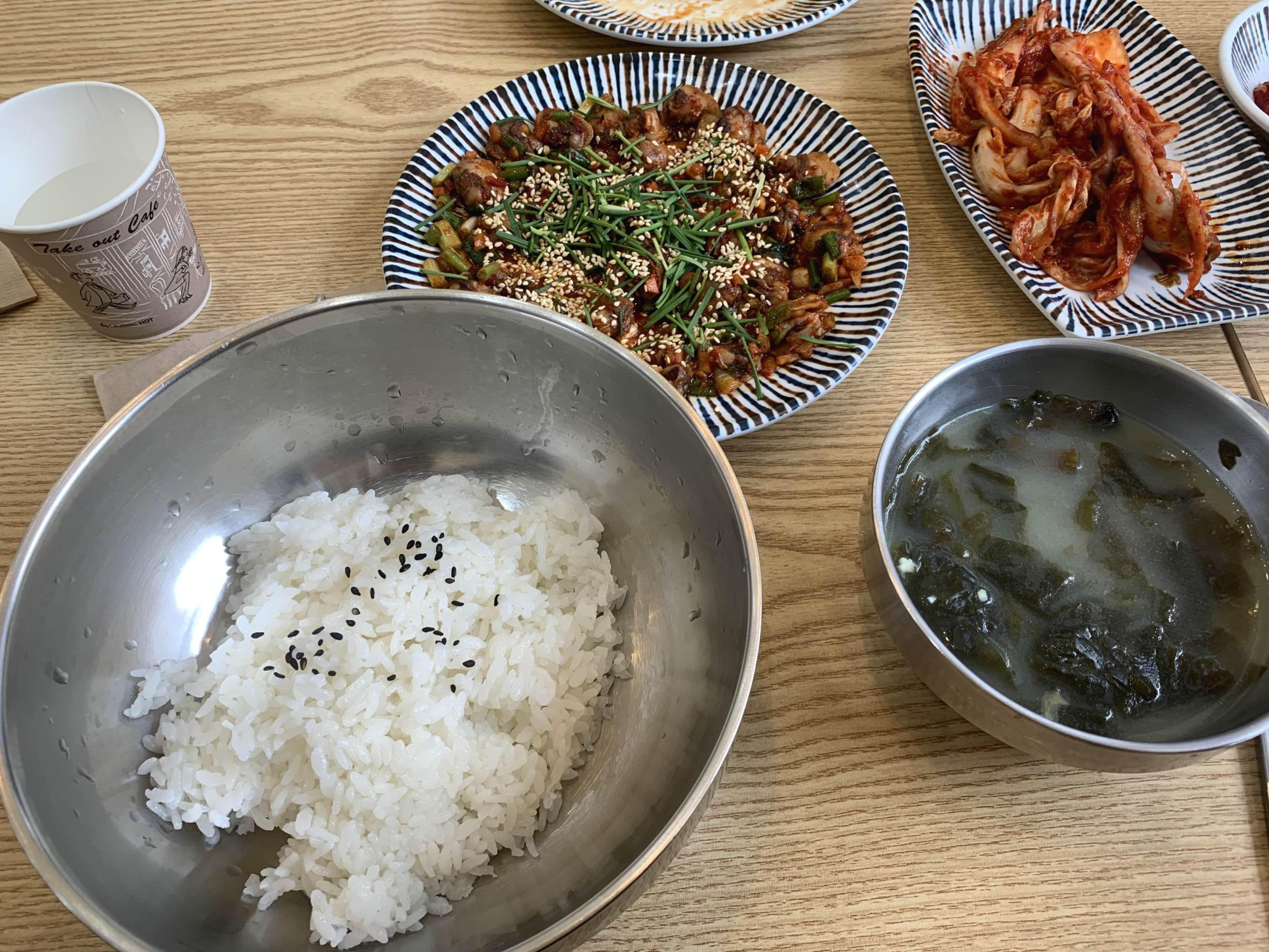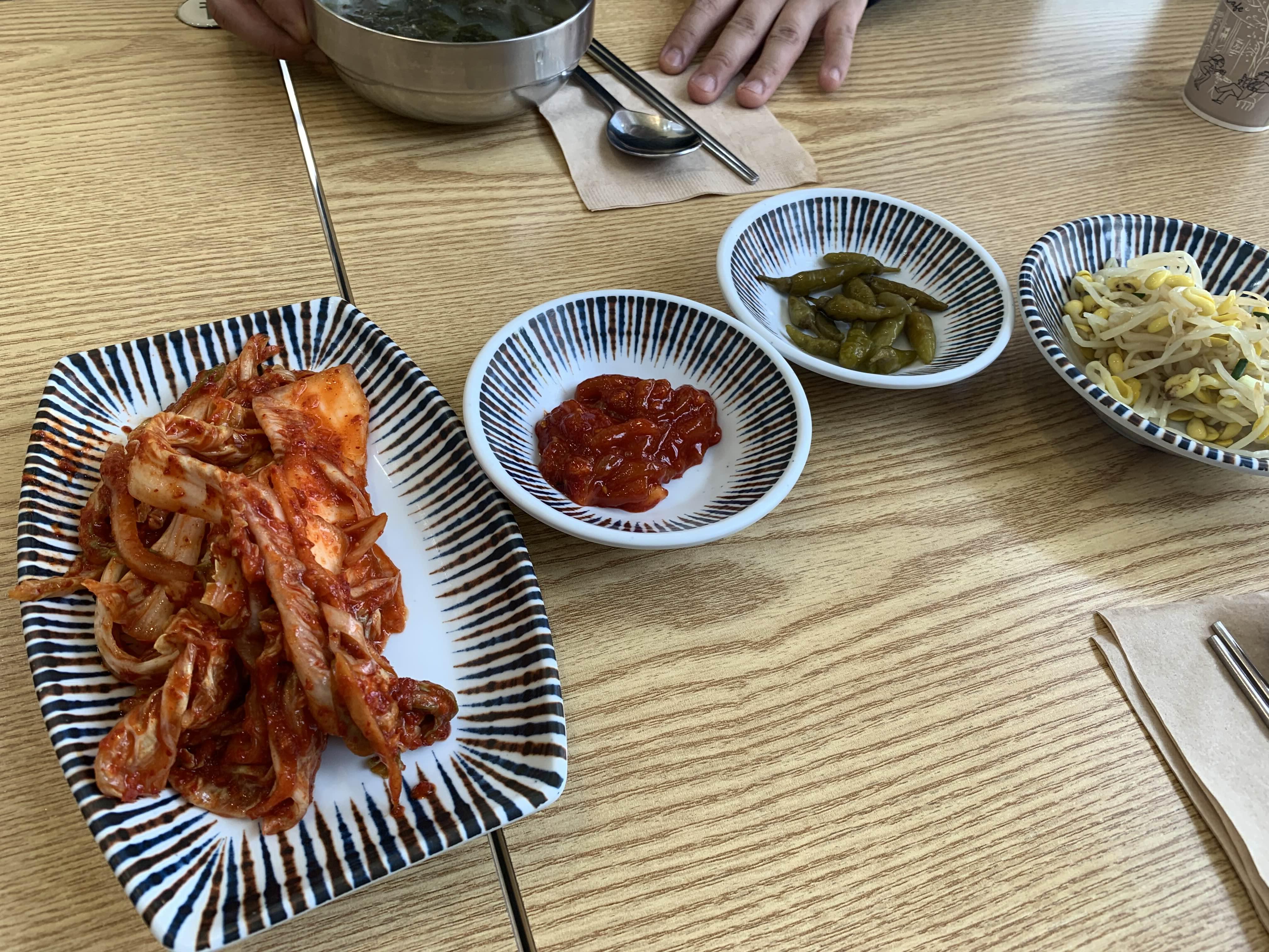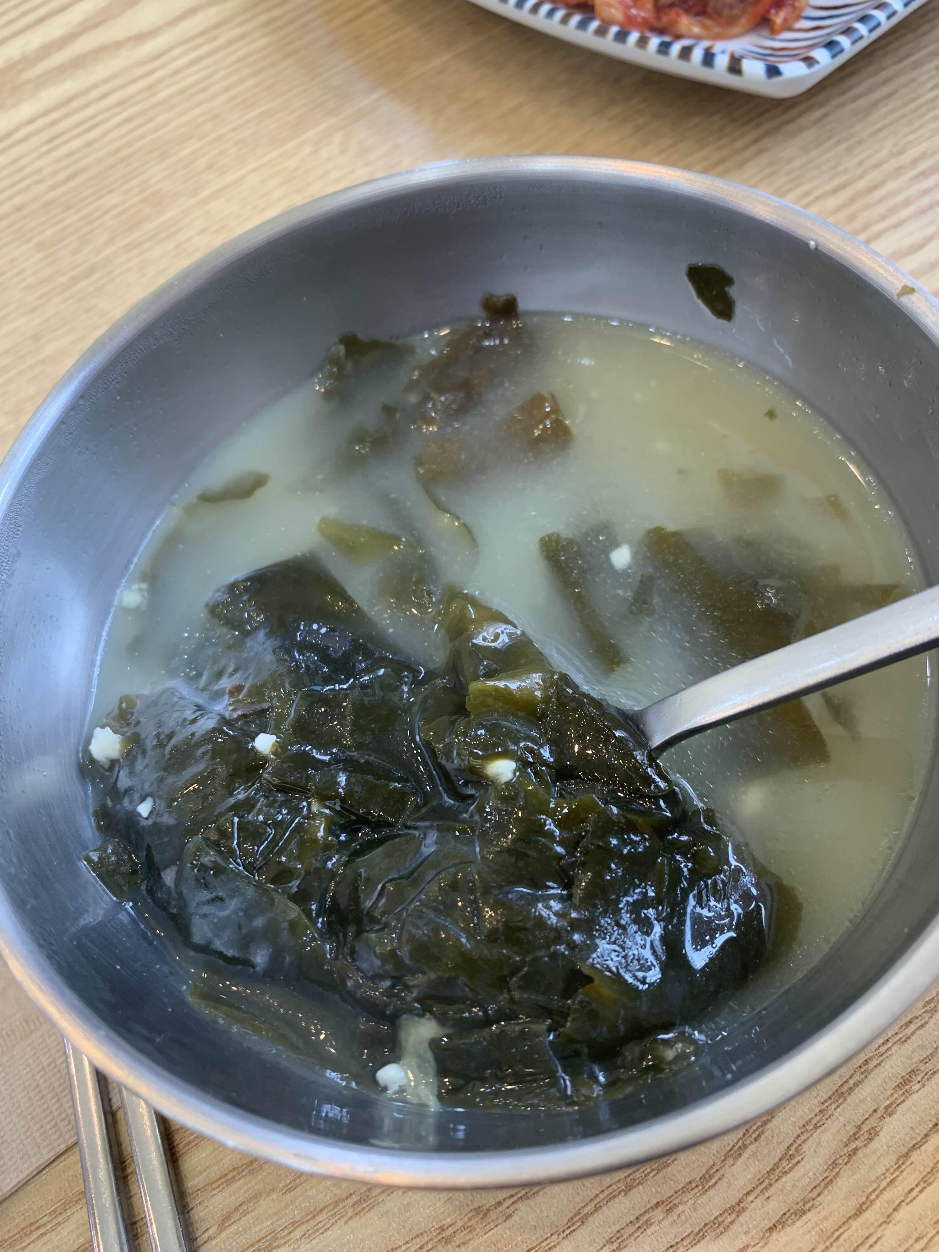 테이블에 앉아서 잠시 기다리니 밑반찬으로 배추김치, 콩나물, 오징어젓갈, 고추장아찌? 가 나오더군요. 그리고, 식사와 함께 미역국과 꼬막비빔밥이 나오더군요. 꼬막 비빔밥은 밥에 꼬막이 넣어진 상태가 아닌, 반찬 비슷하게 꼬막이 접시에 분리해 나오더군요.
