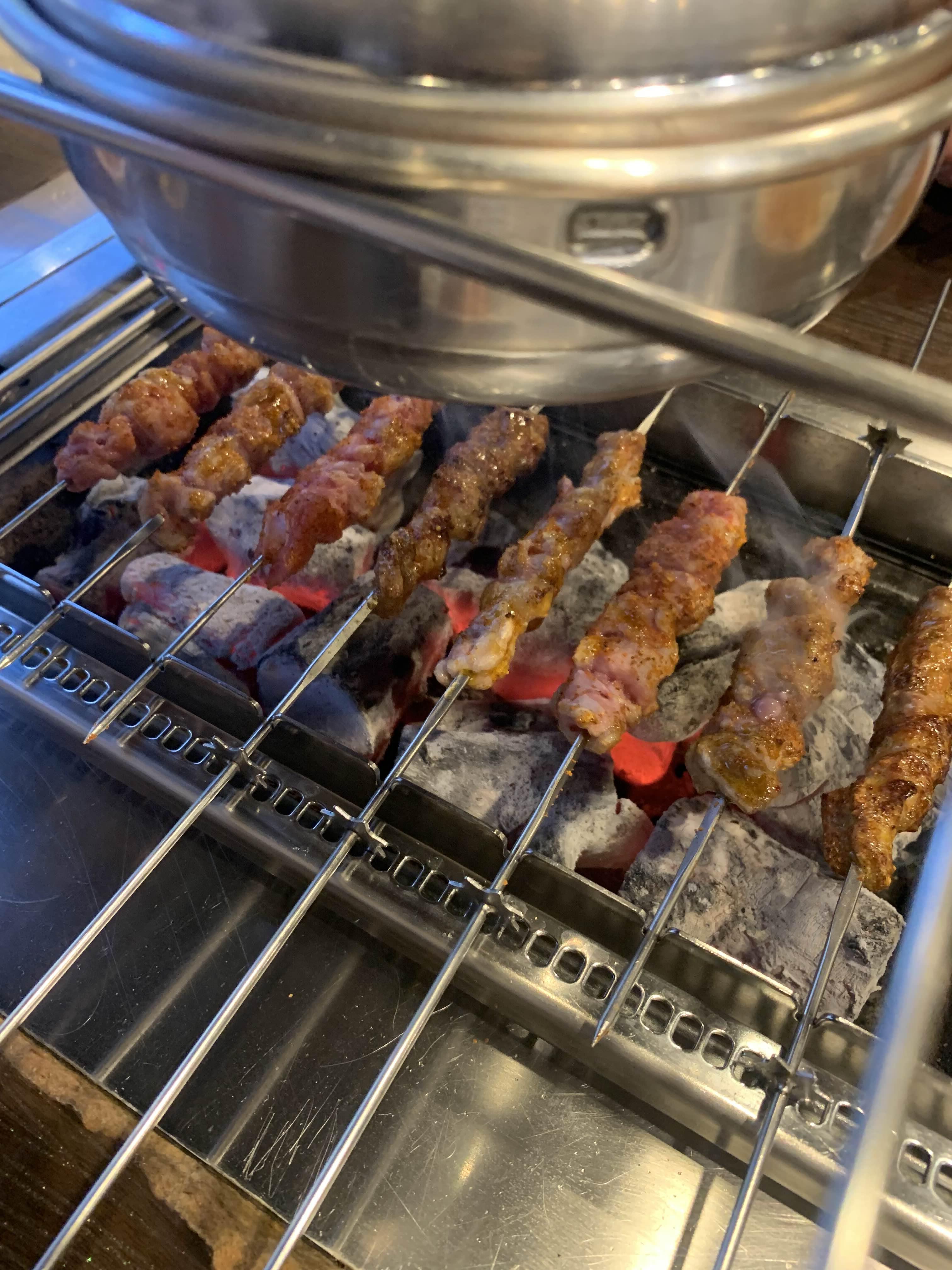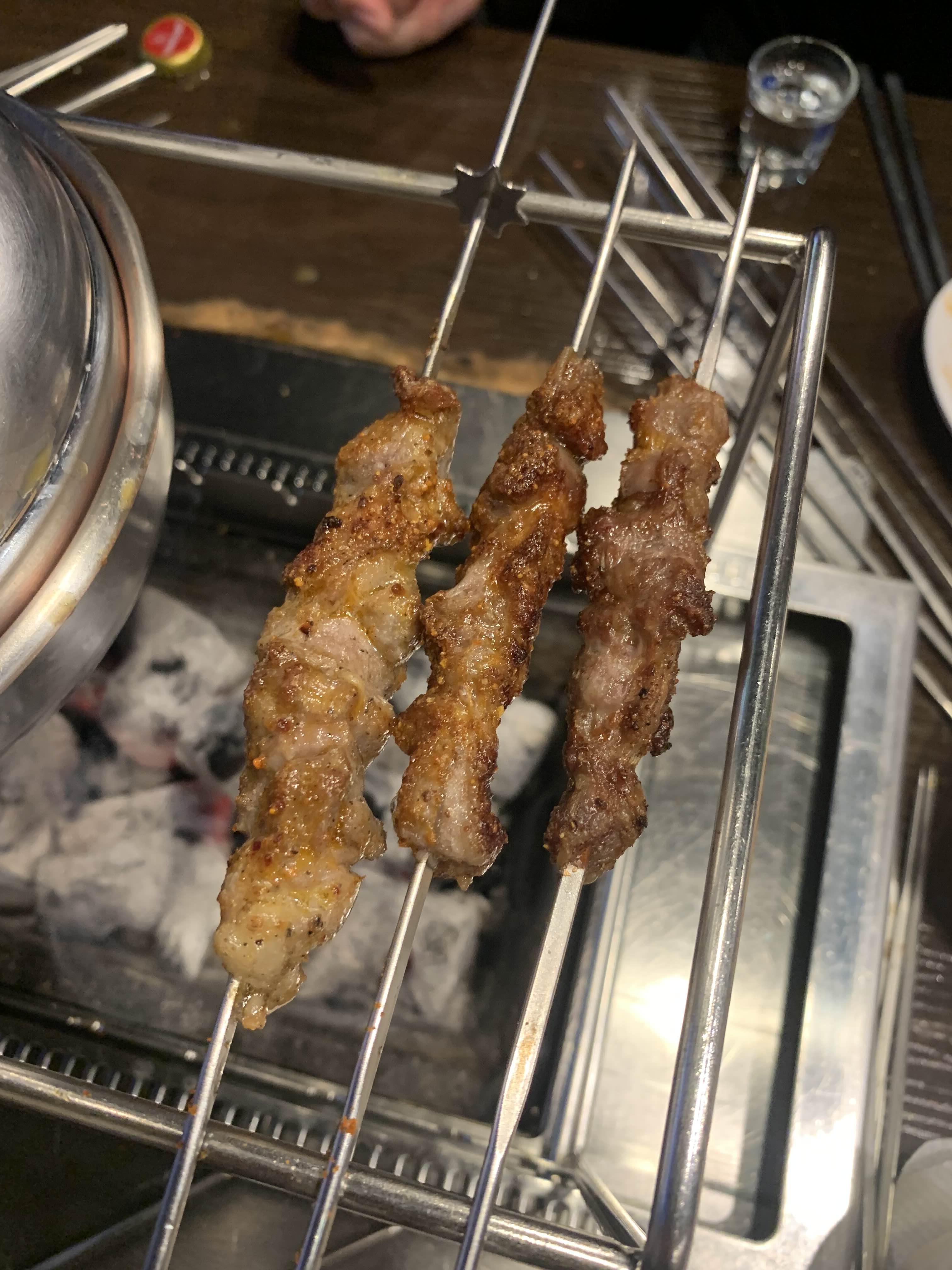 다음으로 주문한 양꼬치!!! 양갈비살 꼬치보다 크기가 크더군요. 상대적으로 1.5배 정도로 느껴지더군요. 구워서 맛보니.... 양갈비살에 비해 식감이 물컹 거리더군요. 아래 사진은 양꼬치와 양갈비살의 크기 차이!!