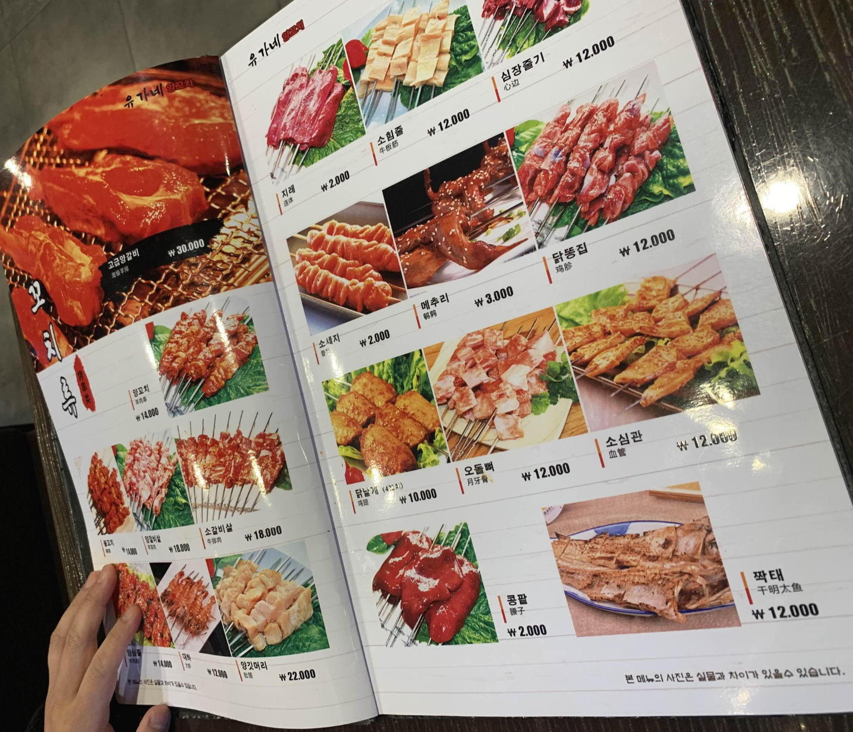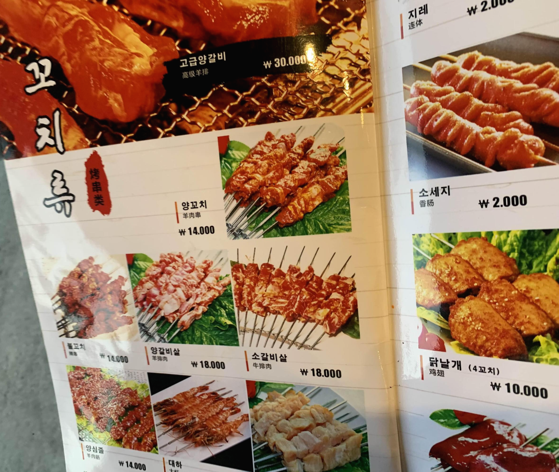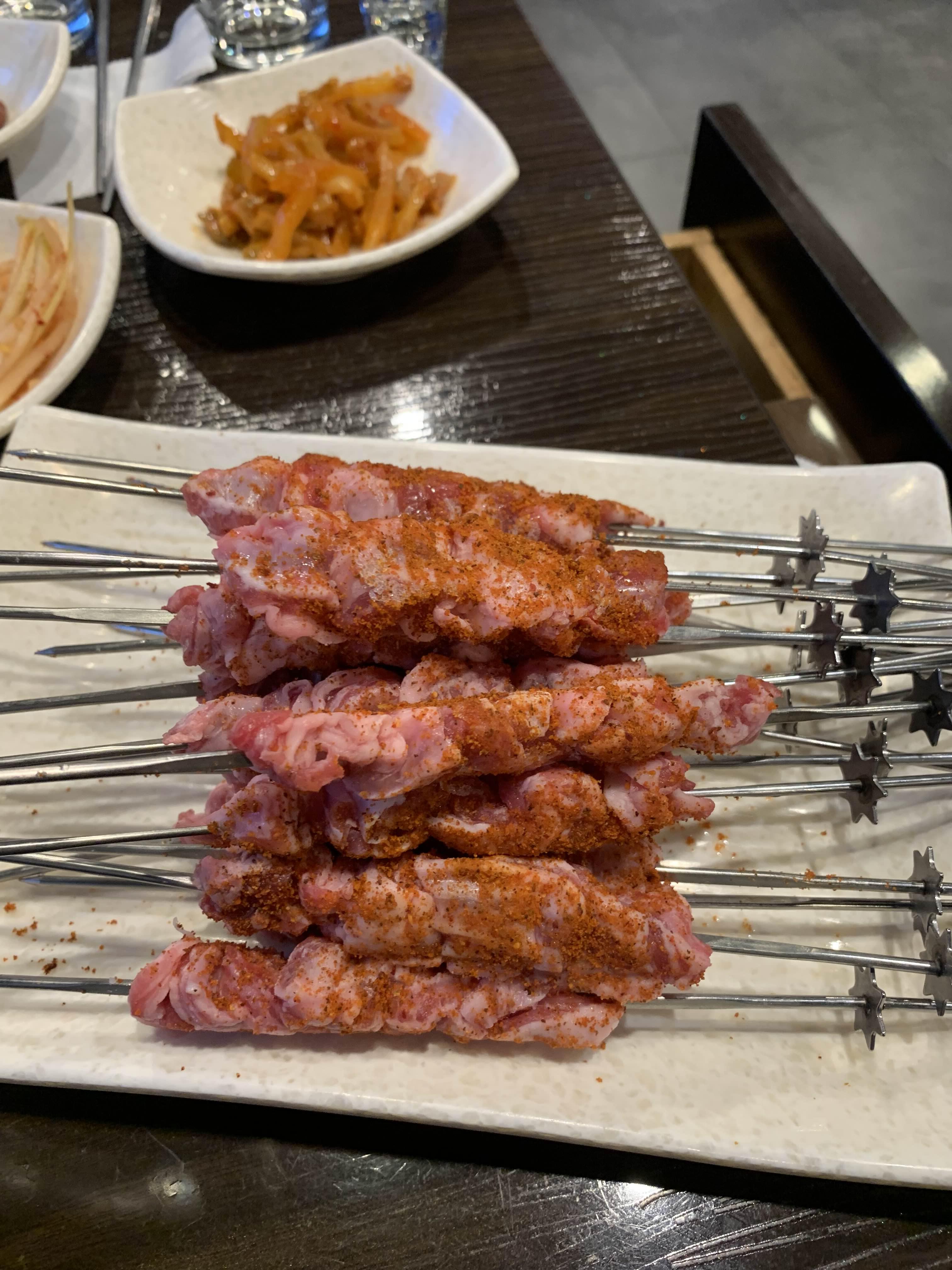 메뉴판을 보고서..... 무수히 많은 메뉴에 뭘 주문할지 고민하다, 양꼬치 전문점이라 양갈비살 꼬치를 주문했습니다. 메뉴판 이미지의 양꼬치는 양념 양꼬치로 보이는데, 양념이 아닌 일반 향신료만 뿌려진 양꼬치입니다. 메뉴판 이미지는 불고기 양념 느낌이라...ㅎㅎ 양념 없는 양갈비살 꼬치를 먹고, 양념 있는 양꼬치를 먹어야겠다는 생각으로 양갈비살을 먼저 주문하게 되었네요.