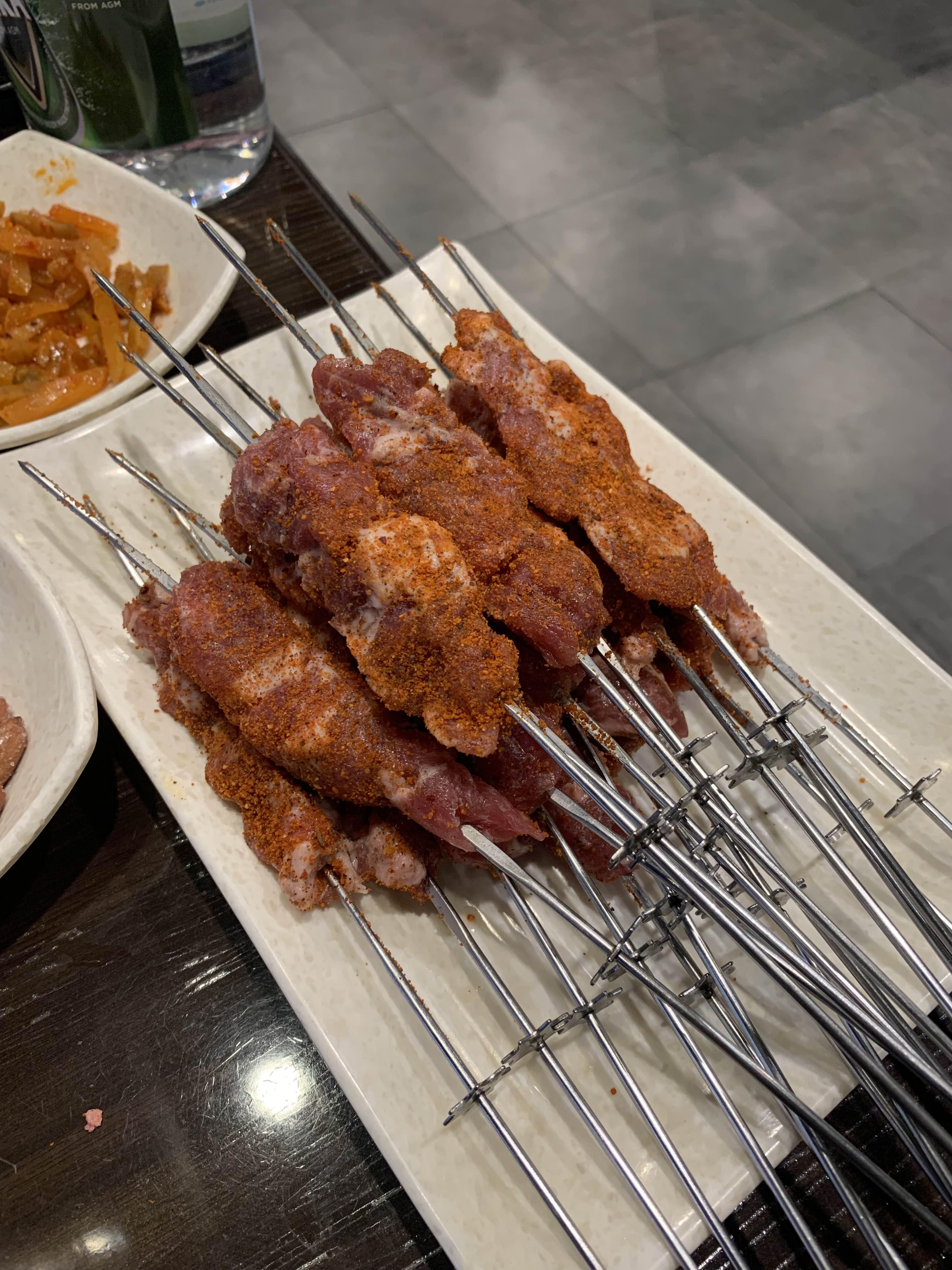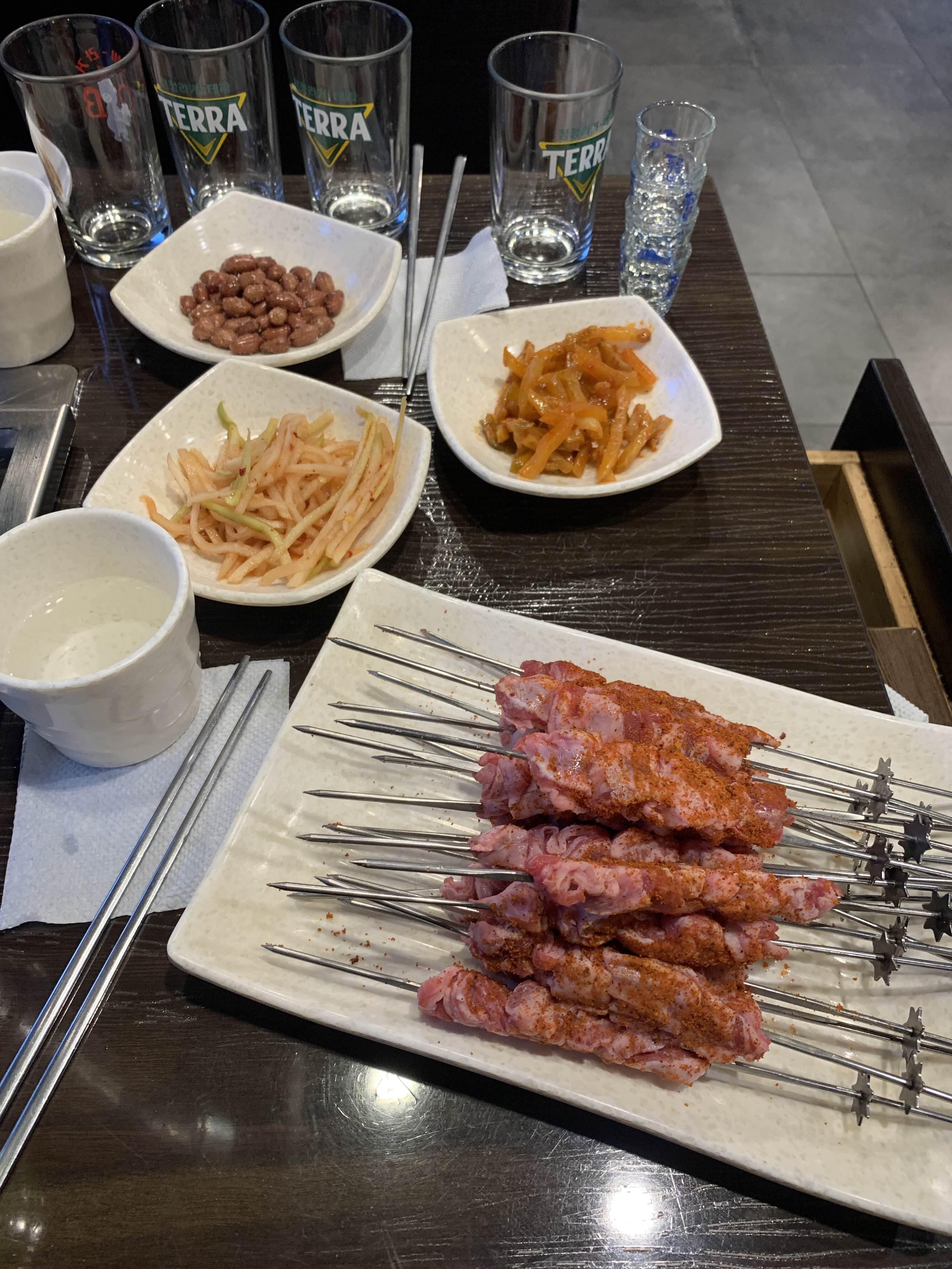 주문한 양갈비살 꼬치가 나오고 주문했던 음료? 연태고량주도 나왔네요. 일반적으로 막걸리를 즐겨먹는 나로서.... 중국 연태고량주는 감당하기 힘들 술이긴 합니다. 한편으로 도수가 높은 중국술이 먹고 난 후 다음날 속이 편한 느낌이 있어서 좋기는 하더군요. ㅎㅎ