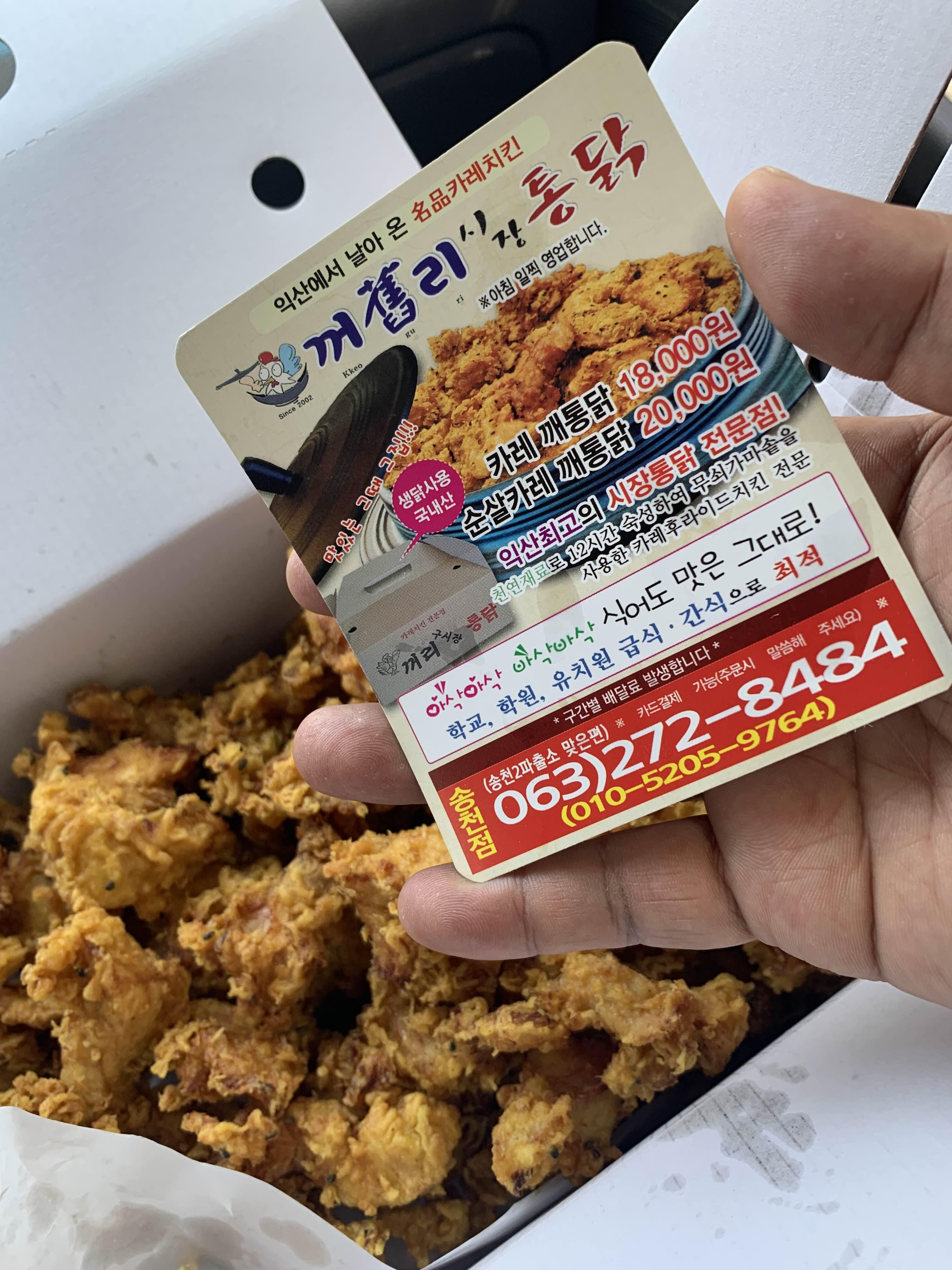 박스 포장이나 맛이나 비교했을 때 익산의 솜리 치킨과 비슷한 느낌입니다. 솜리 치킨은 튀김이 바삭하고, 거리 통닭은 튀김이 부드러운 느낌입니다. 맛은 비슷비슷하여 아이들이 두 가지 통닭을 다 좋아합니다.