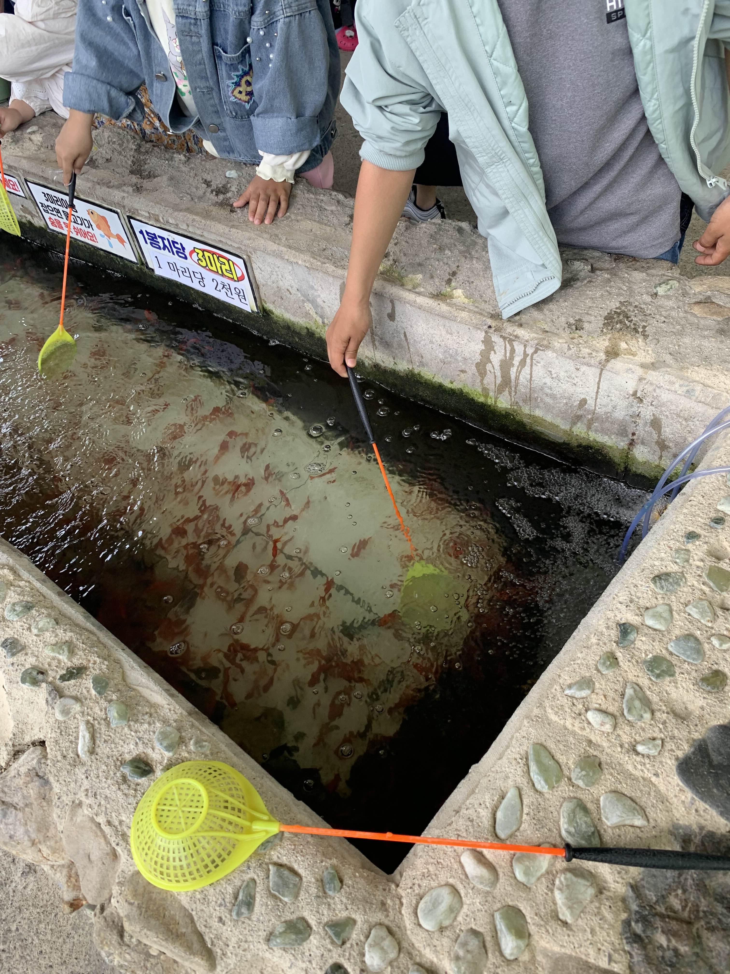 물고기 잡기 체험!!! 체험비 5,000원으로 물고기 3마리 가져갈 수 있도록 되어있습니다. 물고기를 안 가져가도 되니, 잡는 체험만 할 수 있냐는 질문에.... 안된다고 하더군요. 물고기 가져가면, 집에서 키우기가.....