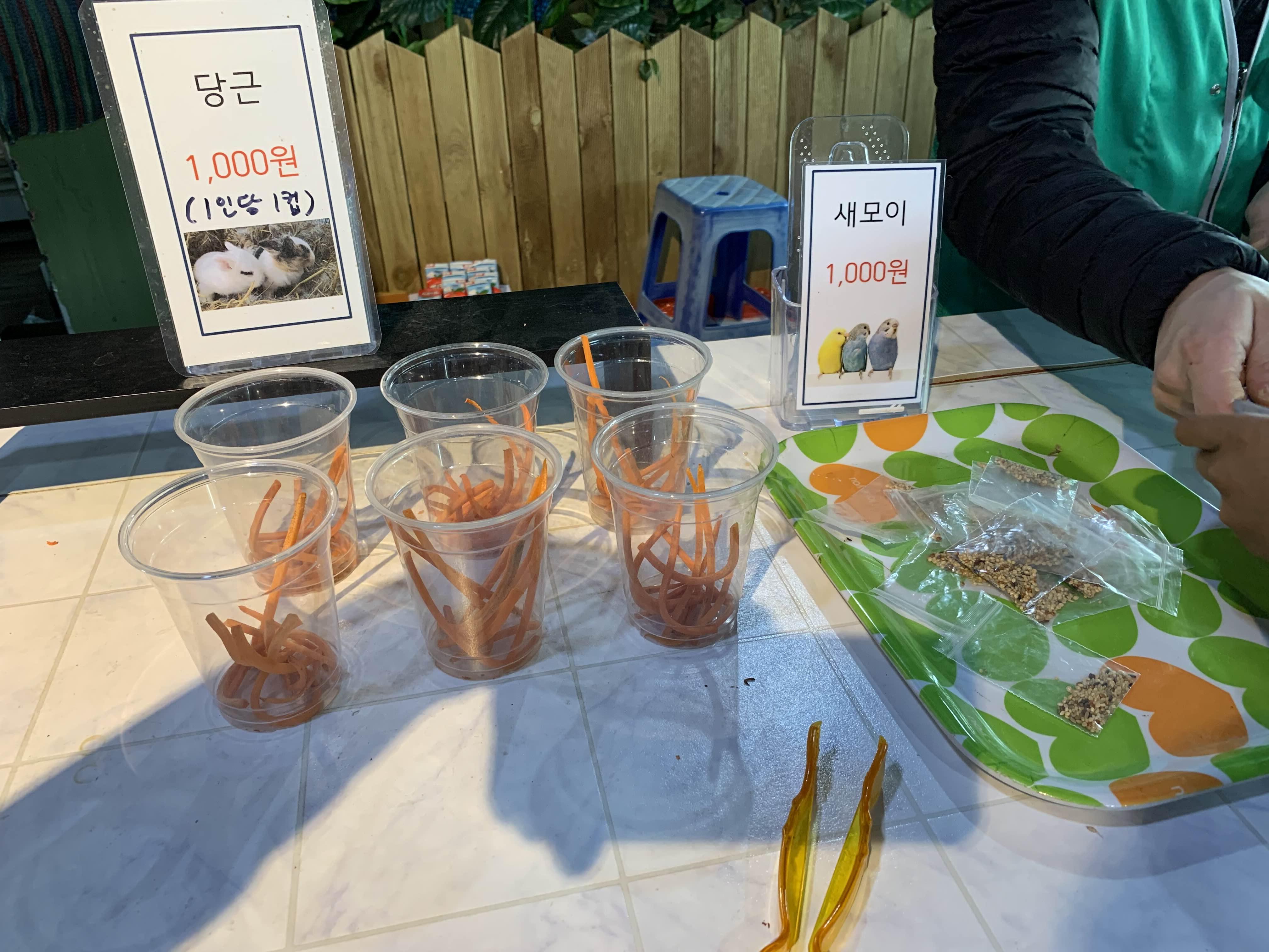 마지막 코스는 입구에 준비된 동물체험으로 토끼용 당근 구입과 새의 먹이 구입하여 먹이 주는 체험 장소가 마련되어 있더군요.
