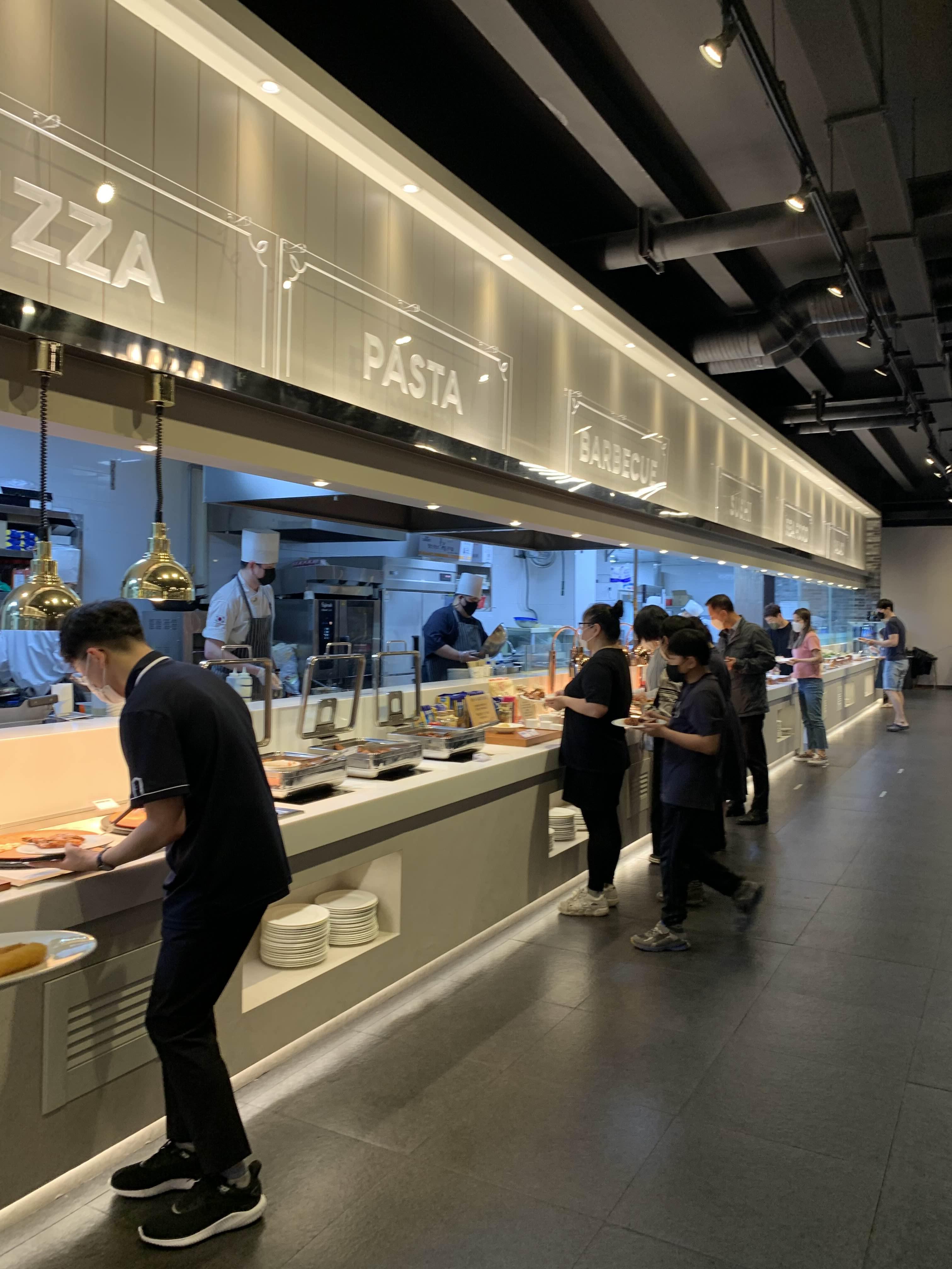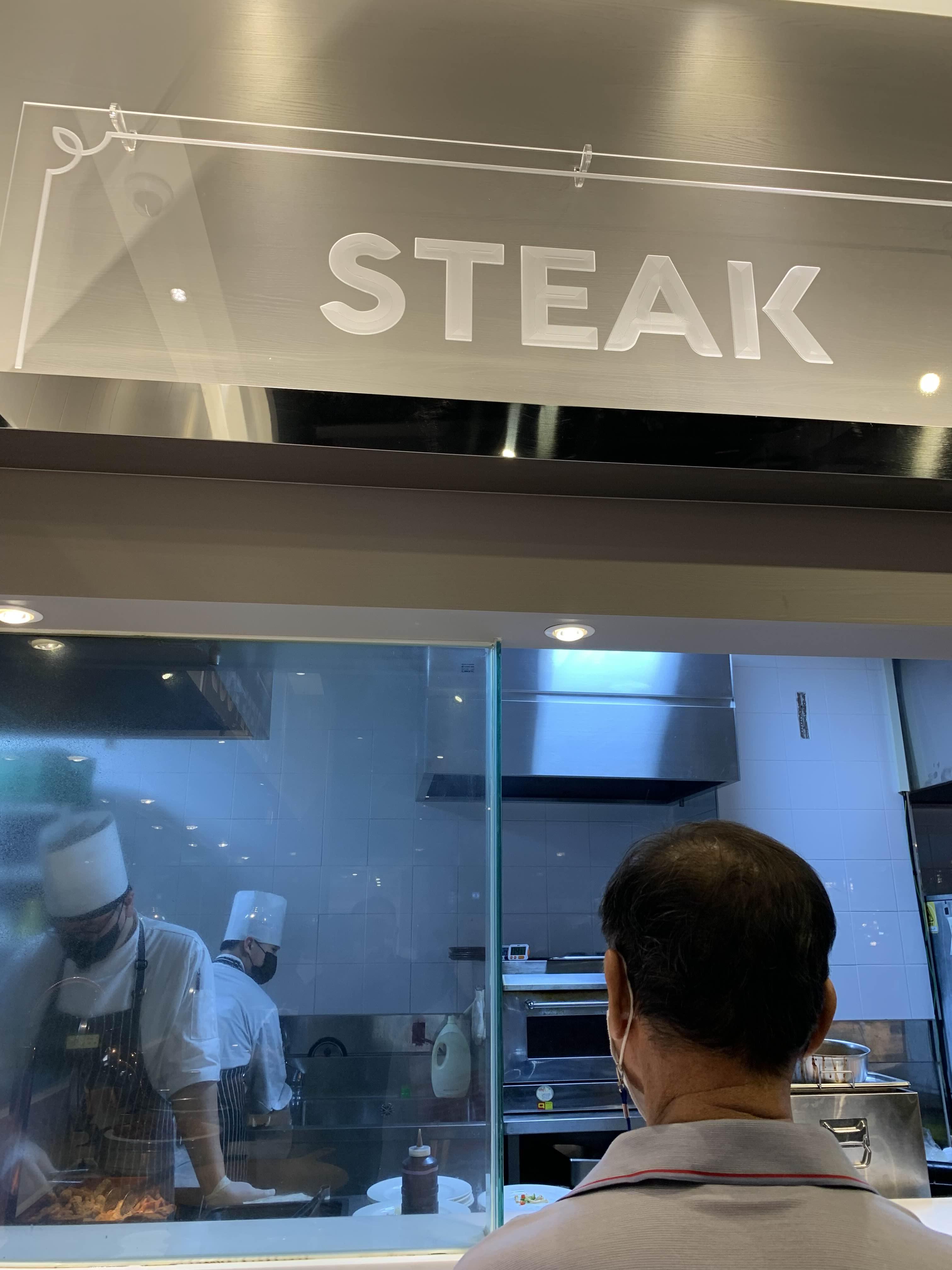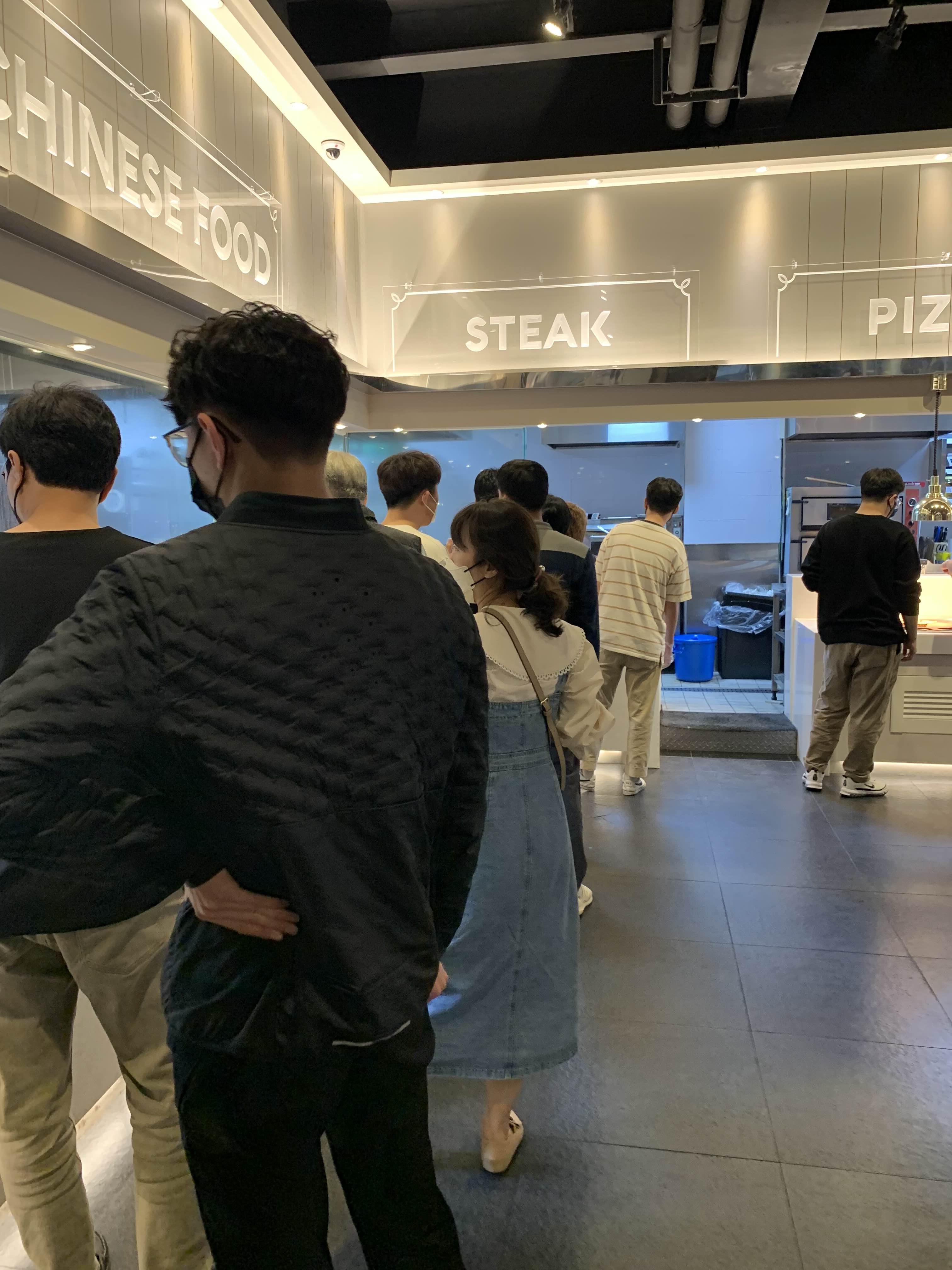 준비된 음식을 가져다 먹기도 하지만, 음식을 주문해서 먹는 코스로 스테이크, 짬뽕, 파스타는 주문하면 나오는 스타일입니다. 그중 스테이크는 주문이라기보다... 대기줄에서 기다렸다, 음식이 나오면 가져가는 스타일!! 다른 사람들 입맛에도 스테이크가 맛있었나 봅니다.
