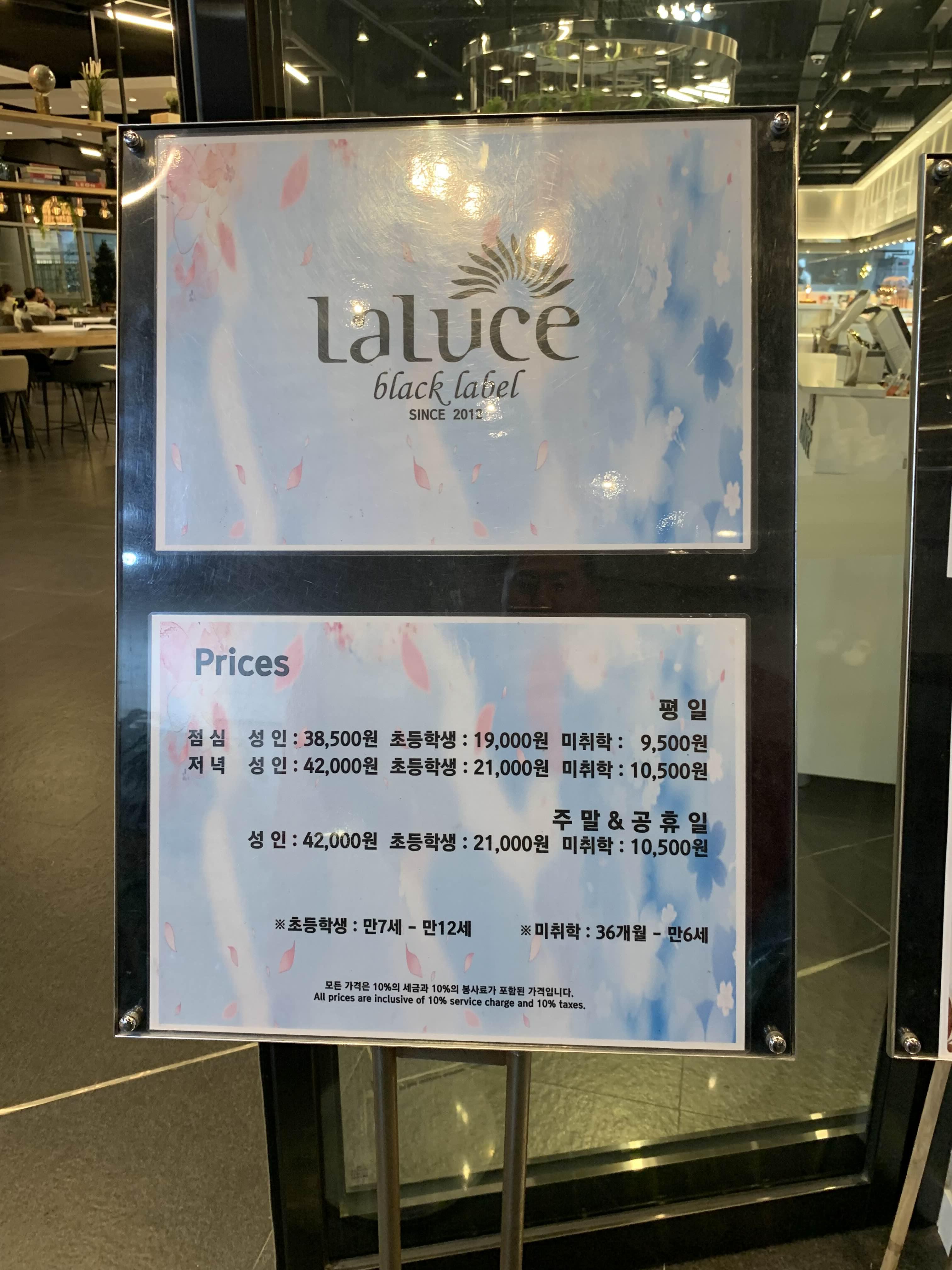 오랜만에 방문한 라루체!!! 식사 가격이 많이 인상되었네요. 성인 42,000원, 초등학생이 21,000원으로.... 상당히 비싼 가격대를 형성하더군요. 예전에는 3만 원 가격대로, 그때도 좀 비싸다는 생각이 들었는데, 최근 물가상승?으로 인해..... 프리미엄? 느낌의 뷔페는 4만 원 가격대를 형성하나 봅니다.