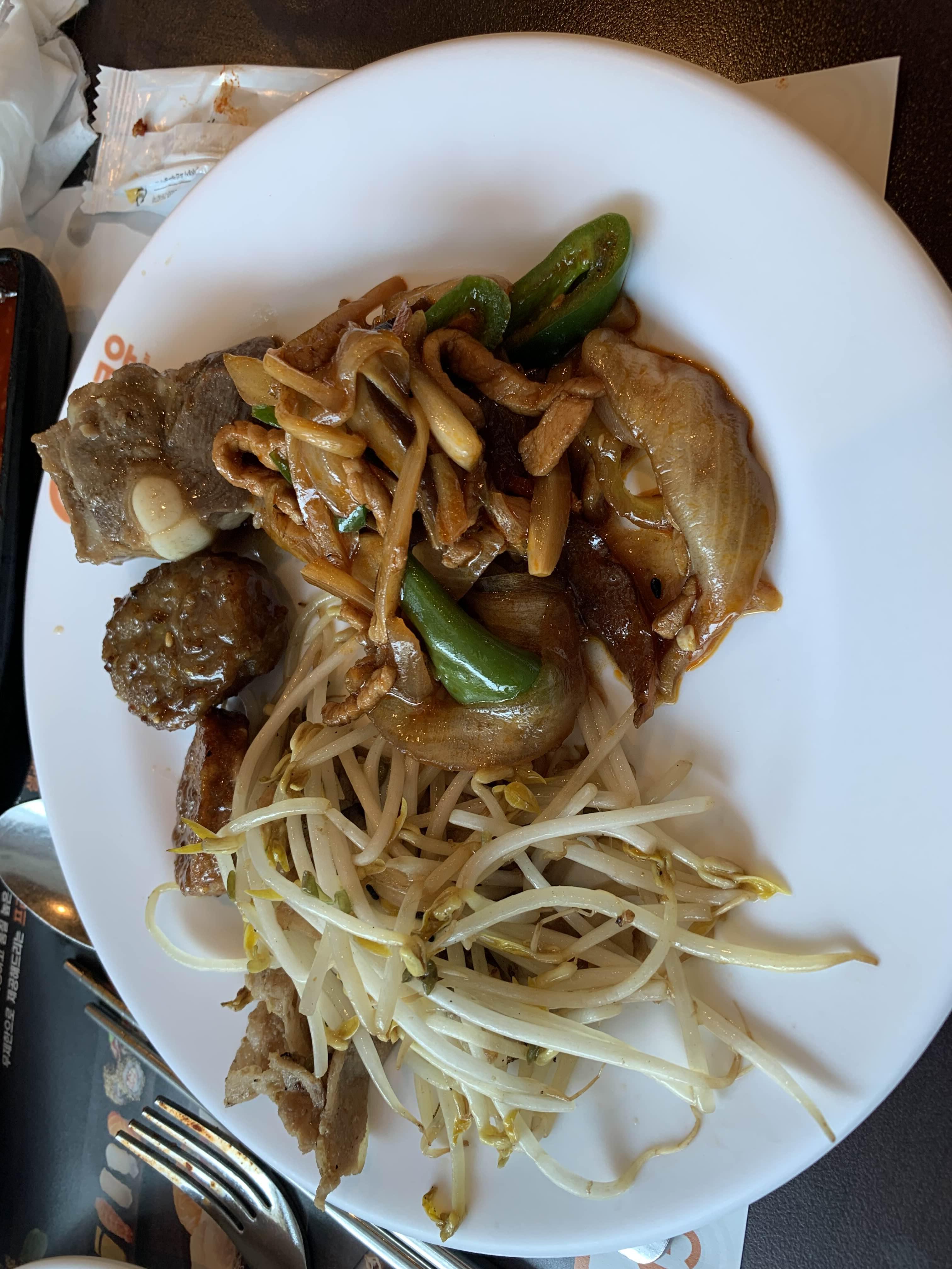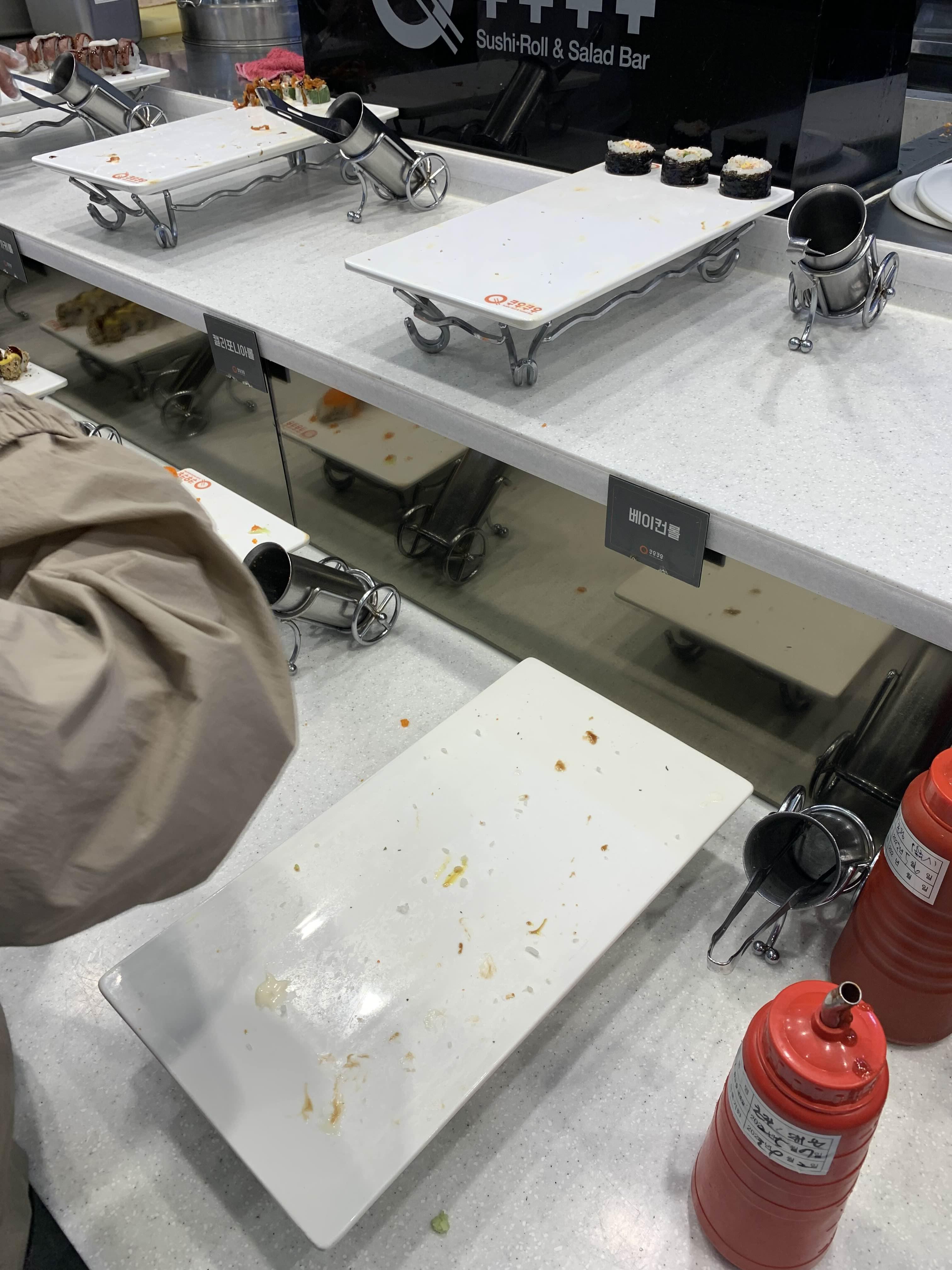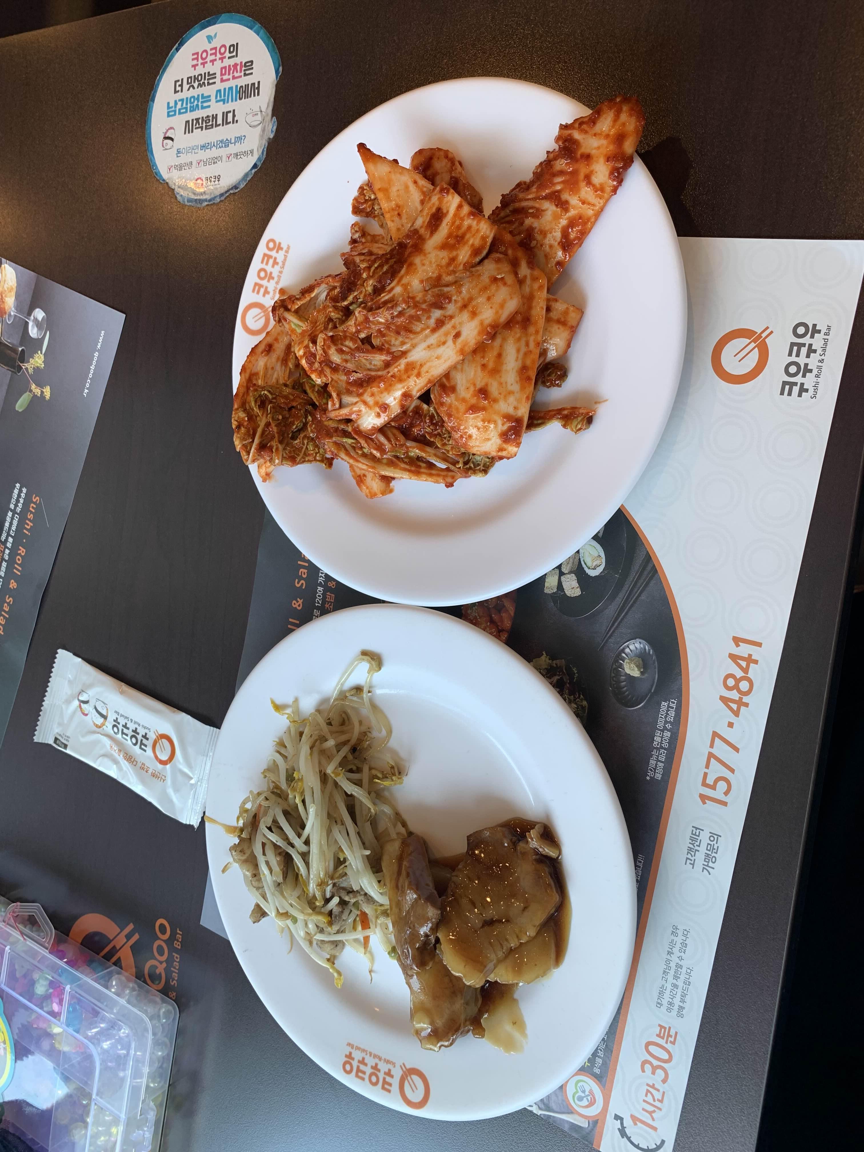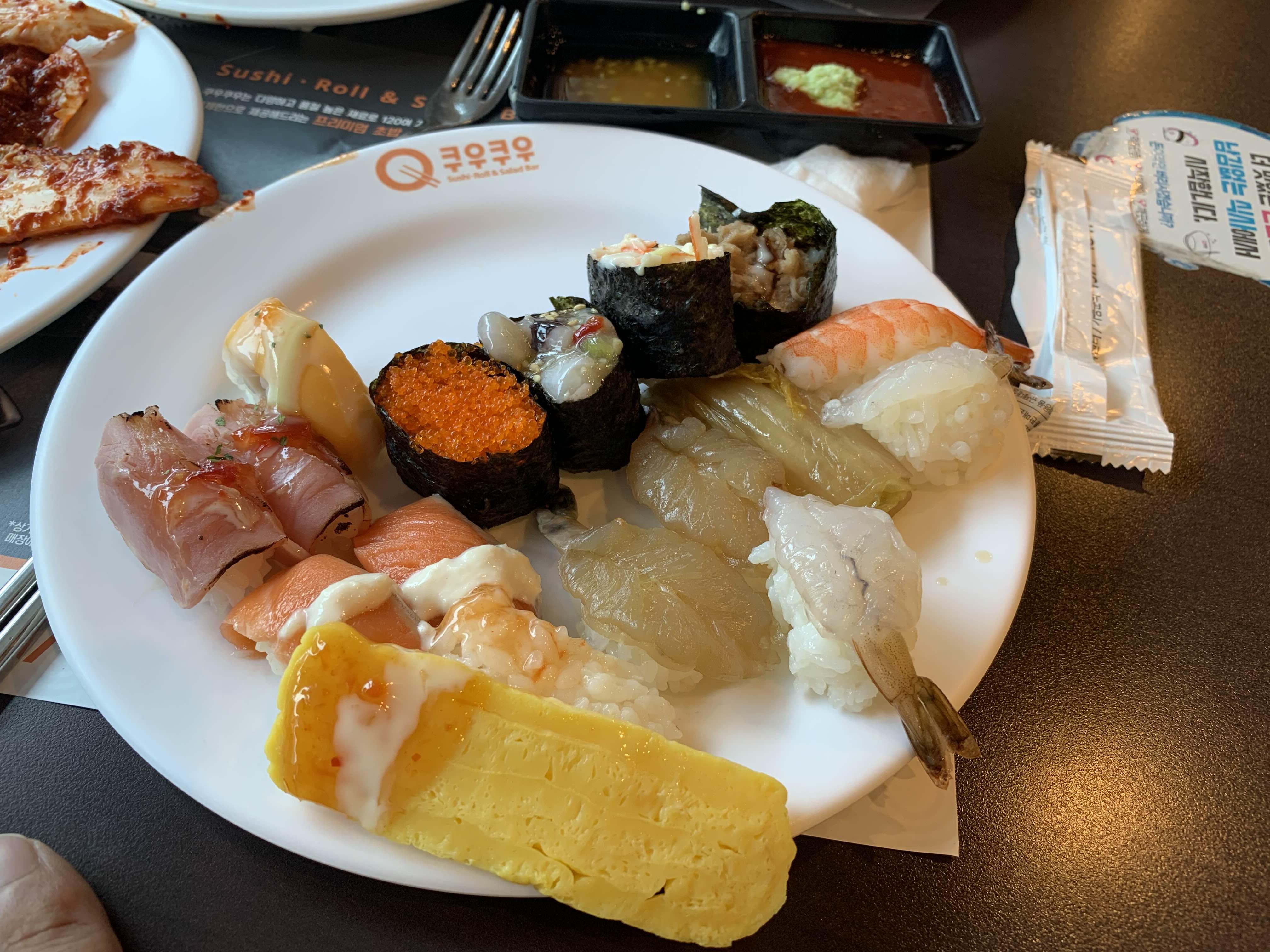 쿠우쿠우는 초밥 전문 뷔페로... 첫 코스는 초밥으로 맛을 봐야겠죠. 하지만, 뷔페를 먹기 전 기본 세팅을 해야겠죠, 그래서 김치로 준비!! 김치 세팅이 끝나면 음식을 전체적으로 스캔해주고, 가장 맛있게 보이는 고기 종류로 준비해 보았습니다.