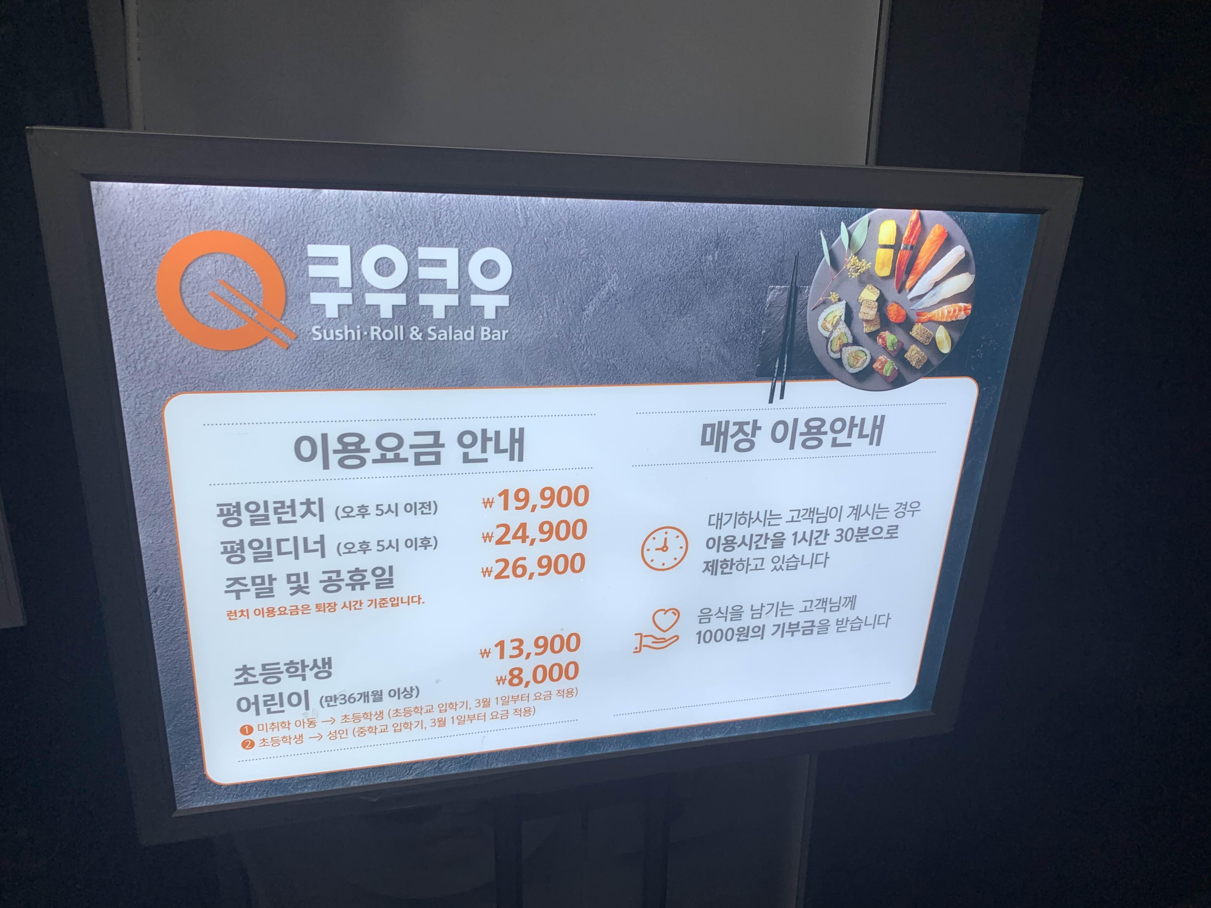 코로나19 방역지침 완화에 따라, 최근 뷔페식당에 방문하게 되는 것 같습니다. 오랜만에 방문한 쿠우쿠우!!! 성인 26,900원, 아이들은 13,900원으로... 오랜만에 방문해서 가격은 기억나지 않지만... 가격이 약 2,000원 정도 오른 거로 기억하네요.