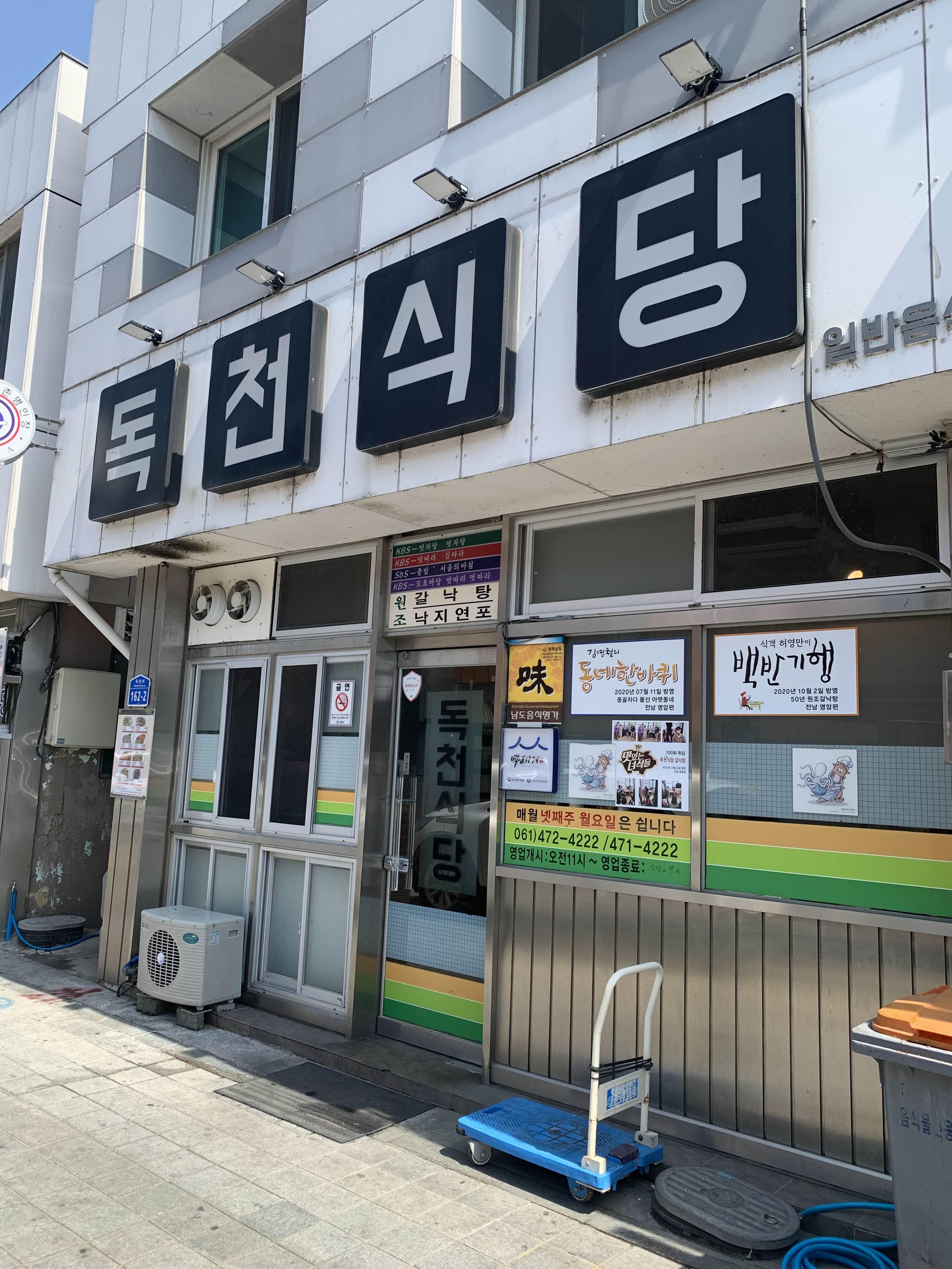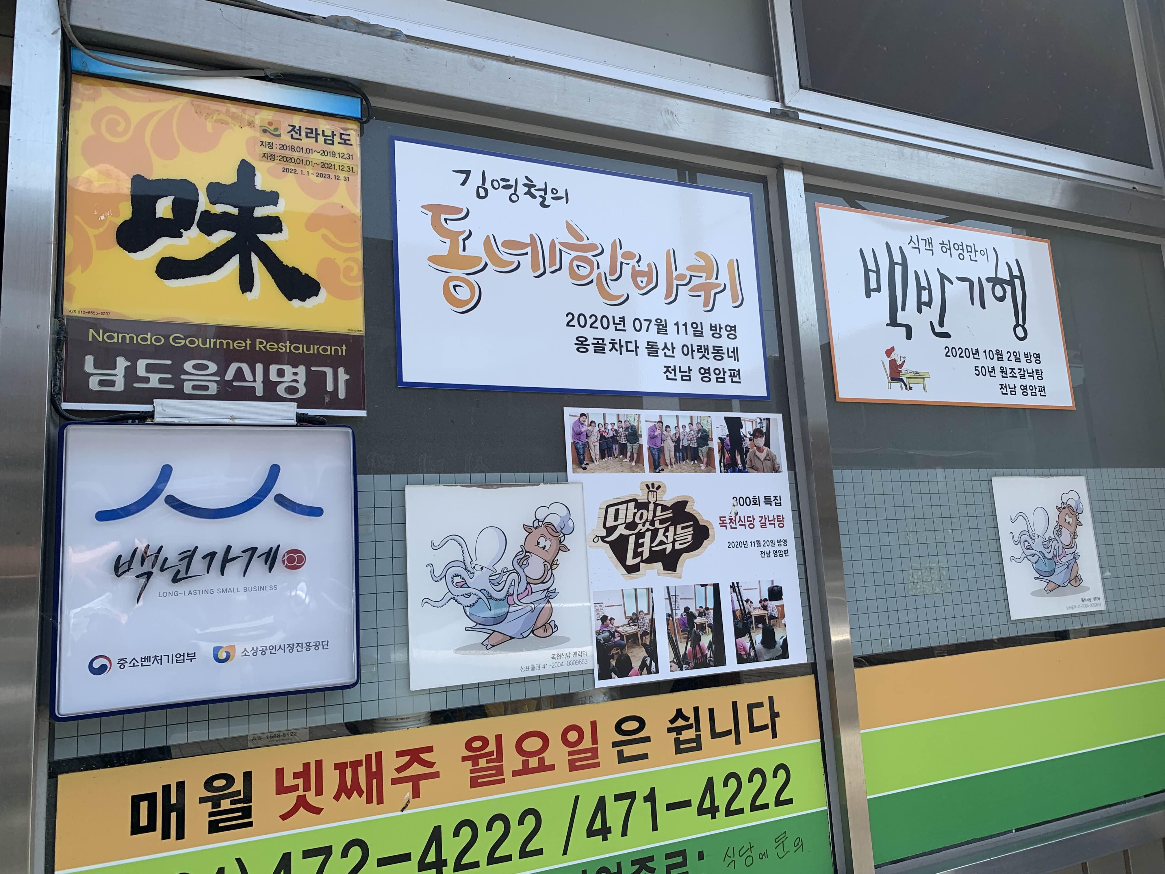 낙지를 전문으로 다루는 영암에 위치한 독천식당에 방문해 보았습니다. 식당 입구에는 여러 방송 프로그램에 나왔다는 안내문이 보이더군요.
