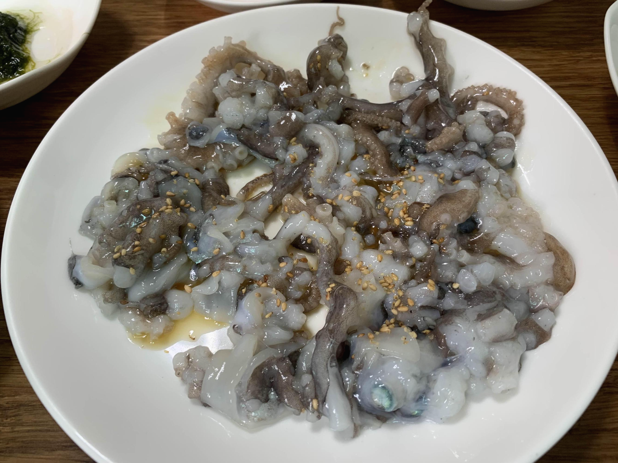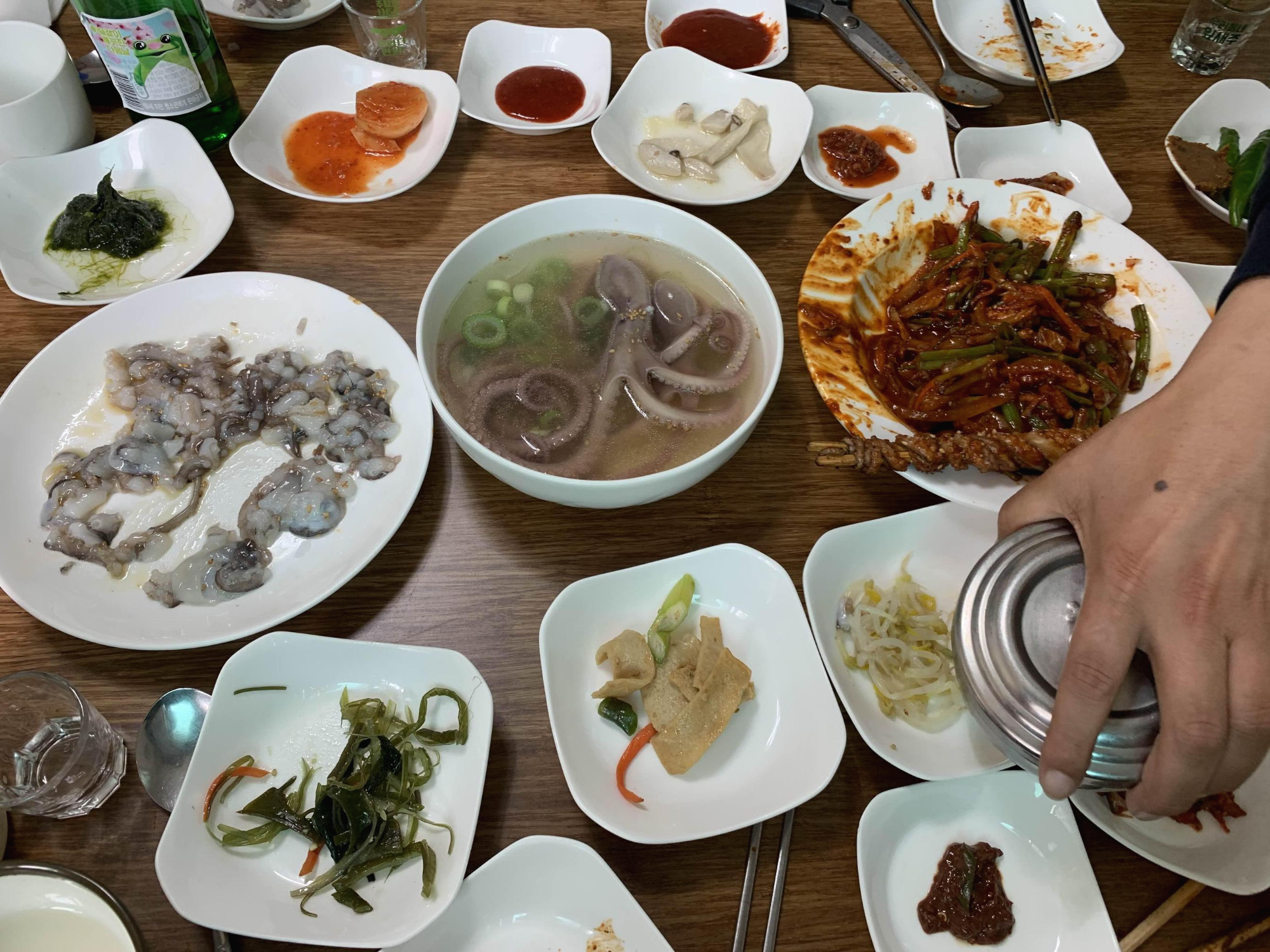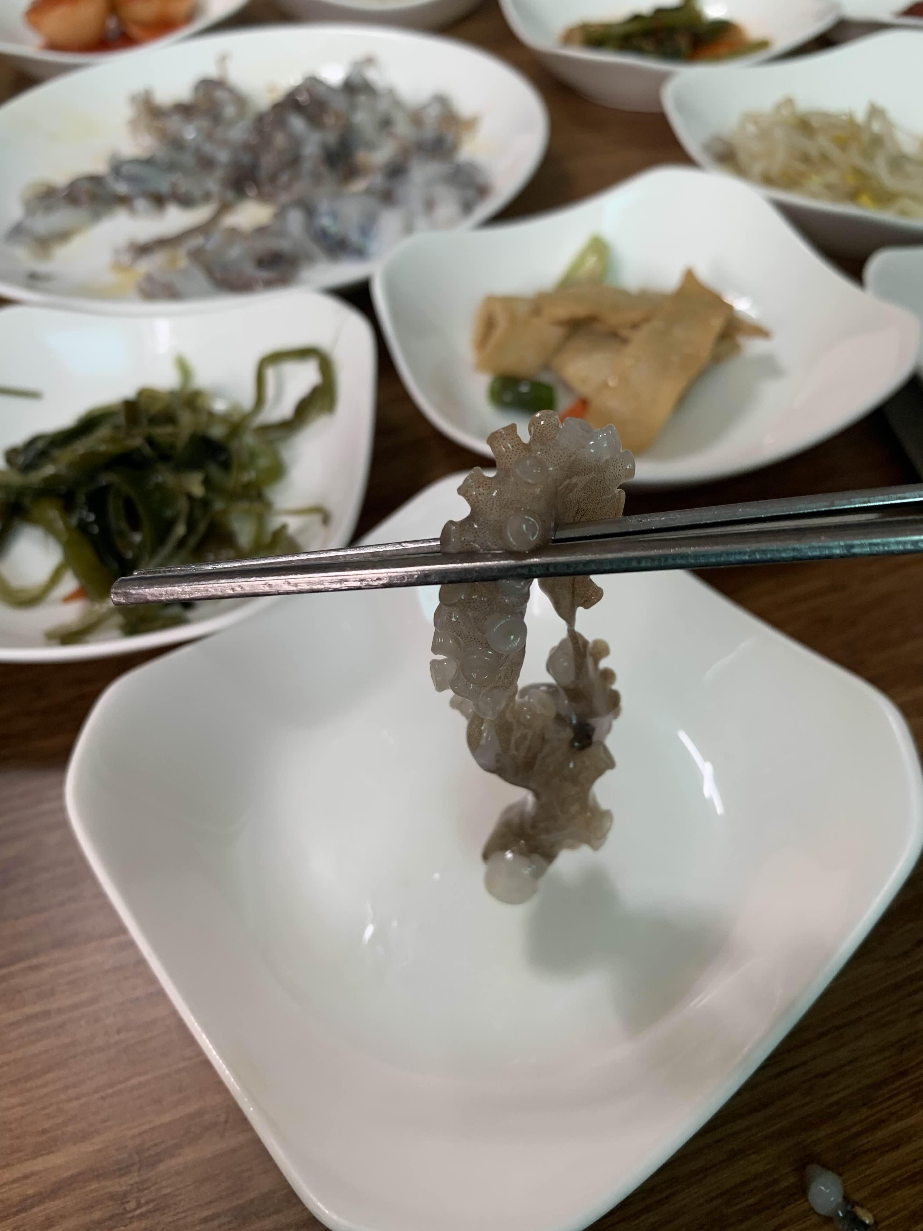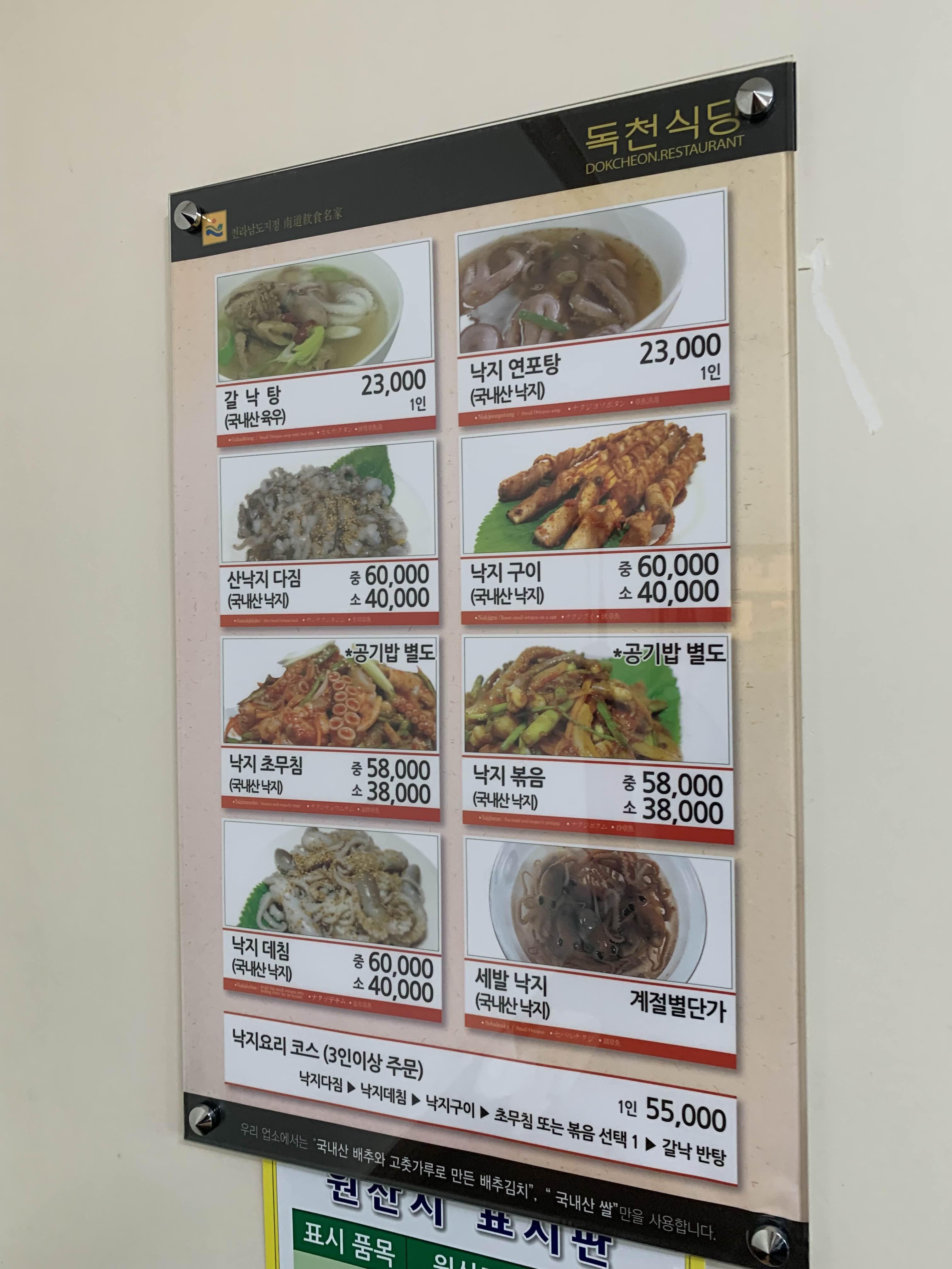 메뉴판을 스캔하니.... 가격이 꽤 비싸더군요. 식자재가 낙지라, 비싼 음식은 낙지 요리로 낙지 가격을 고려하면 그렇게 비싸지 않은데.... 왜 이렇게 비싸게 느껴졌는지^^ 암튼 비싼 낙지 요리를 주문해 보았습니다. 산 낙지 다짐(중 60,000원), 낙지구이(중 60,000원), 낙지볶음(중 58,000원), 연포탕(2개 46,000원) 이렇게 주문하니.... 양이 부족할 테니 주문을 더 주문해야 한다고.... 아이들 포함해 8명이 23만 원 정도 하는데 적다니.... 암튼 주문!ㅎㅎ