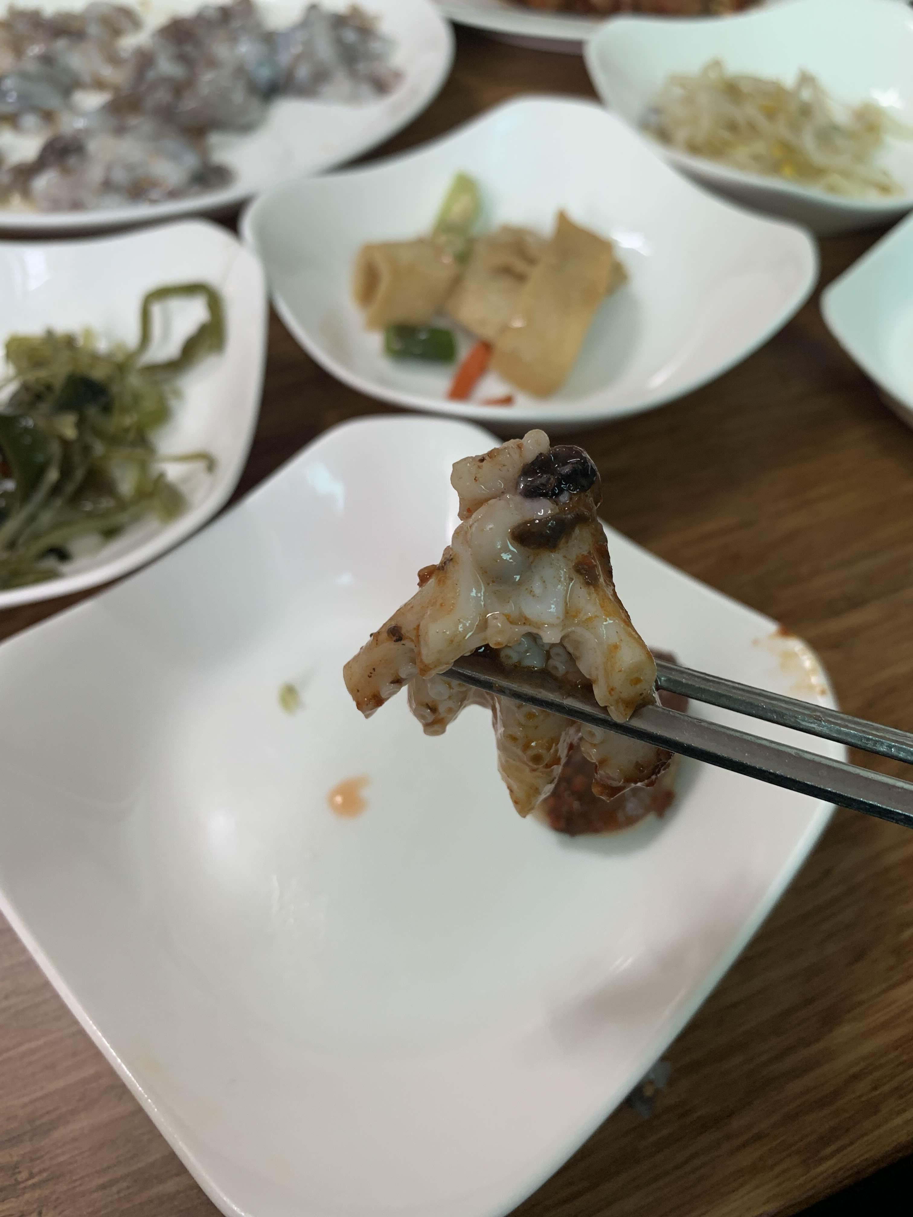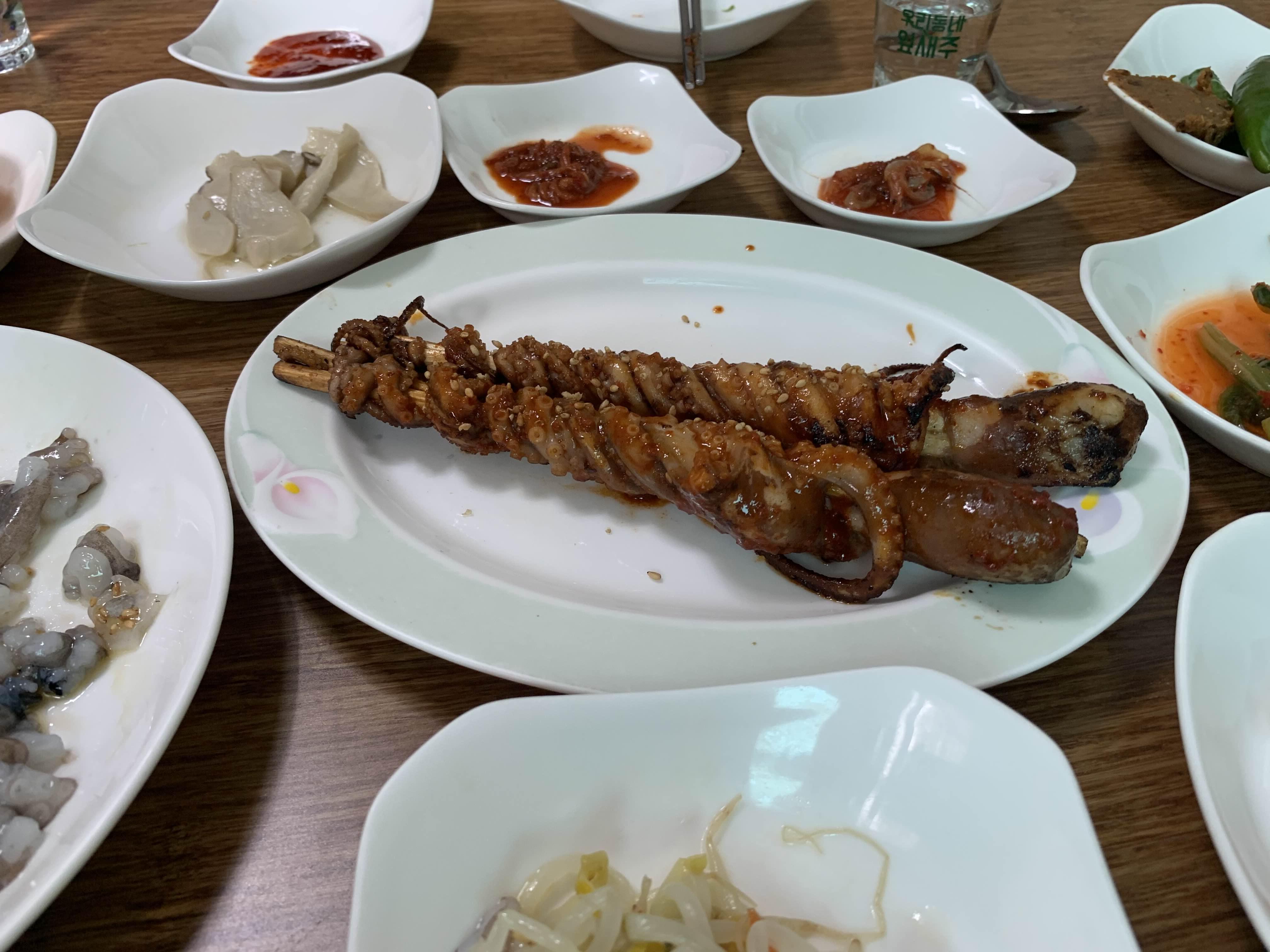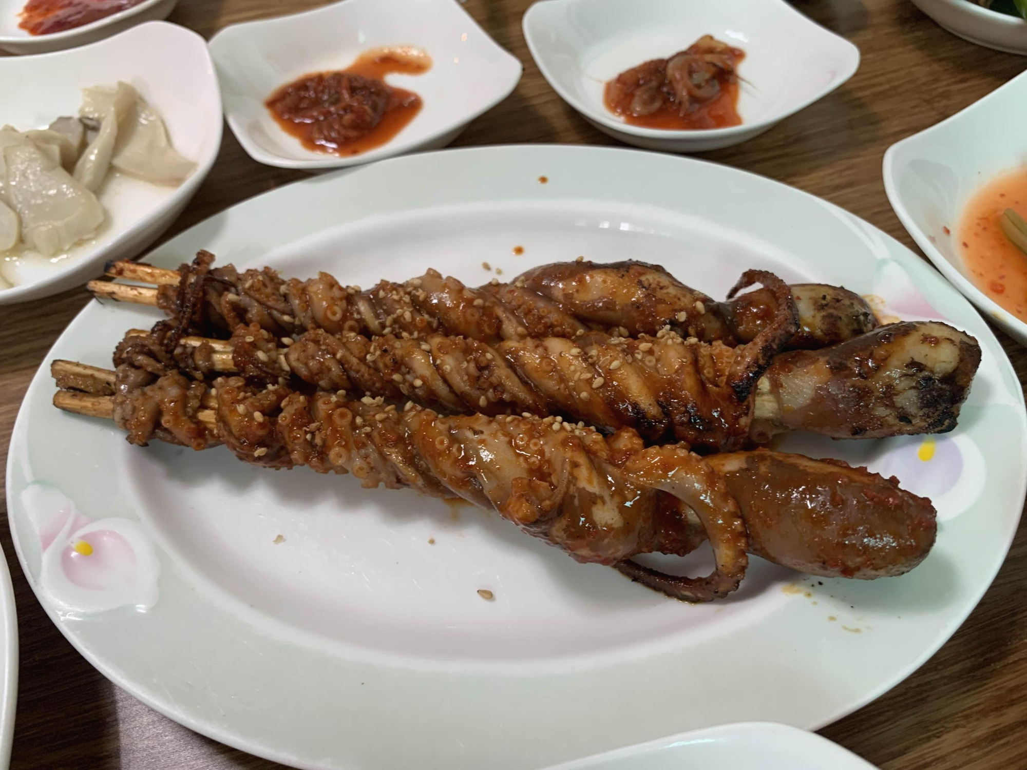 산 낙지를 맛보는 사이 나온 낙지구이(나무젓가락에 돌돌 말은 호롱이)를 맛보았는데, 일반적인 구이와 다르게 살짝 익혀서 식감이 살아있더군요. 나에게는 살짝 익혀서 식감이 좋았는데, 아이들이 먹기에는 너무 물컹거려서 그리 좋아하지는 않더군요. 양념은 무난!