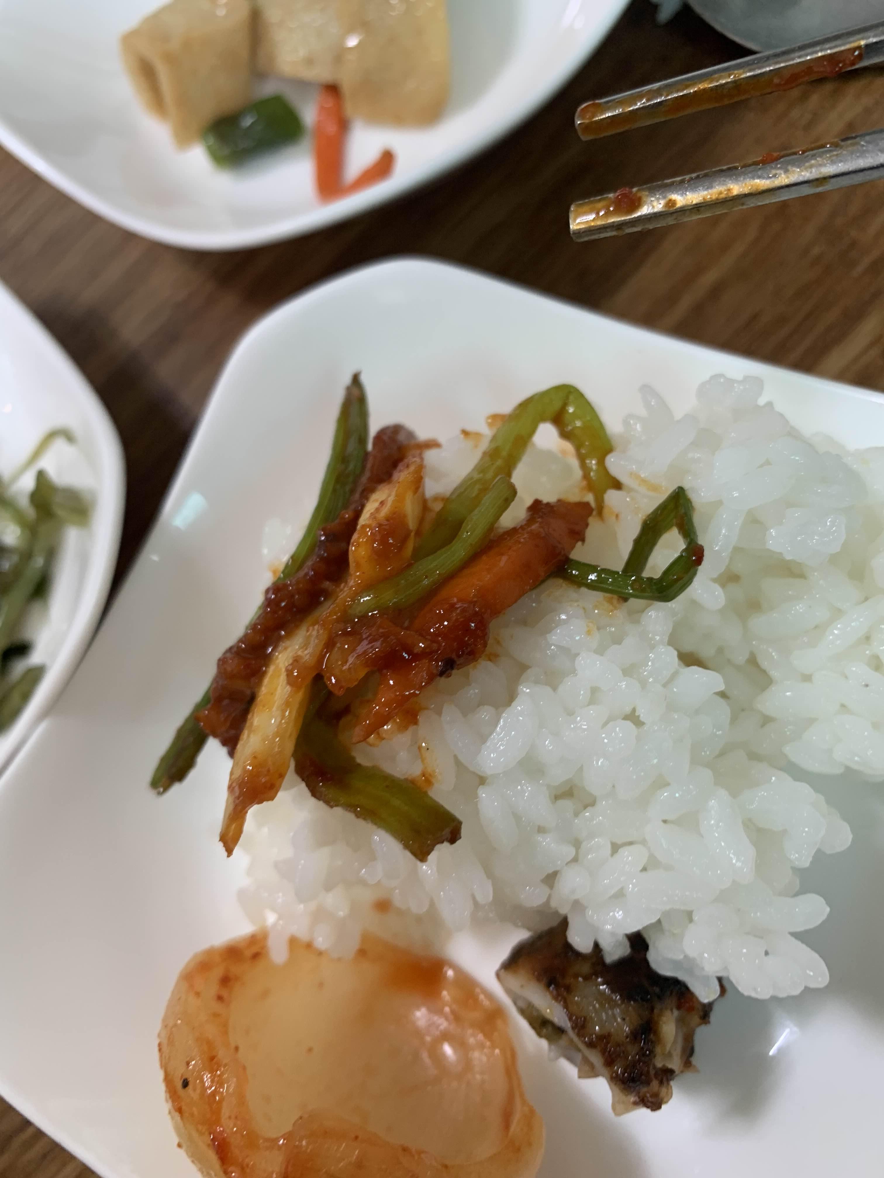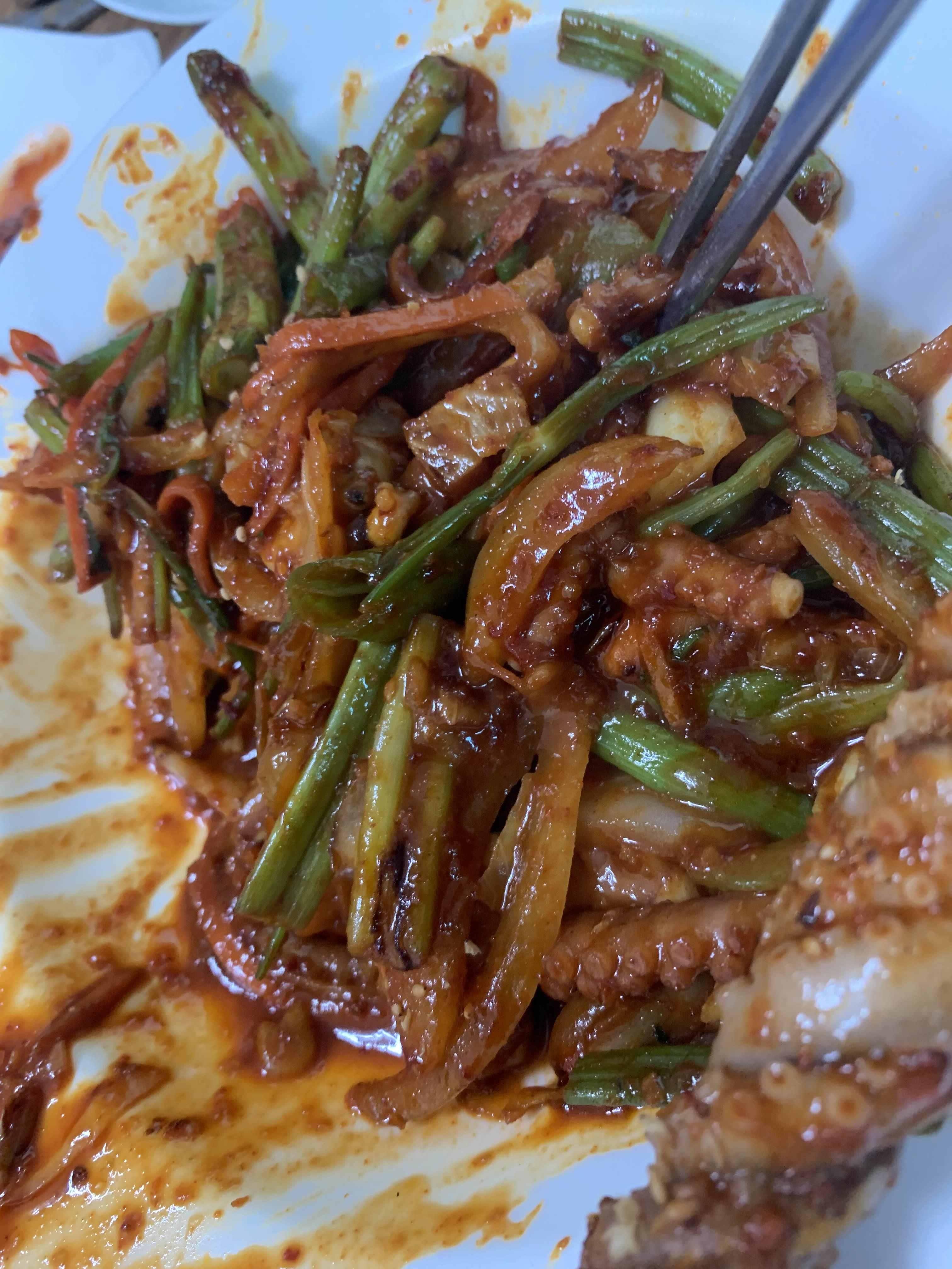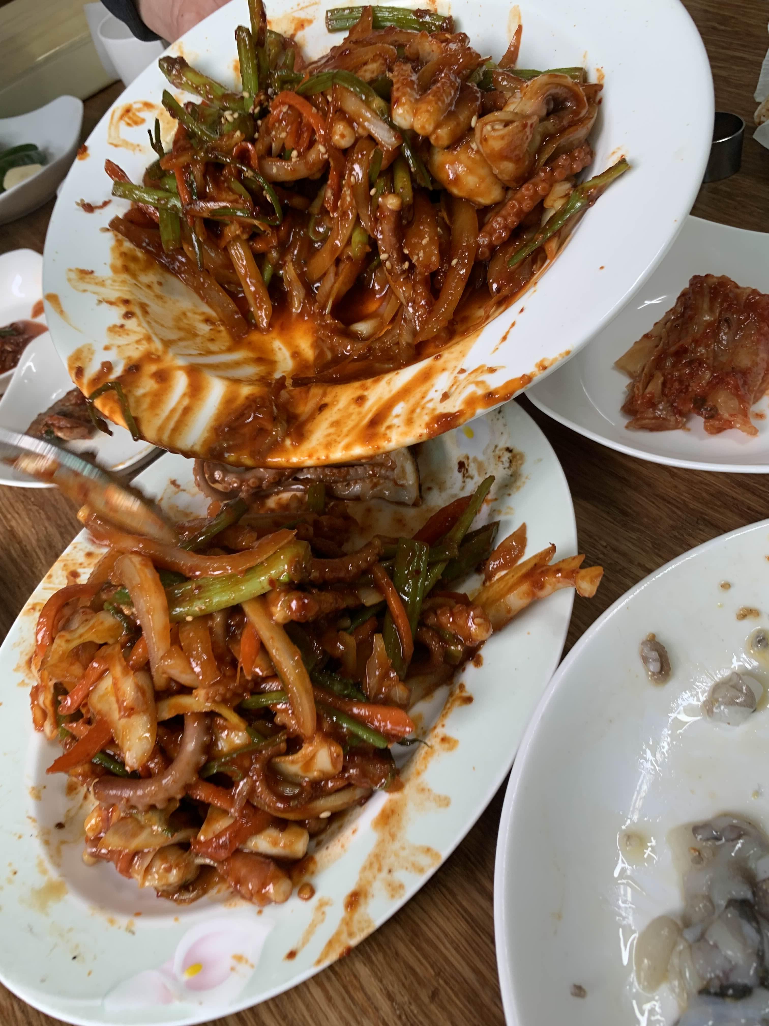 그리고 낙지볶음! 낙지구이의 양념은 좀 밋밋해서 별로였는데, 낙지볶음의 양념은 구이와 다르게 맛이 괜찮더군요. 밥과 함께 맛보기도 좋고, 더욱이 볶음에 들어간 미나리 식감이 나름 좋더군요.