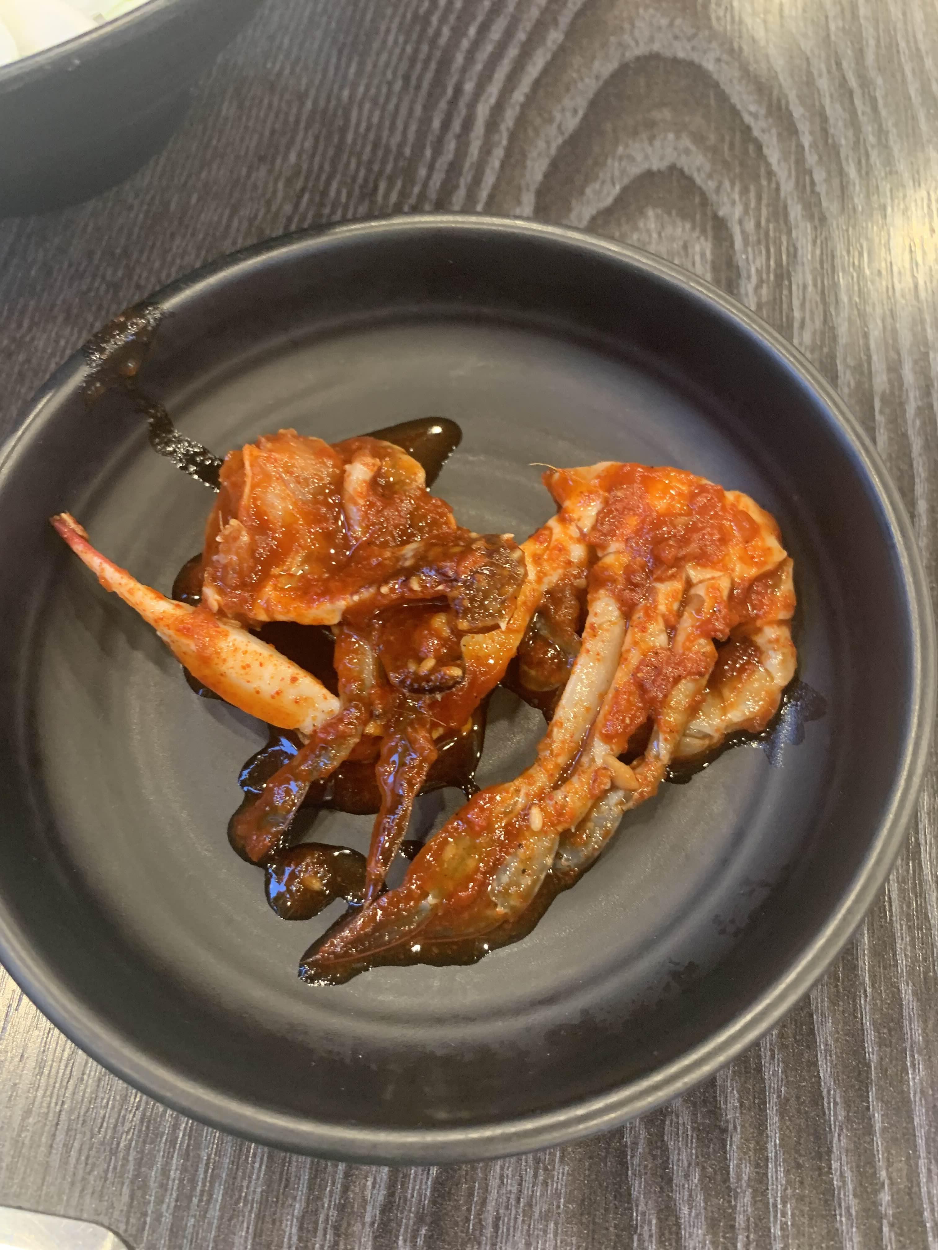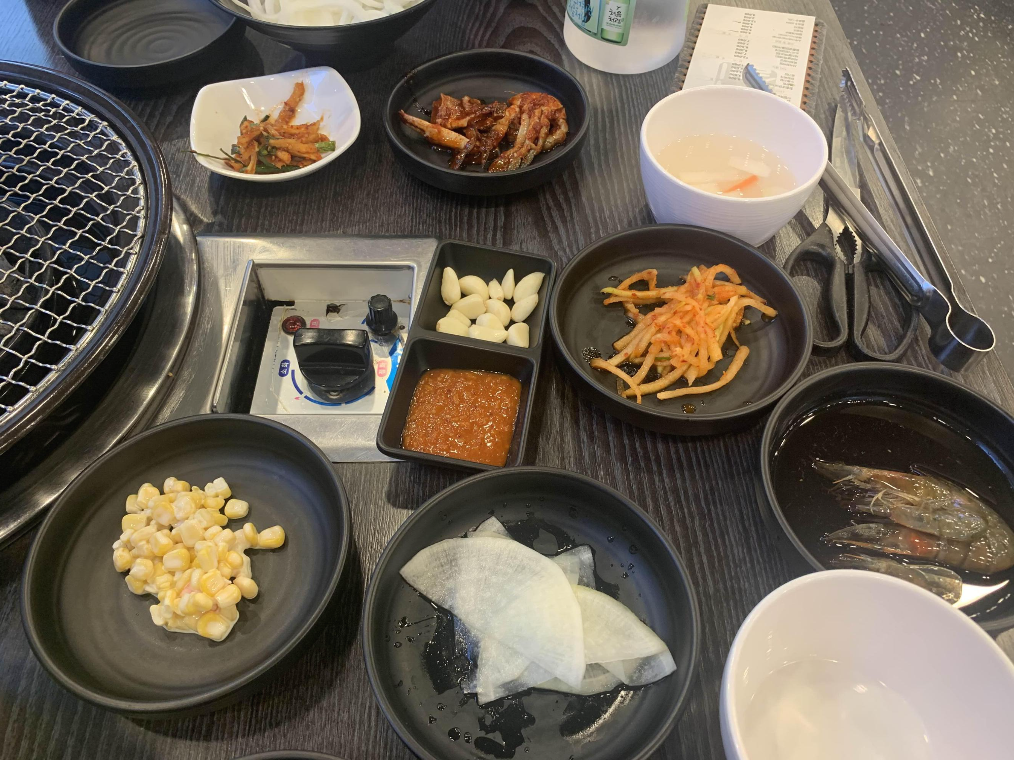 매장에 방문하여 다른 테이블 음식과 메뉴판을 스캔하며 메뉴를 골라보았습니다. 대표 메뉴? 돼지 왕갈비를 주문해 보았습니다. 음식을 주문하고, 얼마 되지 않아 밑반찬으로 무생채, 무절임, 콘치즈, 양념게장과 새우장이 나오더군요. 밑반찬은 무난한 맛이 느껴지더군요.