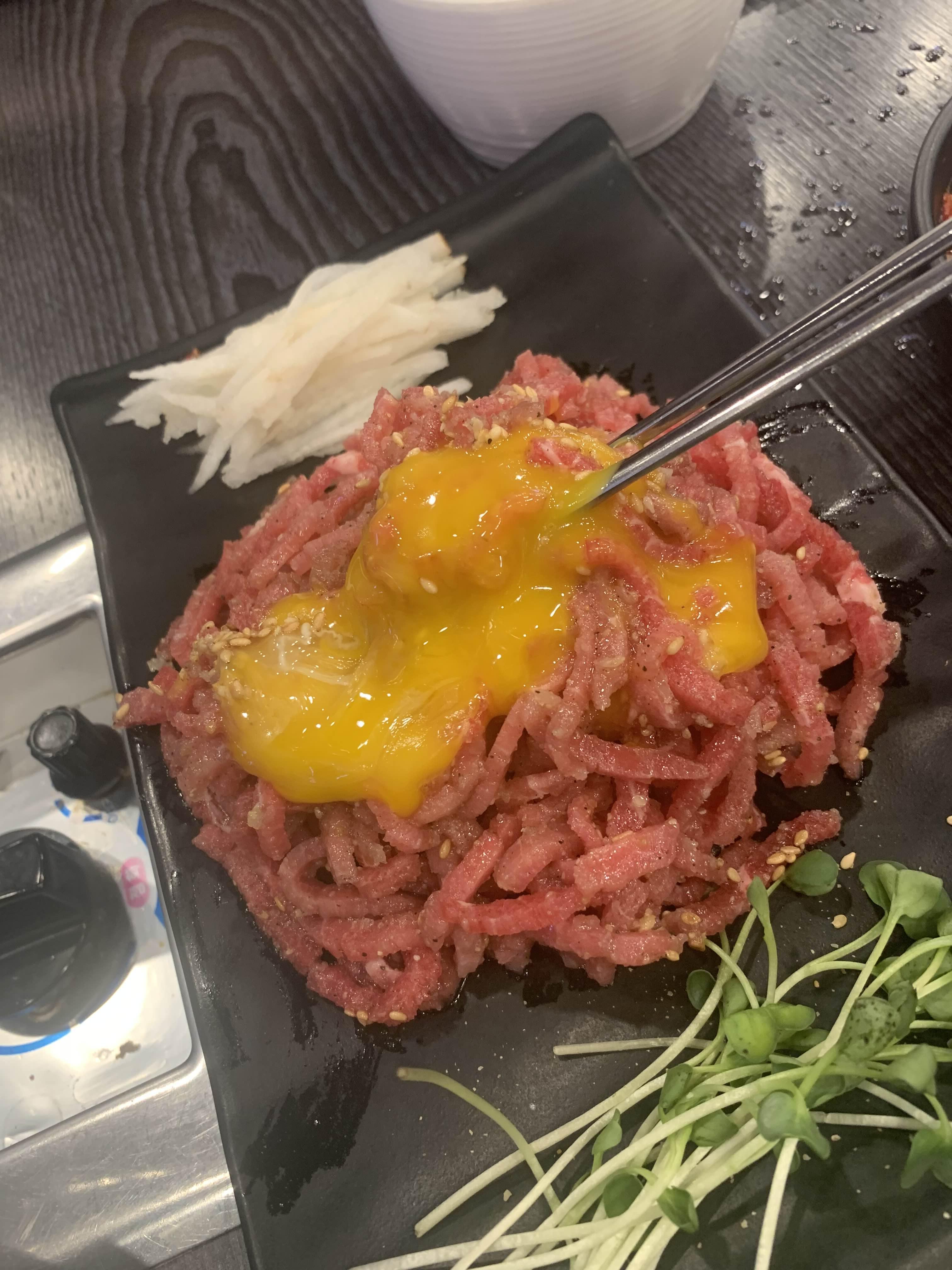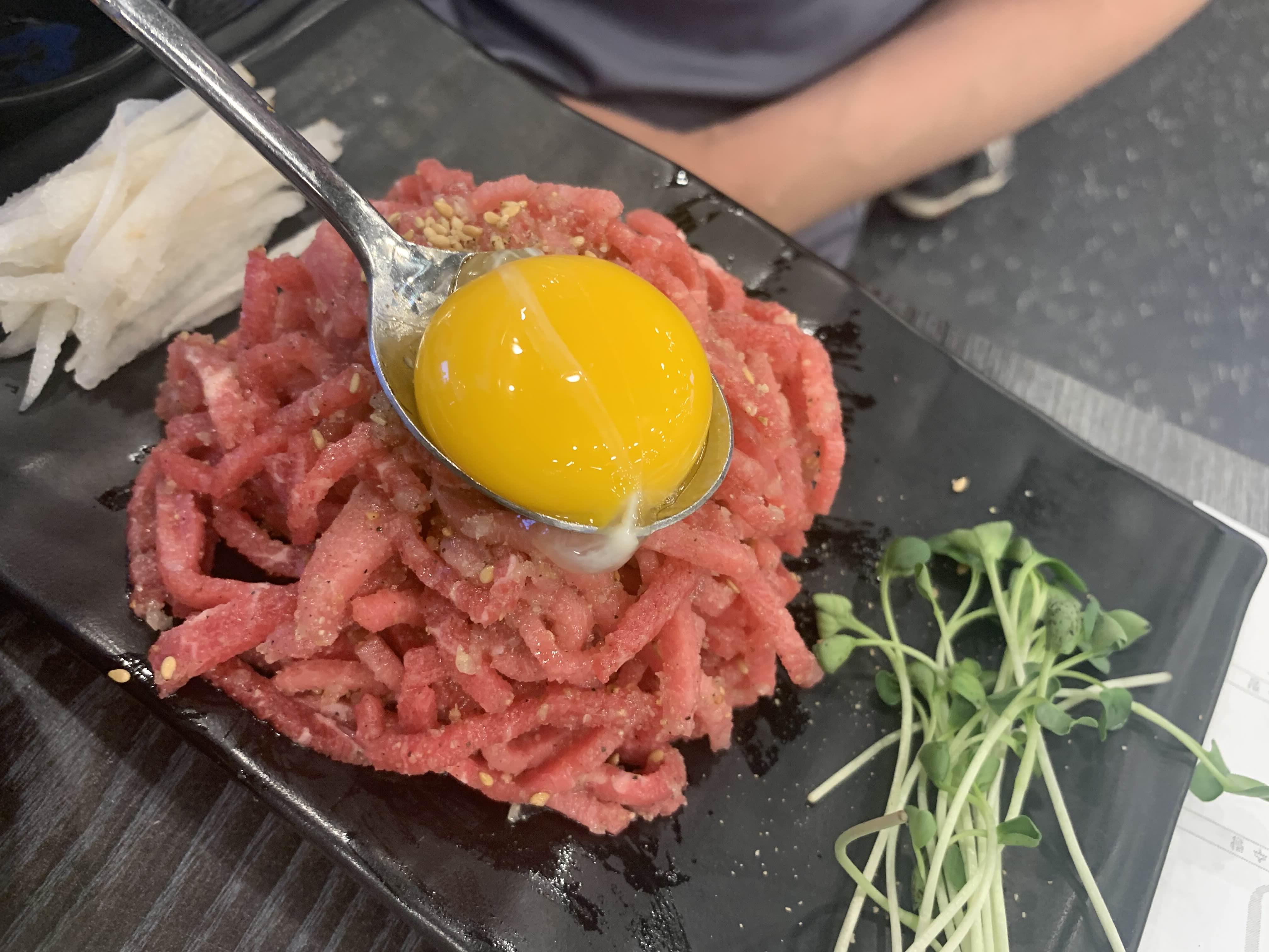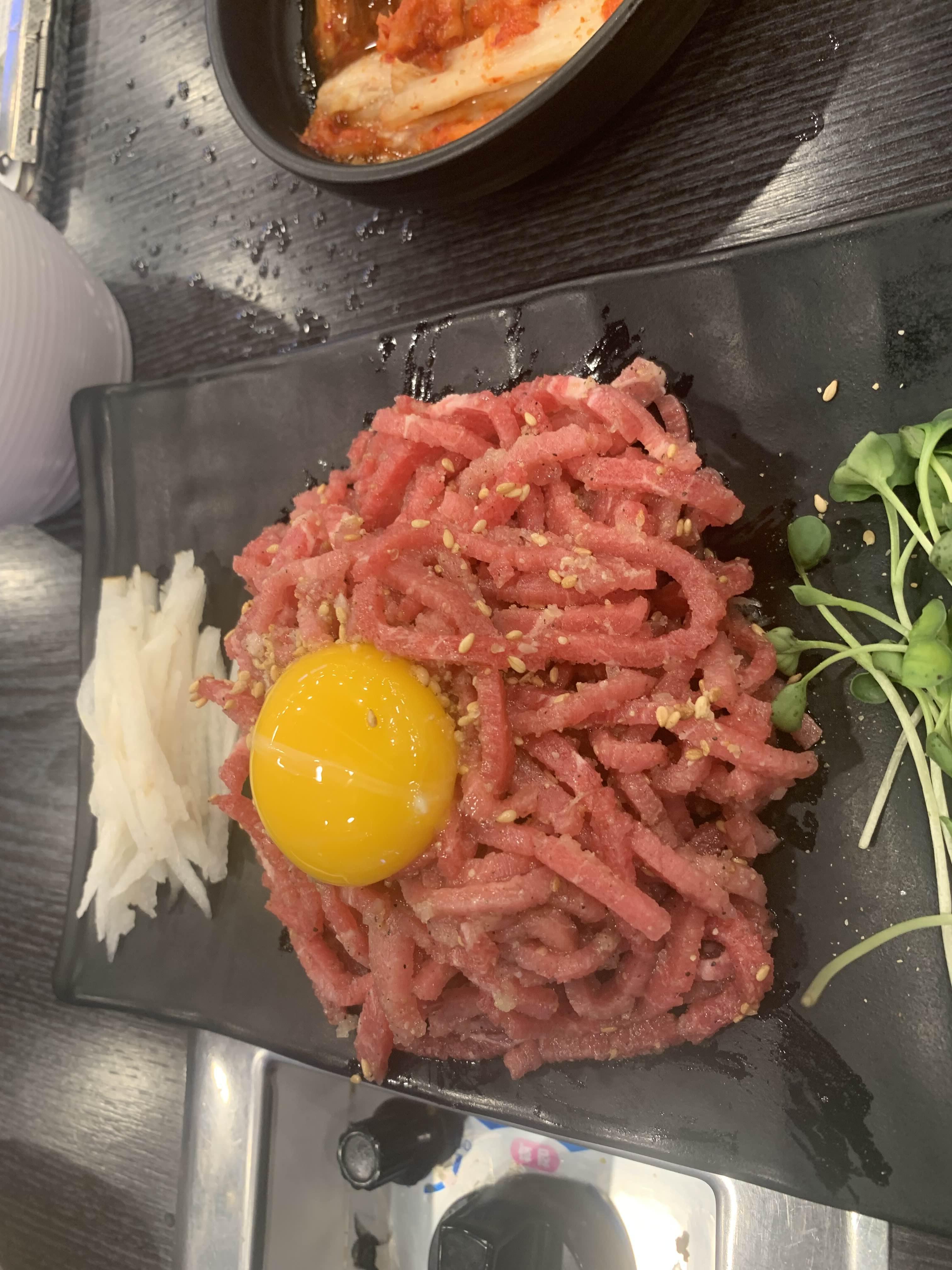 양념갈비를 맛있게 맛보고서 추가 고기를 주문할까? 생각하다.... 다른 테이블에서 육회를 맛나게 드시는 보습을 보고, 육회를 주문해 보았습니다. 차가운 육회 위 달걀노른자가 올라가져 있더군요.