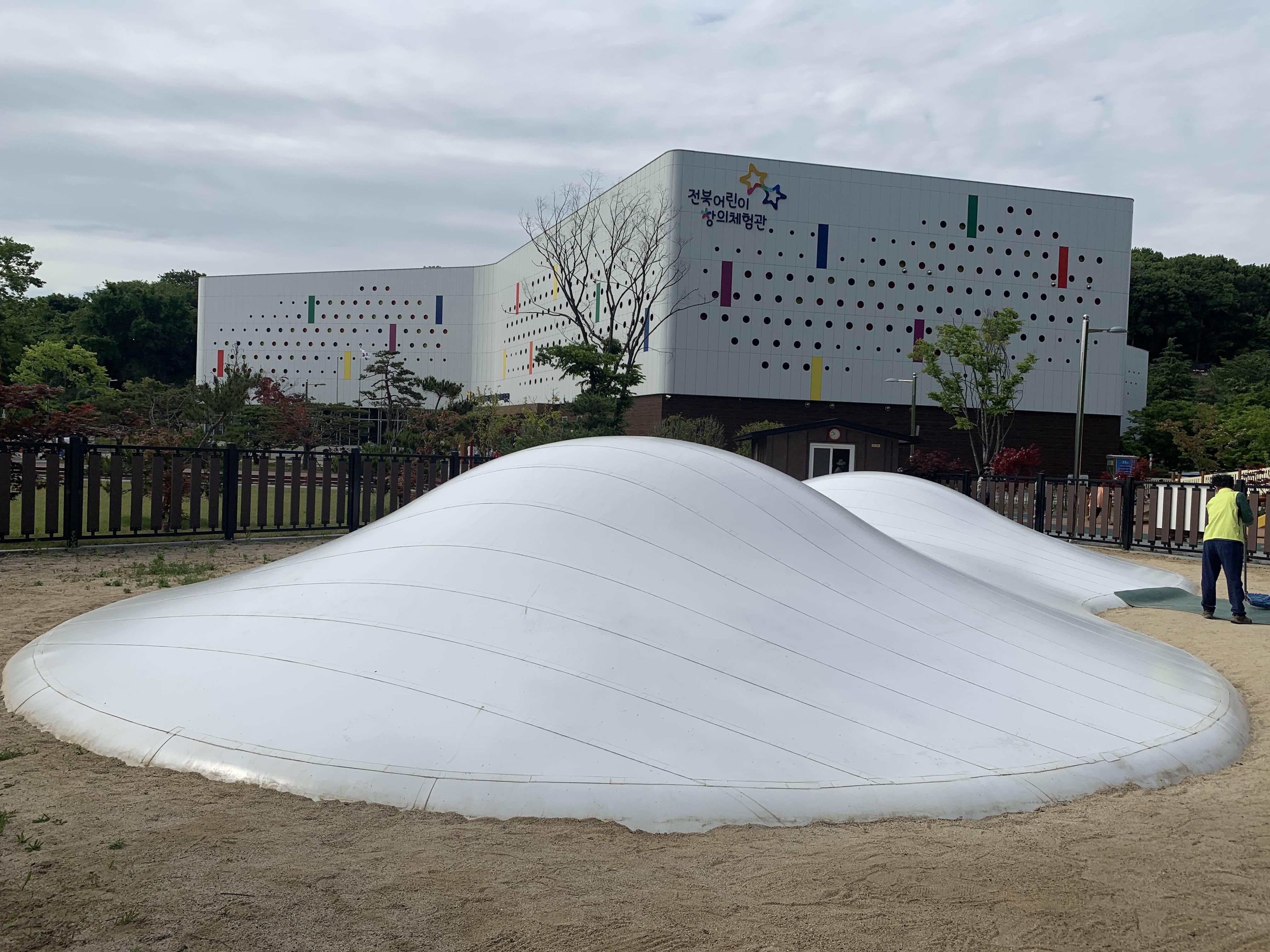 이런 말랑말랑한 구름언덕 놀이시설의 형태가 어떻게 유지될까?라는 생각이 들더군요. 놀이시설 바로 옆 기계실로 보이는 장치가 보이는데, 해당 놀이시설에 에어 콤프레셔(공기주입기)가 보이더군요. 아이들이 노는 사이에 공기를 지속적으로 주입하여 말랑말랑은 공 형태를 유지하는 거 같더군요.(아닐 수도 있음.... 그냥 나의 추측임ㅎㅎ)
