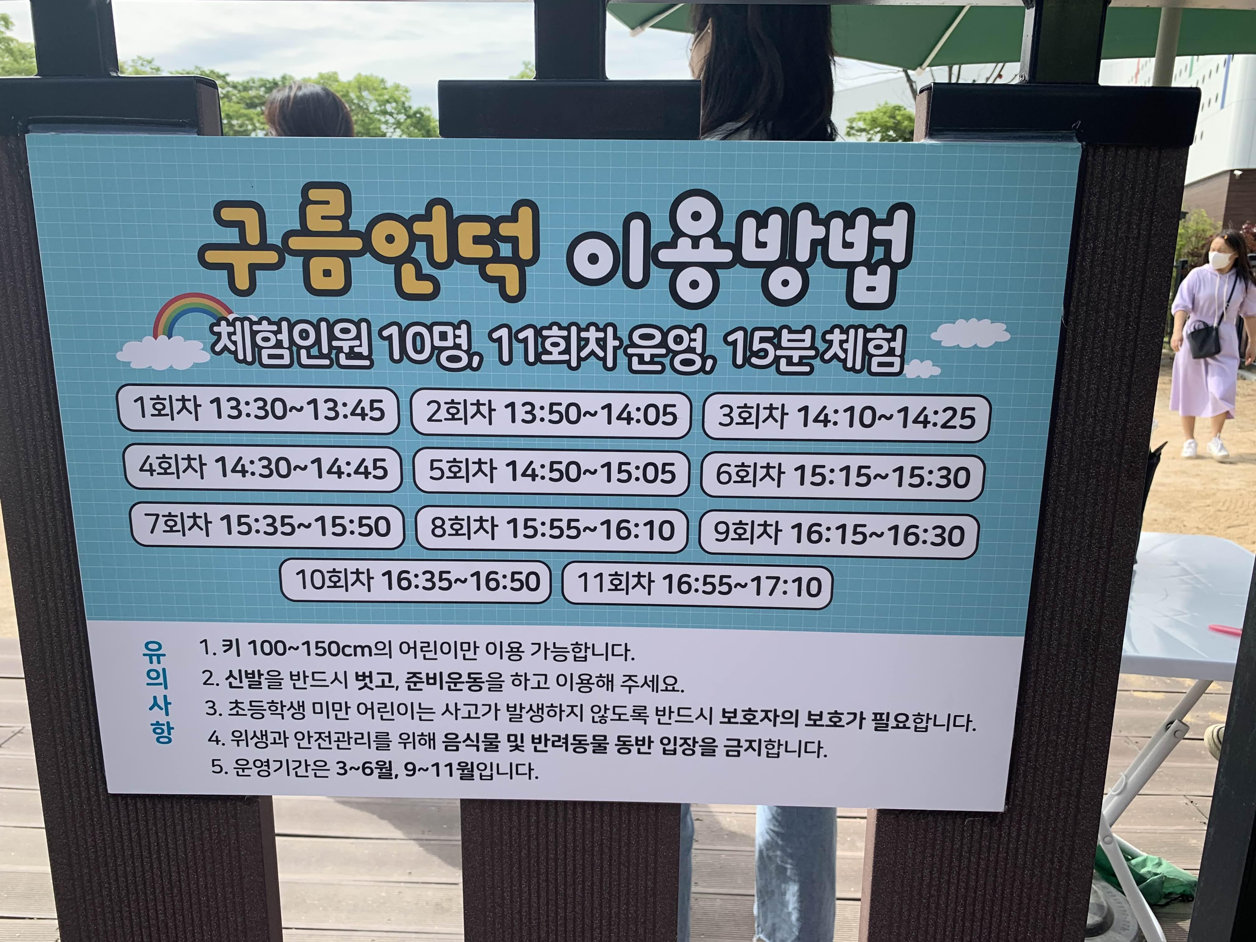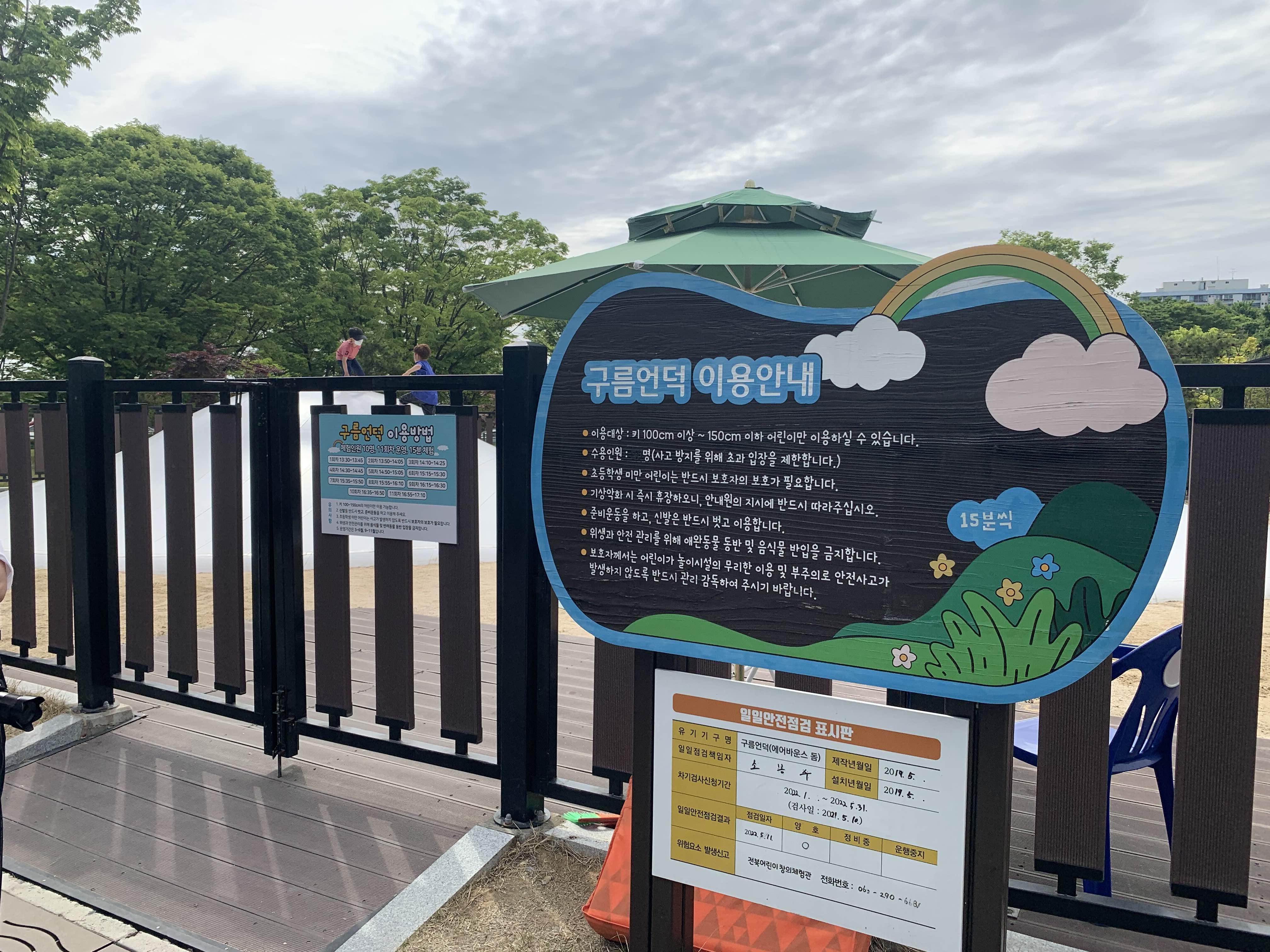구름언덕 놀이시설 주변에는 휀스로 막혀있고, 출입구 하나로 통합되어... 입장이 제한되어 있더군요. 구름언덕이 언덕과 같이 높은 산 모양으로... 주변을 막는 휀스가 없다면, 주위에 달려드는 아이들과 충돌로 사고 발생 우려가 있겠더군요. 놀이시설 주변에 휀스가 있어 안정감이 느껴지더군요.