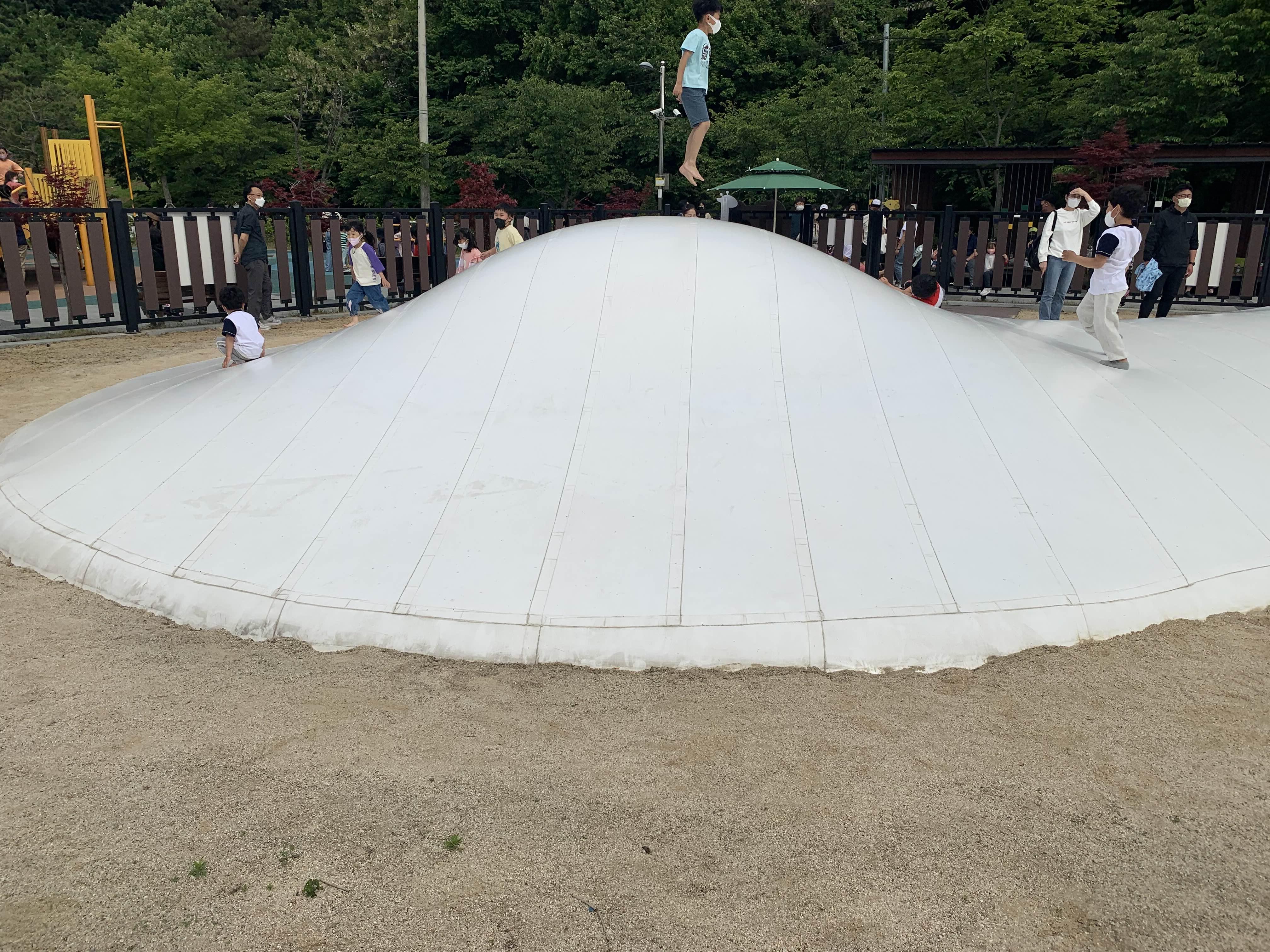 이런 말랑말랑한 구름언덕 놀이시설의 형태가 어떻게 유지될까?라는 생각이 들더군요. 놀이시설 바로 옆 기계실로 보이는 장치가 보이는데, 해당 놀이시설에 에어 콤프레셔(공기주입기)가 보이더군요. 아이들이 노는 사이에 공기를 지속적으로 주입하여 말랑말랑은 공 형태를 유지하는 거 같더군요.(아닐 수도 있음.... 그냥 나의 추측임ㅎㅎ)