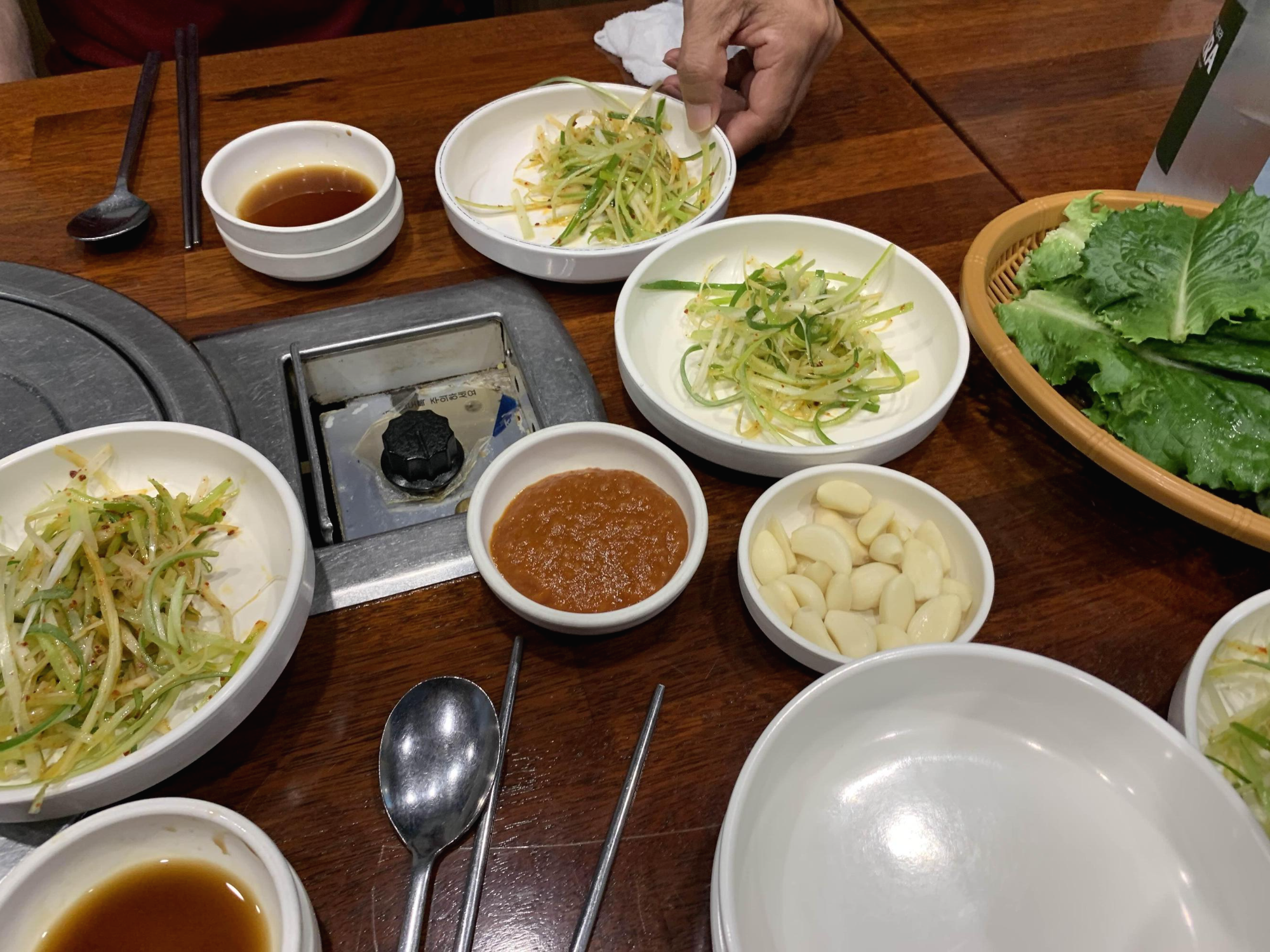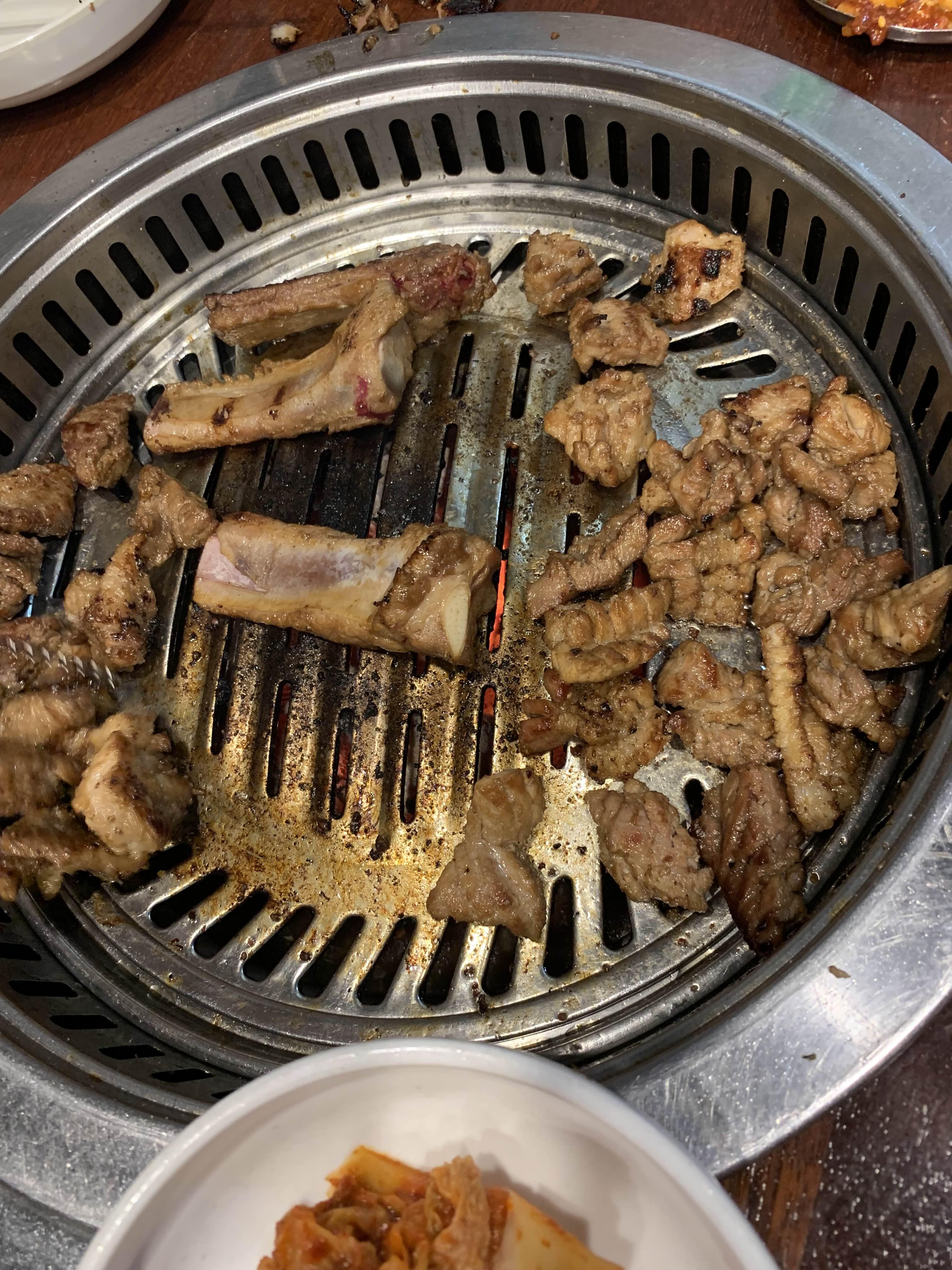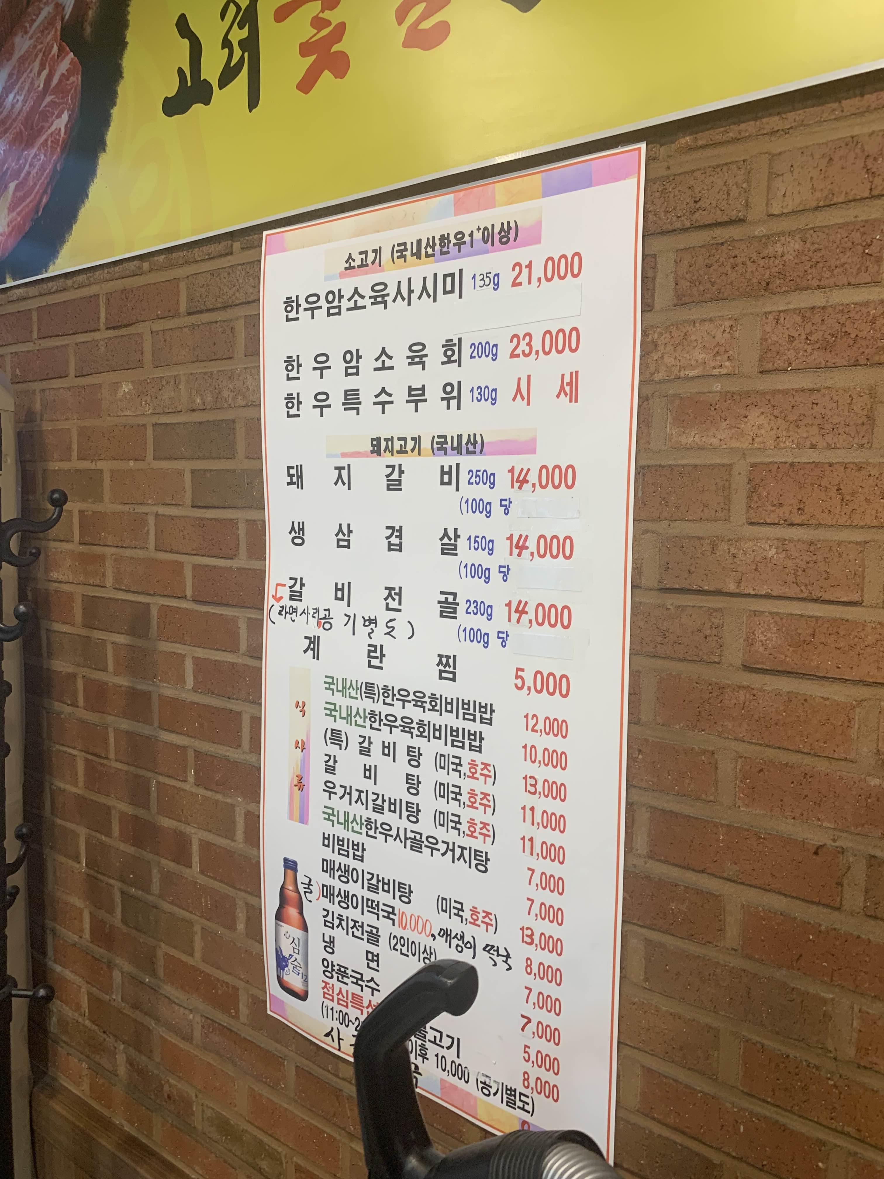 식당에 들어서며 다른 테이블 음식과 메뉴판을 스캔해 주었습니다. 다른 테이블은 고기를 굽는 테이블과 육회비빔밥을 드시는 손님들로 나뉘더군요. 육사시미를 먹기 위해 방문한 식당이라, 우선 육사시미 한 접시를 주문했습니다. 주문과 함께 나오는 말씀이..... 주말은 육사시미 안된다고 하시더군요.ㅠㅠ