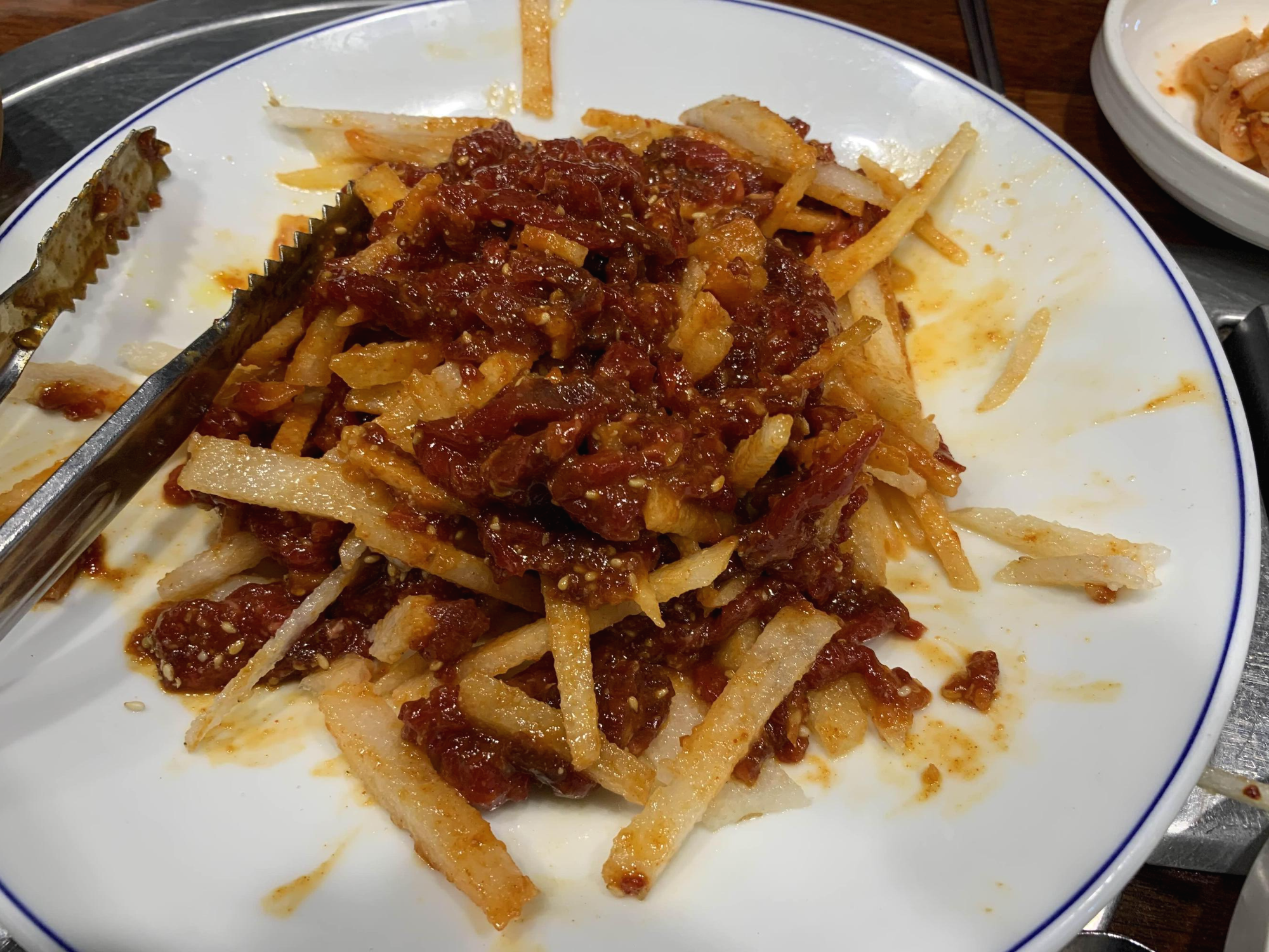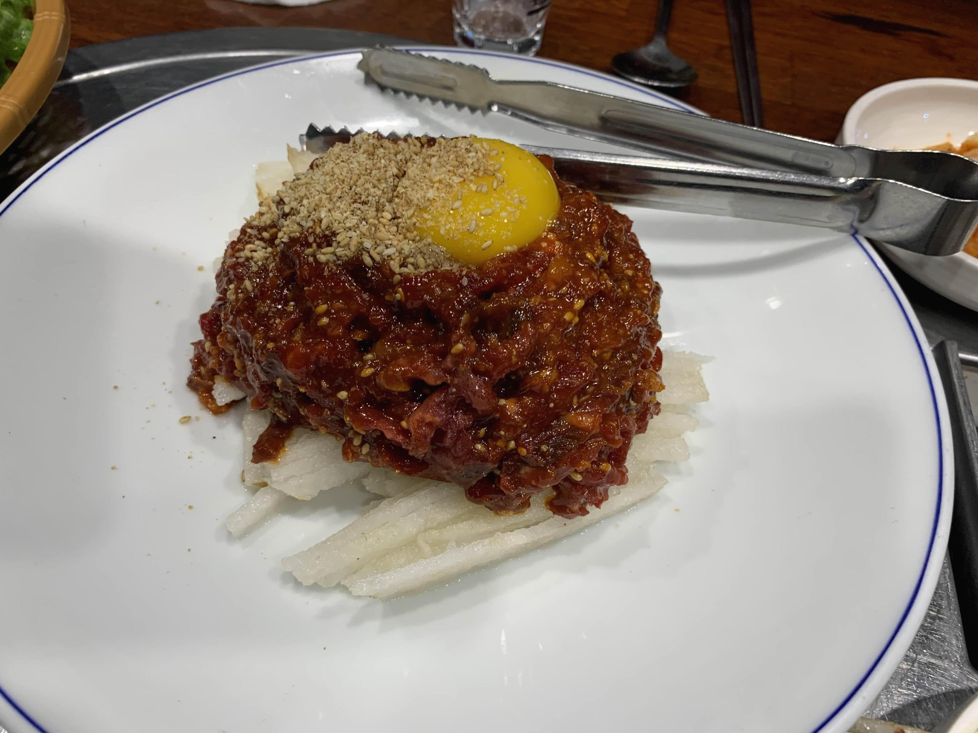 육사시미는 맛을 못 보았지만, 대안으로 주문한 육회!!! 육회의 양념장, 배 그리고 소고기의 식감은 꽤 좋더군요. 몇몇 육회 고기의 질긴 부분도 있기는 했지만, 대부분의 고기의 식감은 나쁘지는 않더군요.