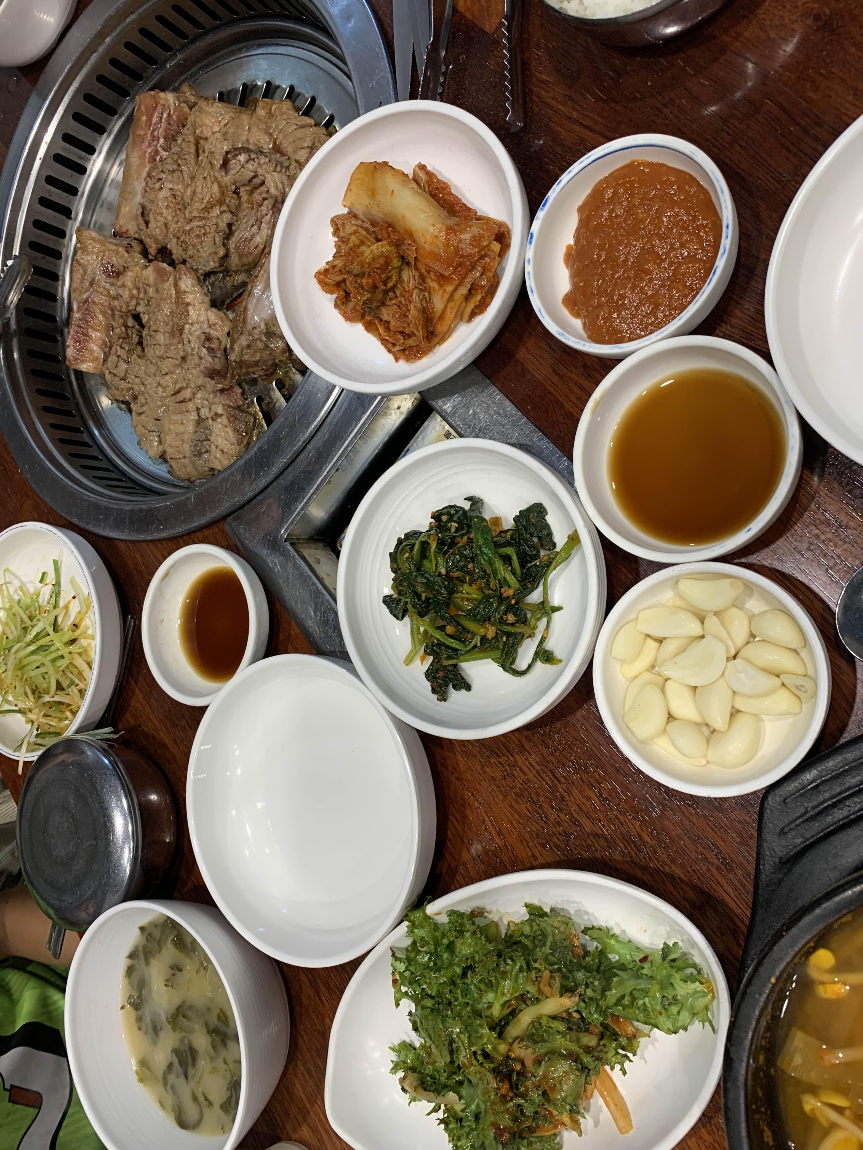 드디어 구워진 양념갈비! 갈비는 그냥 먹는 것보다 쌈채소와 다른 반찬을 곁들여 먹는 게 맛이 좋겠죠. 양념갈비의 양념 맛이나 식감은 무난한 맛이었습니다. 아래 사진은 공깃밥 주문하면 더불어 나오는 된장찌개! 된장 맛이 약하기는 하지만, 공깃밥 한 공기 꿀꺽 먹기 좋은 국이더군요.