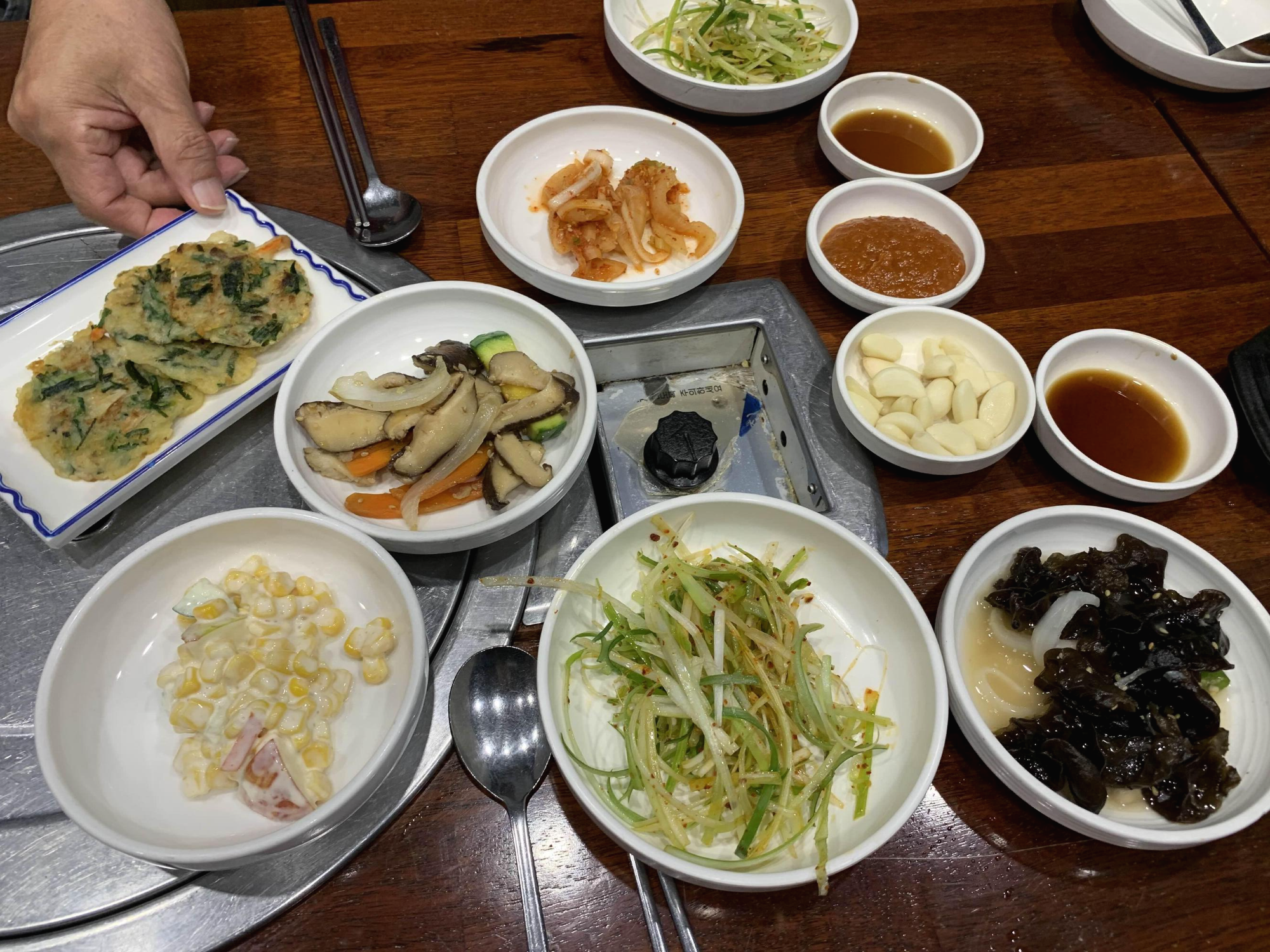육사시미 주문이 안되어... 양념갈비와 육회를 주문했습니다. 다른 식당에 비해 메뉴판의 고기 가격은 그리 나쁘지는 않더군요. 음식을 주문하고 양념갈비가 나오고... 잠시 기다리니 밑반찬으로 전, 버섯무침, 무김치가 나오는데, 밑반찬은 맛은 괜찮더군요.