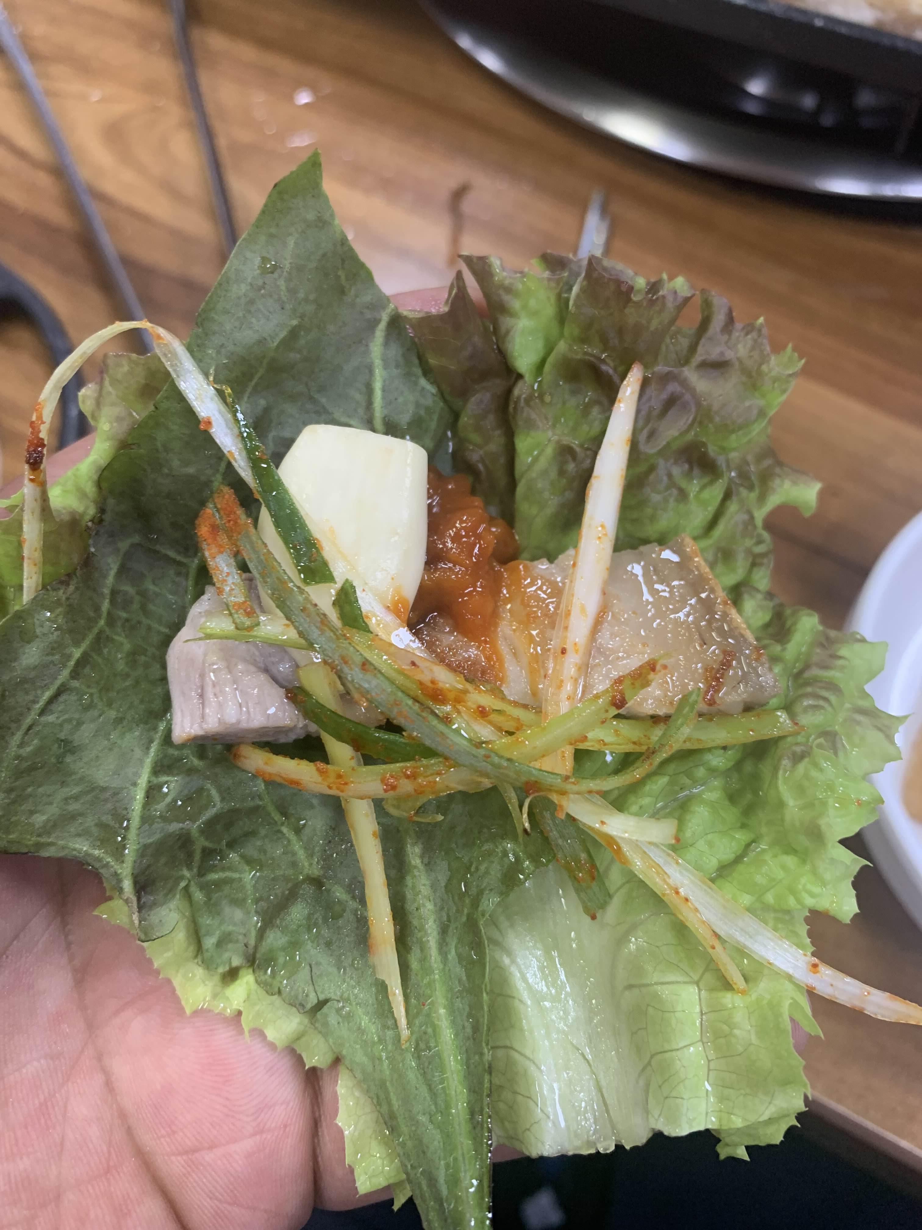 고기가 다 구워져서 쌈채소와 함께 여러 종류의 쌈을 이용에 맛보았네요. 삼겹살은 담백하게 구워져 그냥 먹어도 맛나고, 쌈에 싸 먹어도 좋더군요.