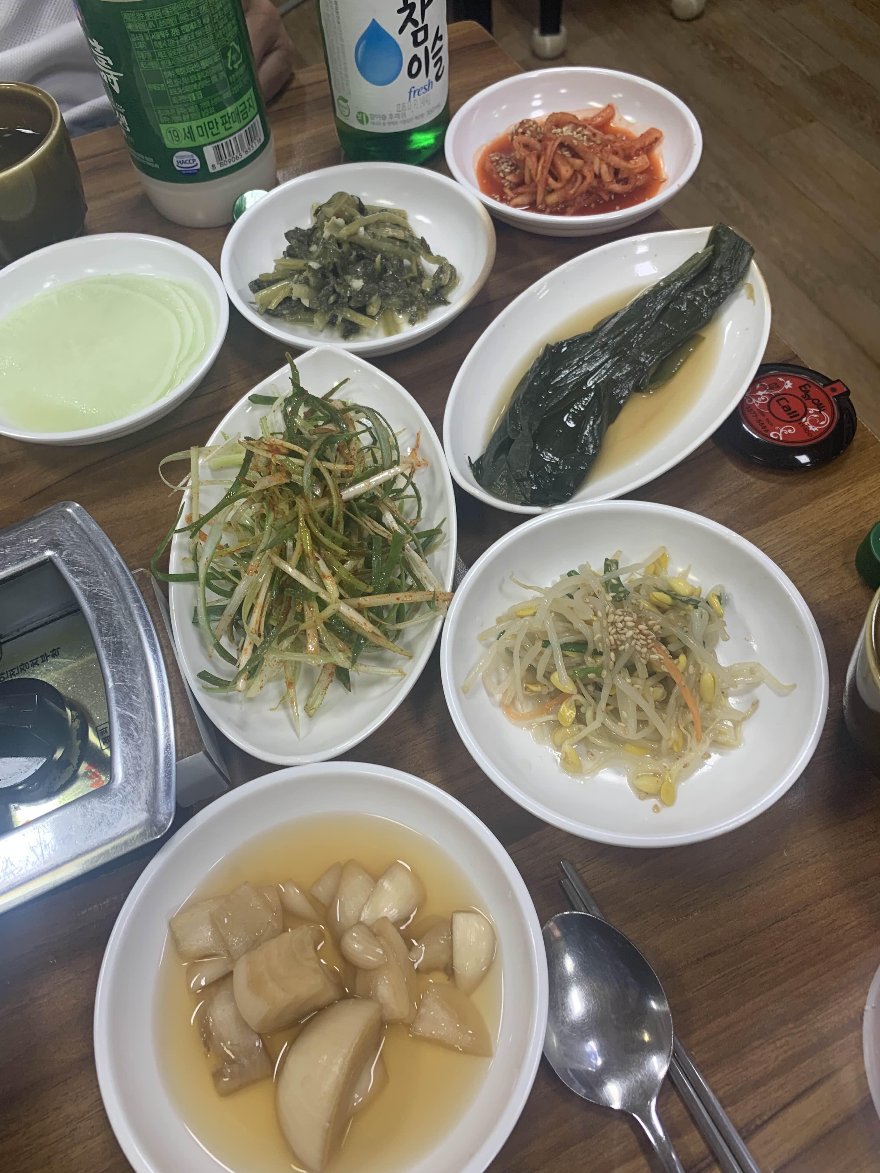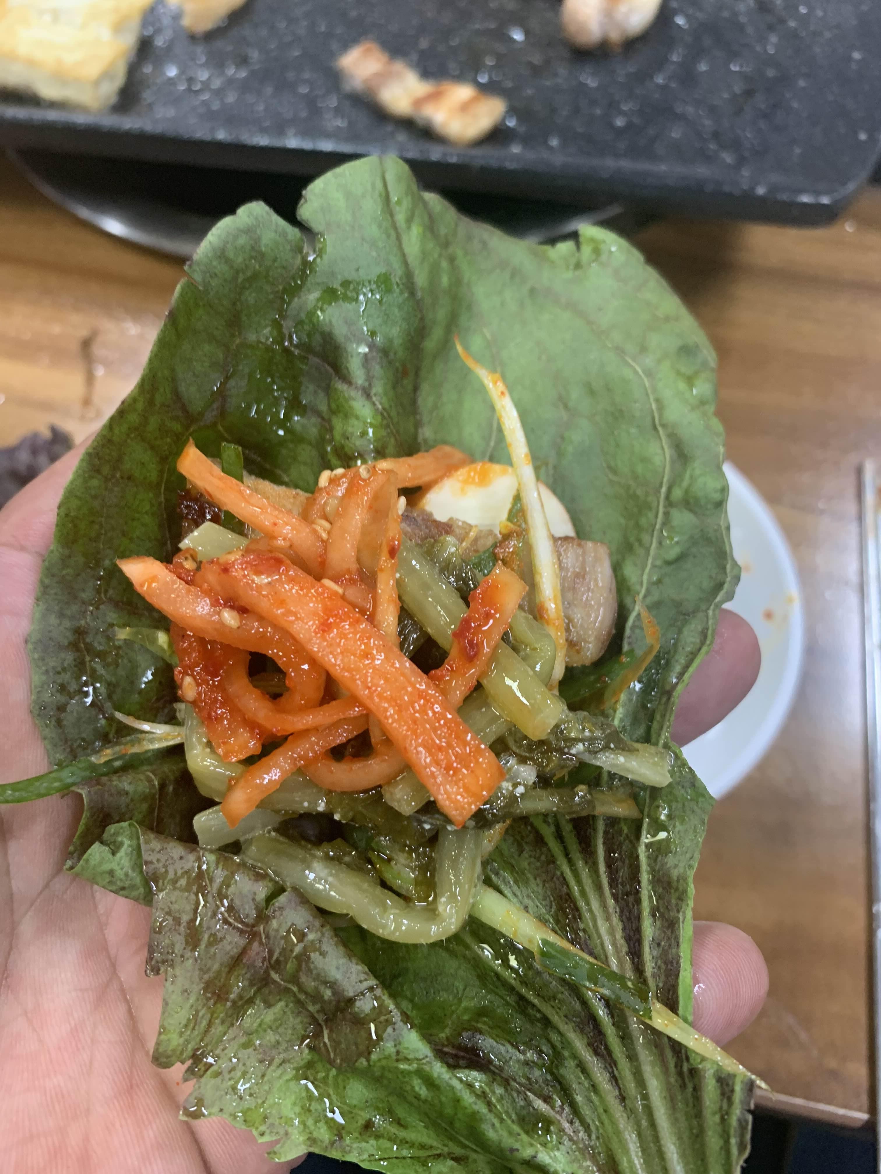 불판 위 고기가 세팅 후 이어 밑반찬으로 명이 잎, 파절이 무생채, 공나물 무침 나물이 세팅되더군요. 밑반찬으로 나쁘지 않은 세팅이 되더군요. 항상 고깃집의 세팅의 완성은 국물인데, 국물이 없어 술 한잔과 완벽한 세팅은 안되어 아쉬움이....