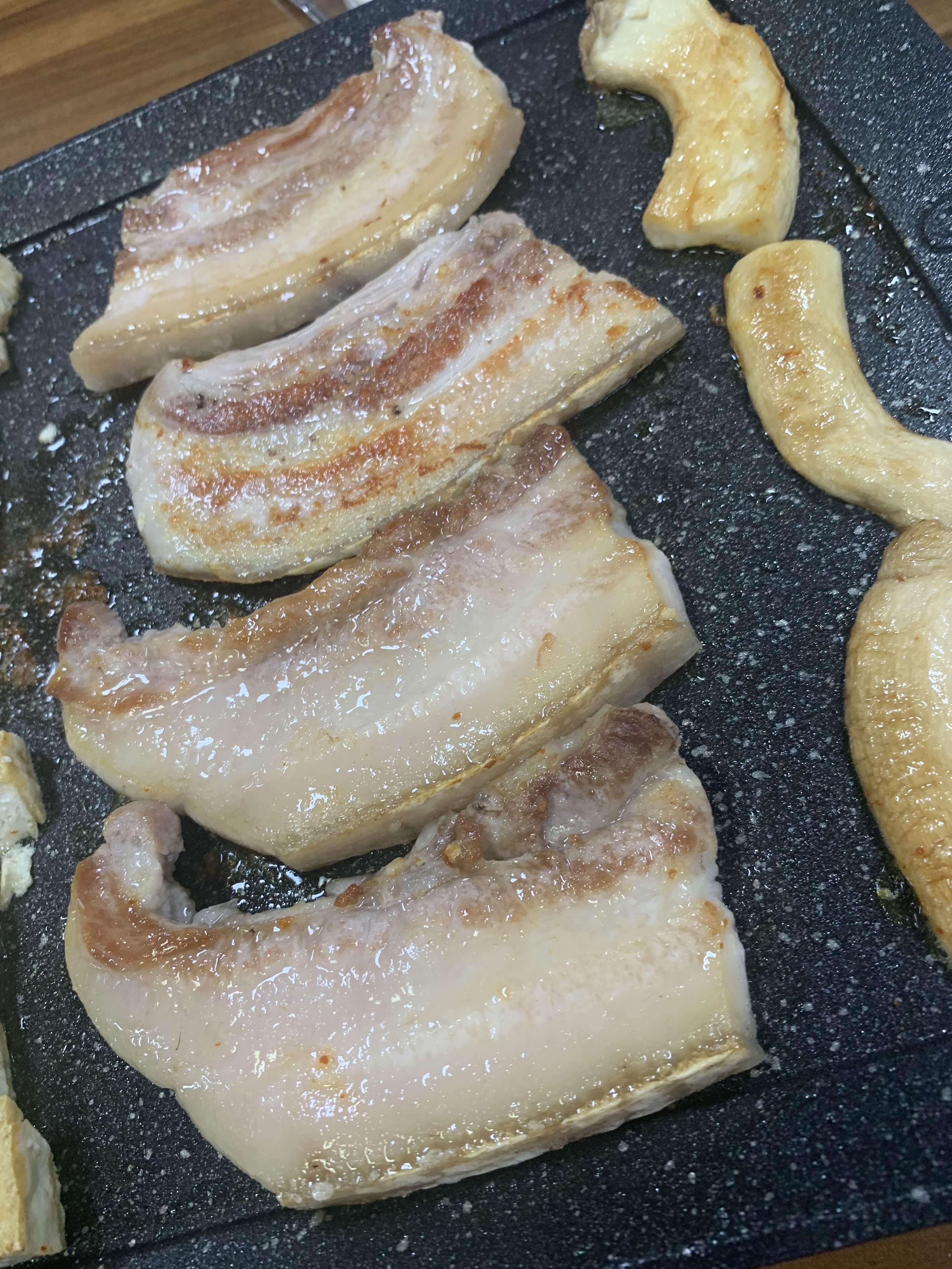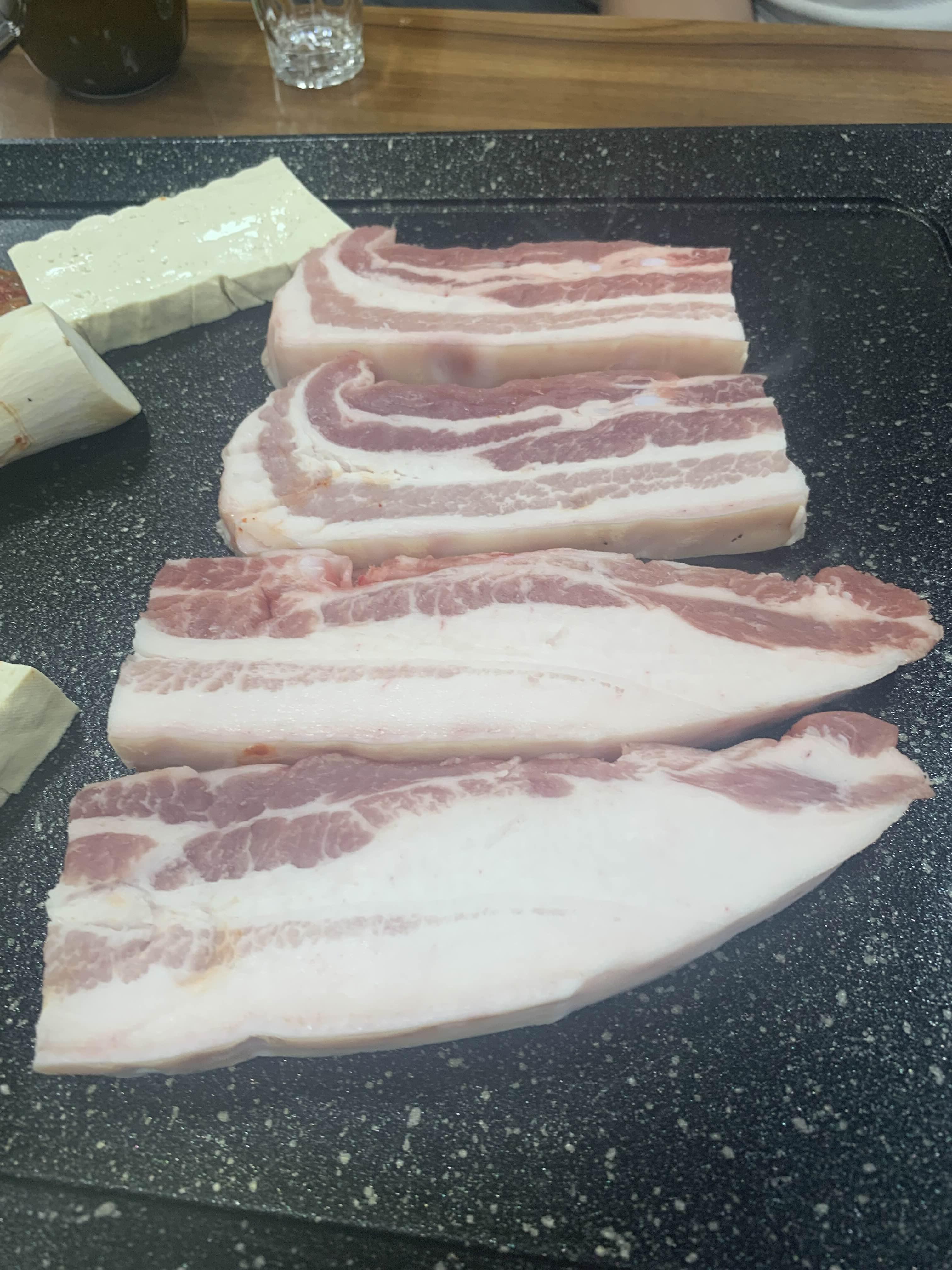 주문한 삼겹살 2인분, 통삼겹살이라 해서... 수육 느낌의 통삼겹살이 나올 줄 알았는데 일반 삼겹살보다 약간 두꺼운 스타일로 나오더군요. 불판 위에는 삼겹살, 배추김치, 버섯 및 두부가 세팅이 되더군요.