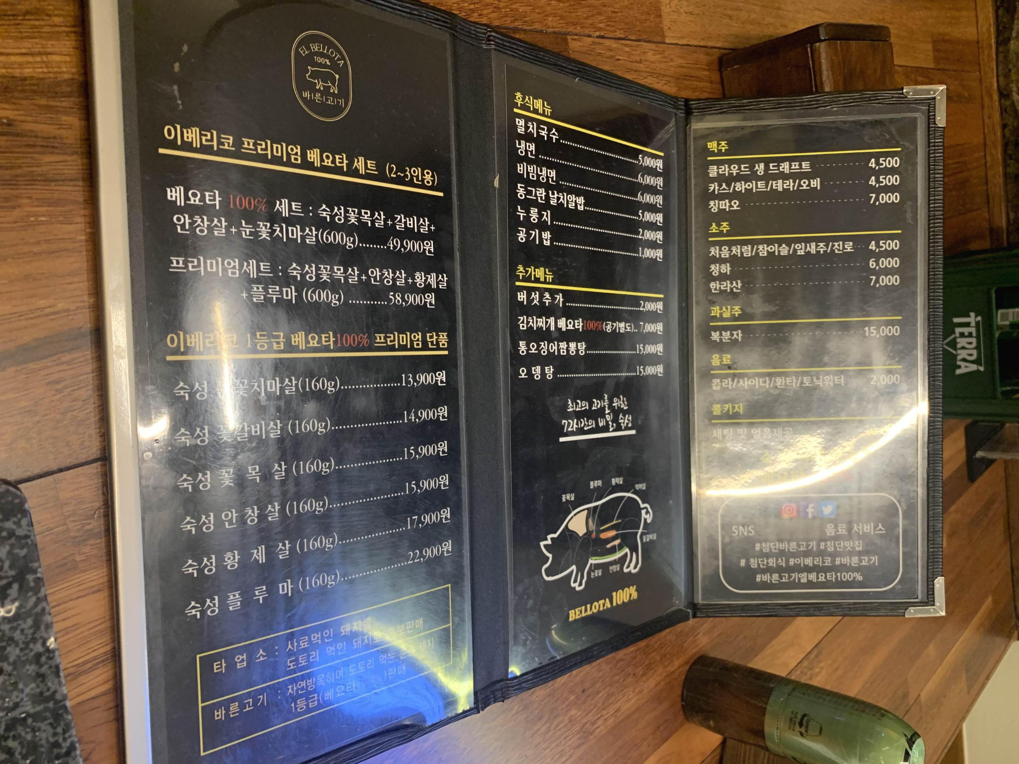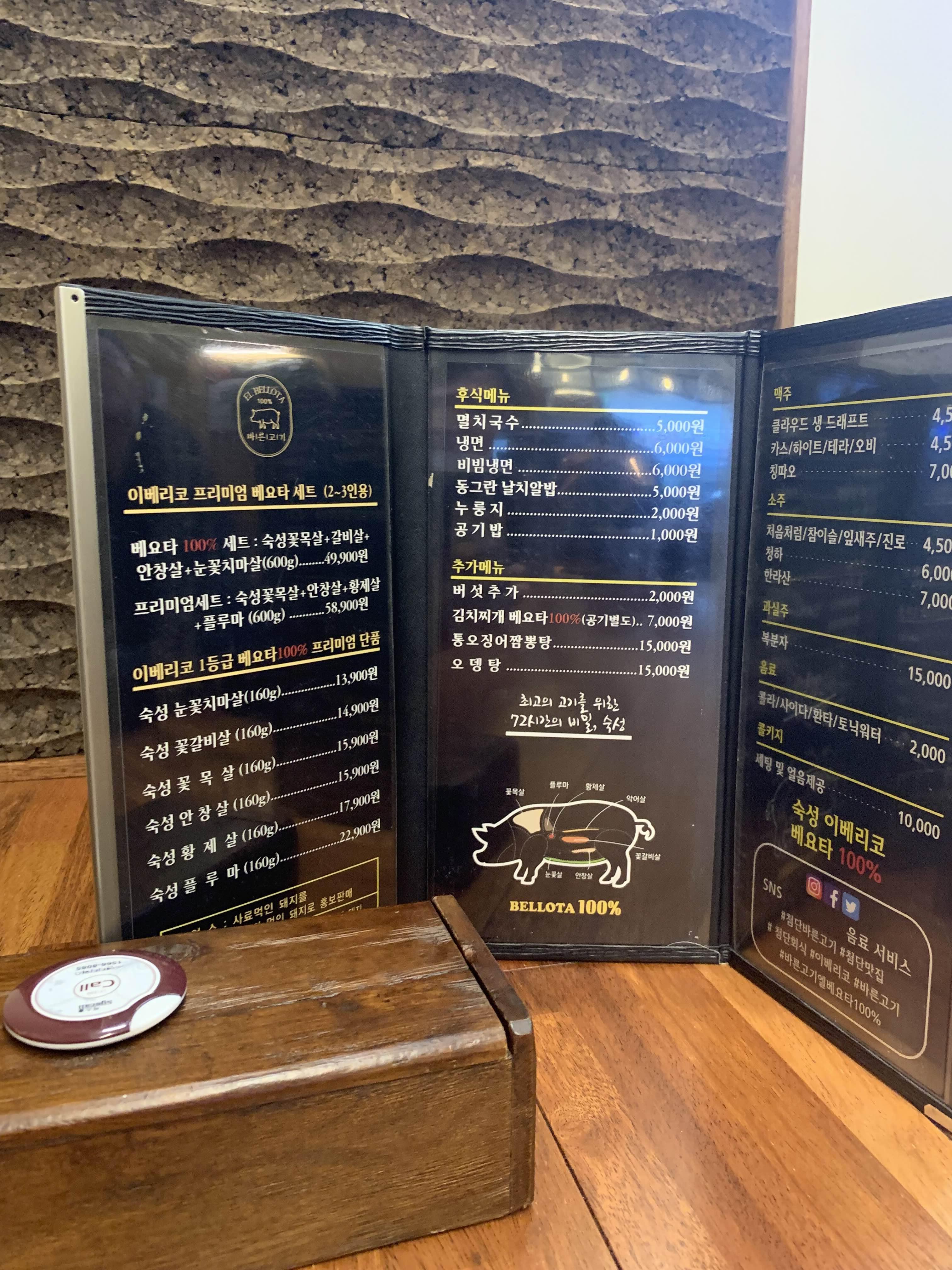 메뉴판을 스캔하고... 첫 방문한 식당이라, 추천 메뉴로 세트로 프리미엄 세트 58,900원으로 주문해 보았습니다. 테이블에 앉으면 불판이 테이블 한쪽 구석이 있는데, 고기를 어떻게 구워서 먹을까? 생각이 들었는데.... 바른 고기의 모든 고기는 직접 구워주시더군요.