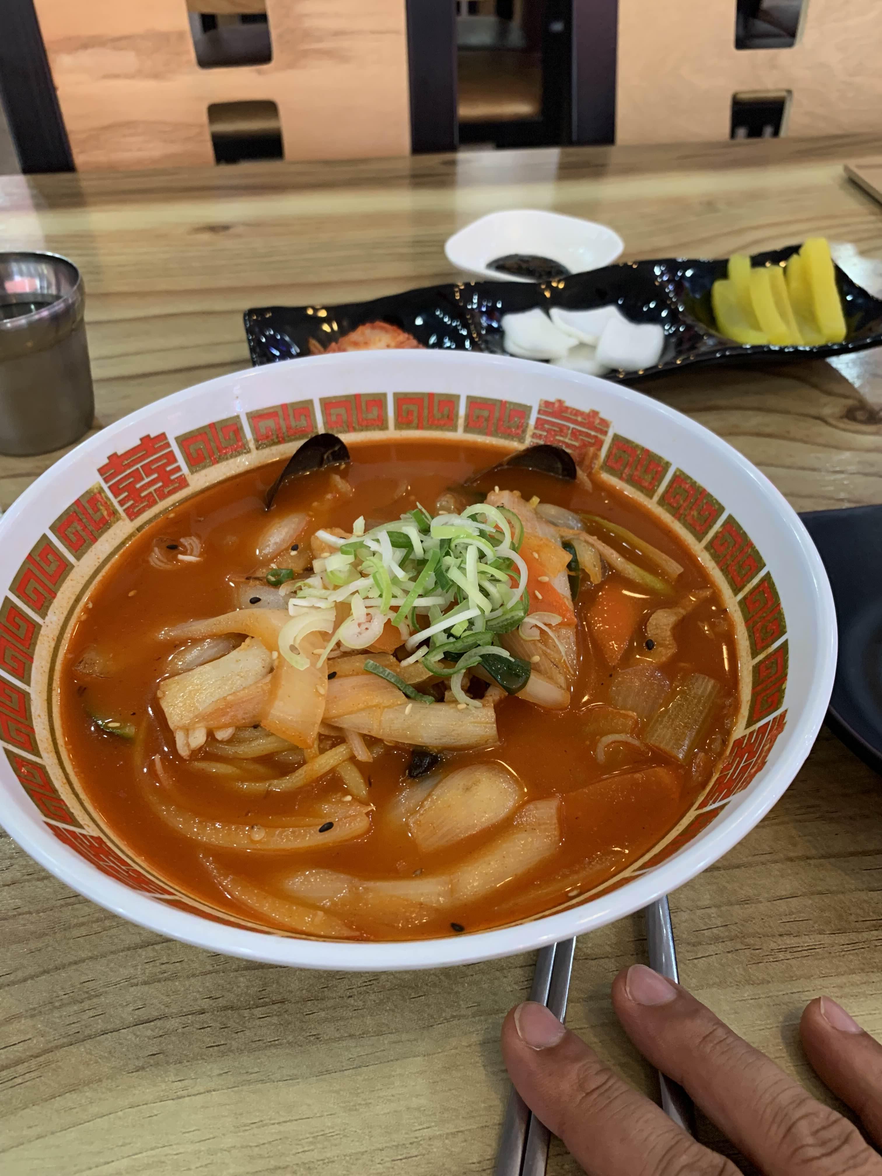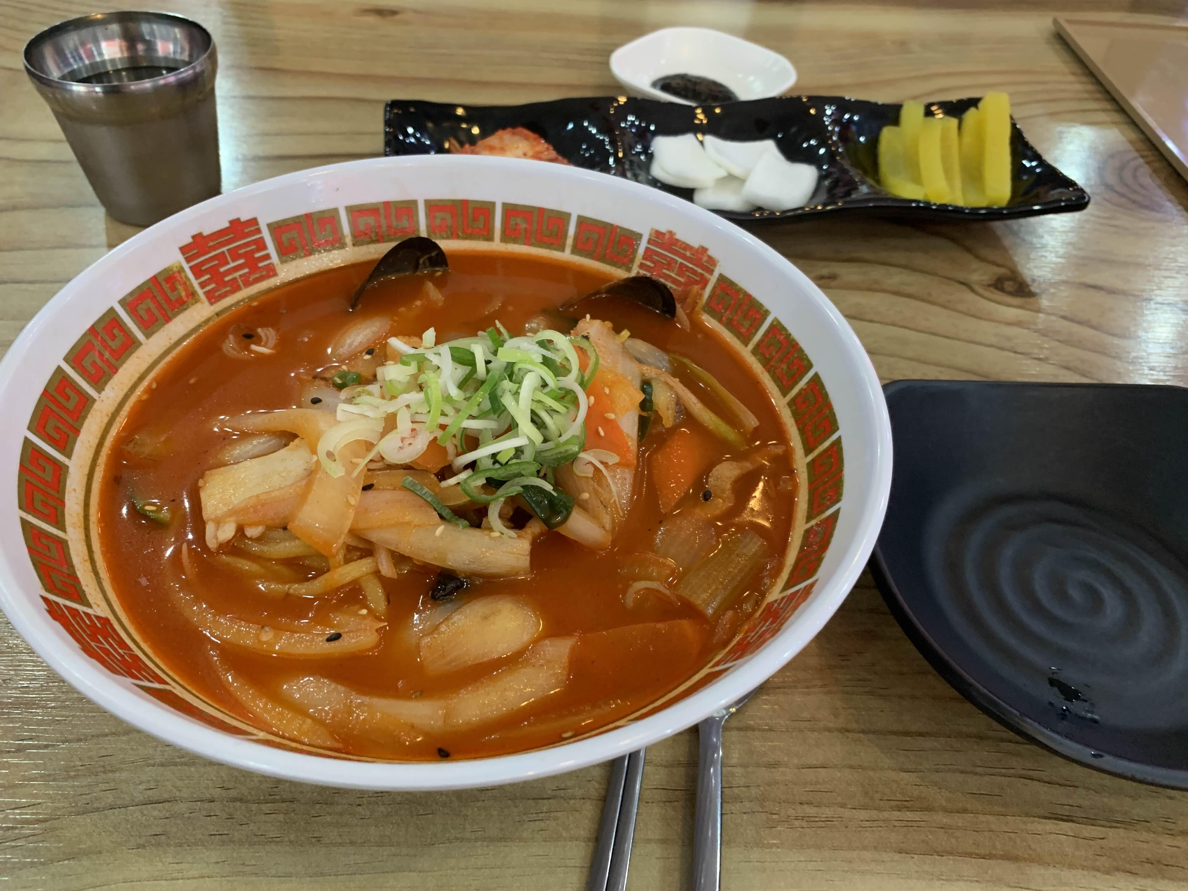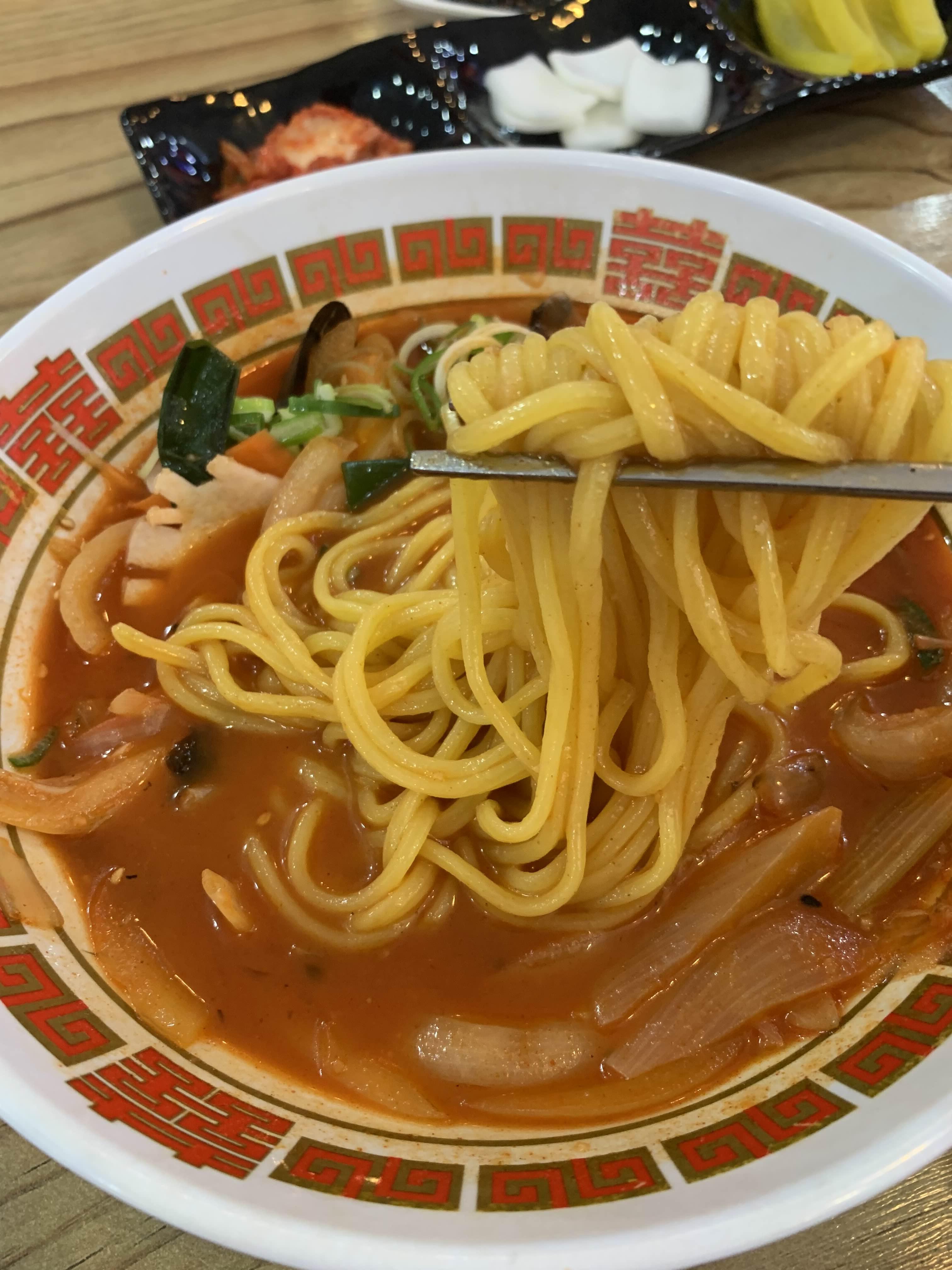 음식을 주문하고 오래되지 않아 짬뽕이 나왔습니다. 비주얼은 먹음직스러운 비주얼로, 굴 물이 얼큰해 보이더군요. 국물 한 모금을 맛보는데.... 개운한 맛보다는 진한 국물의 짬뽕 느낌이 강하더군요. 국물이 너무 진했는지..... 묵직한 국물! 상당히 매콤하더군요.