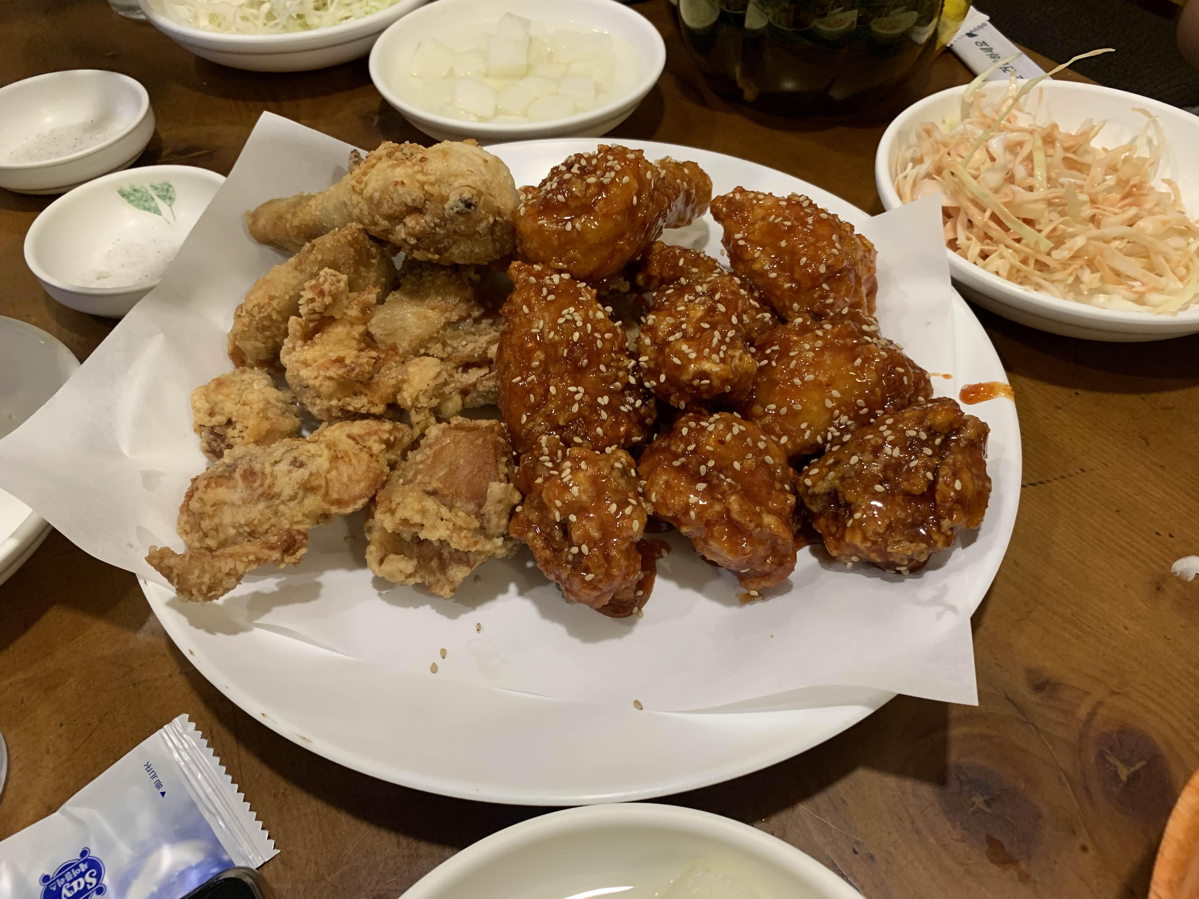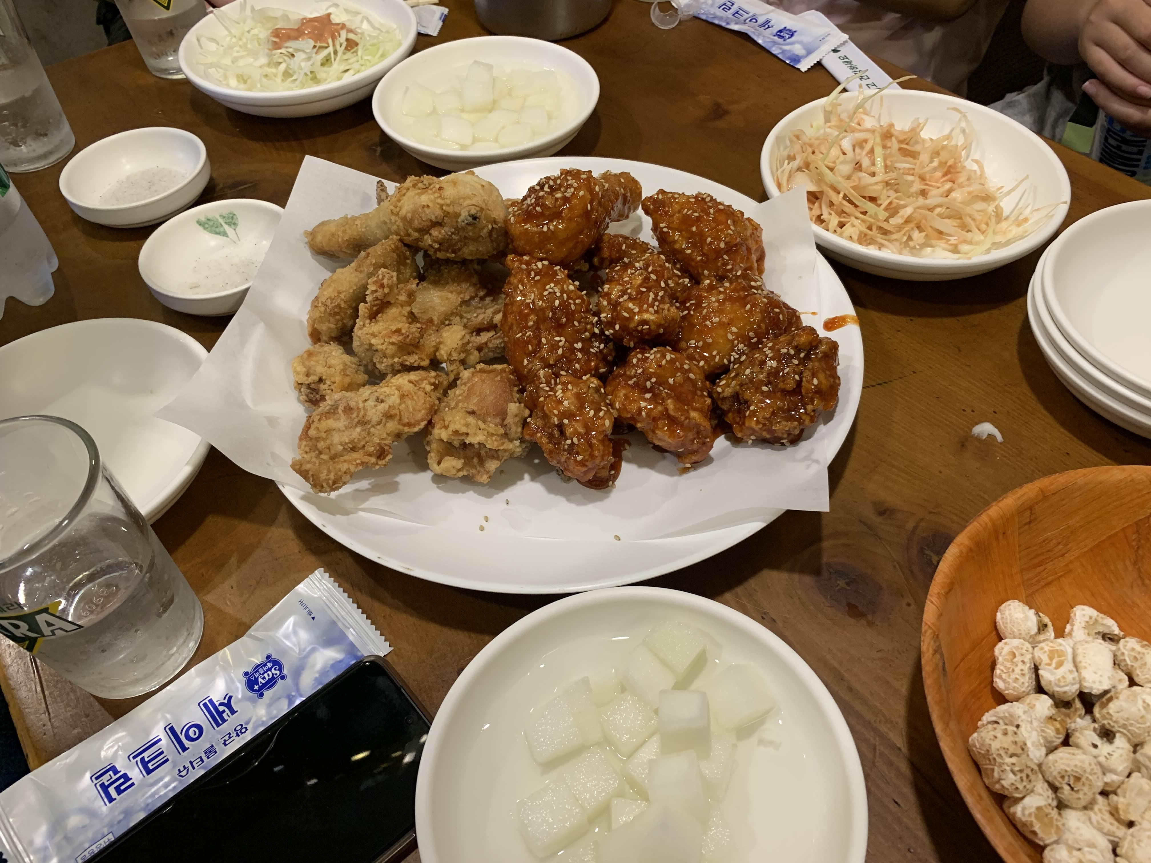 식당에 들어가 메뉴판과 다른 테이블 메뉴를 스캔하니... 반반 치킨을 많이 드시더군요. 서빙하시는 분에게 많이 나가는 메뉴를 물어보니, 반반이라고도 하시더군요. 그래서, 반반 치킨 2만 원으로 주문했습니다. 치킨이 2만 원으로.... 약간 비싼 느낌이 드는.... 요즘 물가가 많이 올랐음을 감안해도 시장 통닭으로는 비싼 느낌이 들더군요.