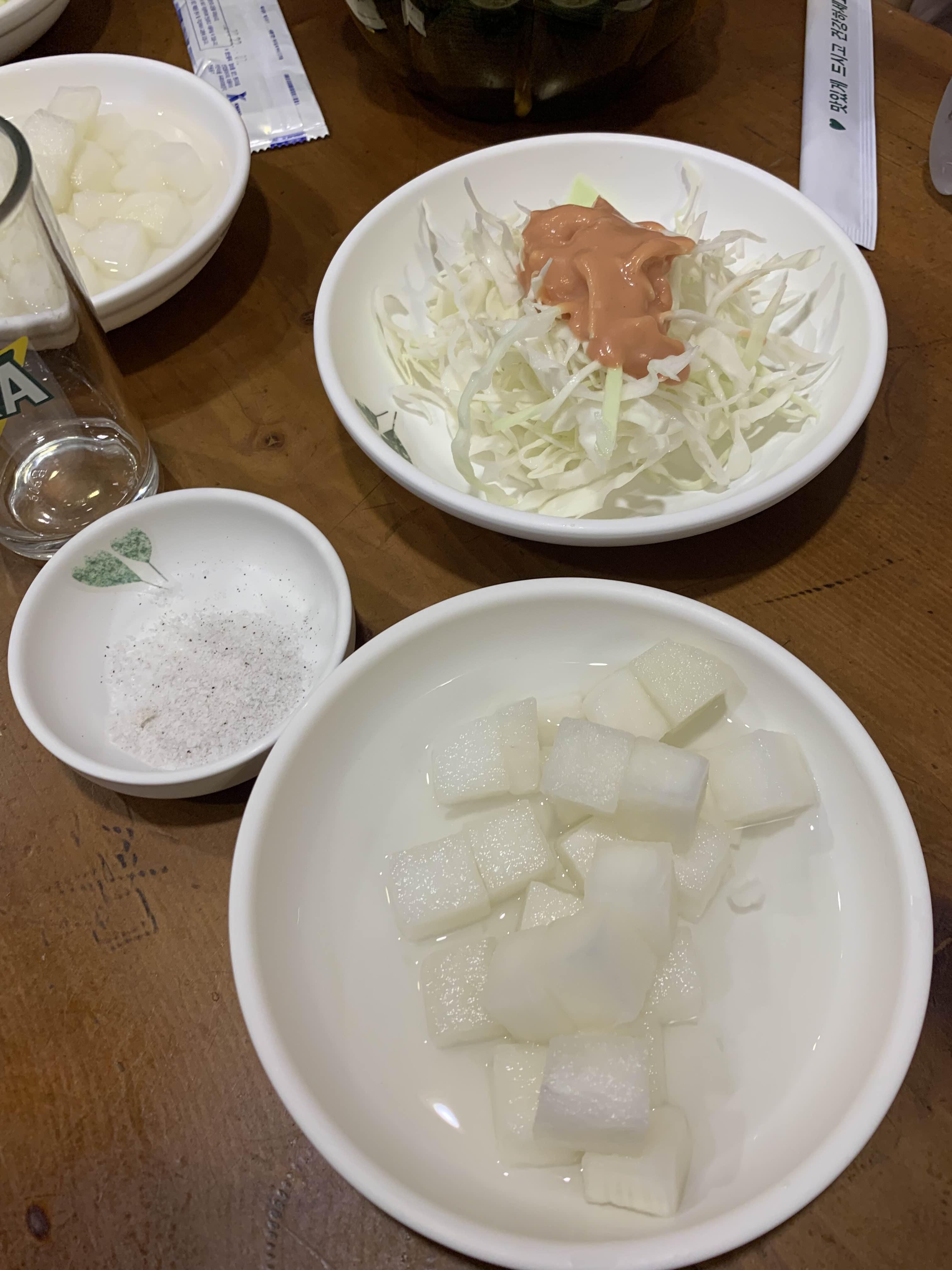 반반 치킨을 주문하면 기본 세팅으로 샐러드, 치킨무, 강냉이가 나도더군요. 치킨집에 강냉이가 나오는 치킨집은 오랜만이네요.ㅎㅎ 예전에 치킨집에서 치킨 주문 안 하고 맥주만 주문하면, 함께 나왔던 강냉이 느낌이 들기도 하더군요.ㅎㅎ