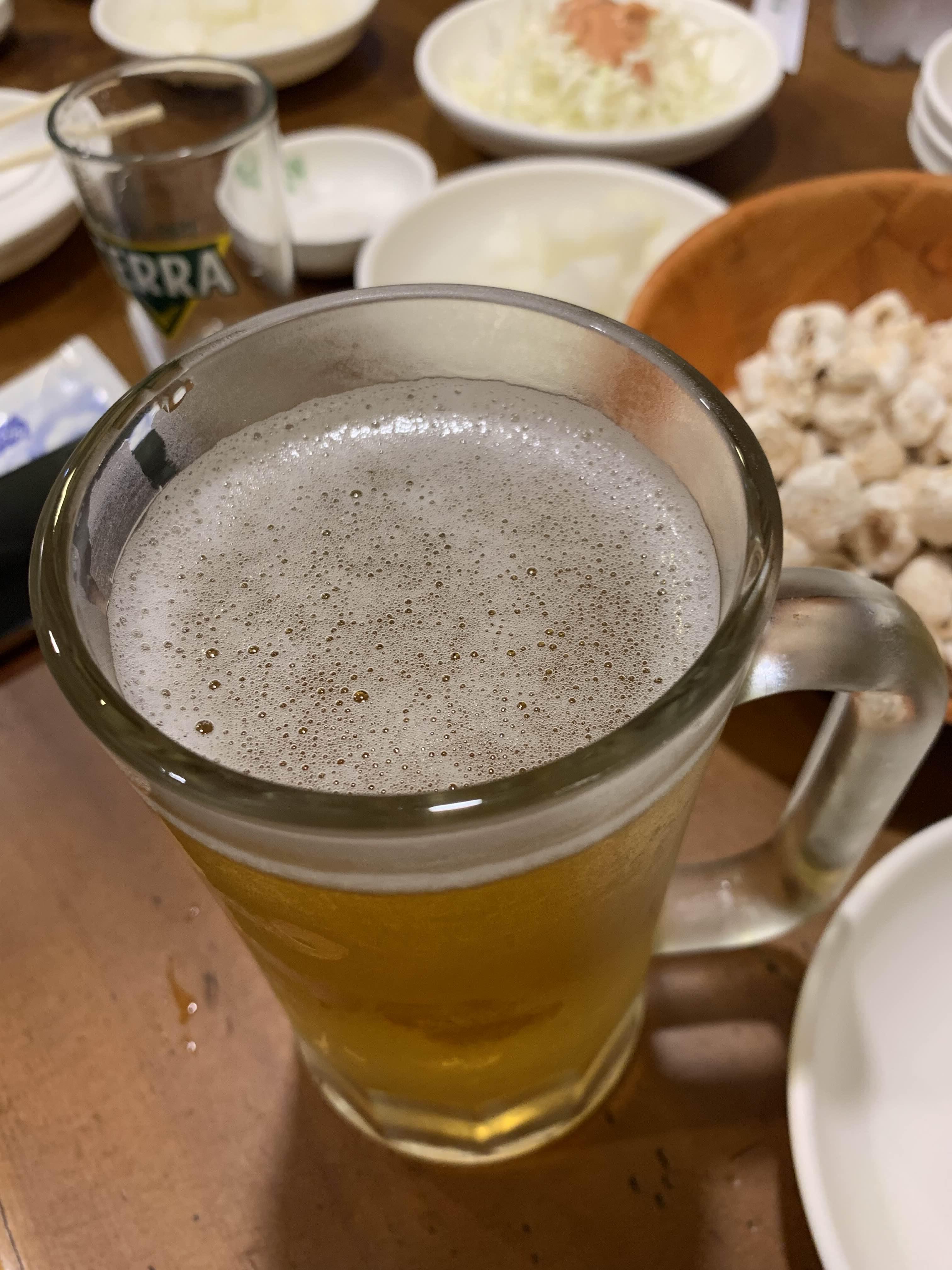 치킨에 빠질 수 없는 생맥주 500으로 주문해보았습니다. 그리고 기다리고 기다리던 반반 치킨이 나왔습니다. 먼저 후라이드 한 덩어리를 잡고 뜯어보았습니다. 닭다리를 맛보고 싶었지만, 이제는 닭다리는 아이들에게 양보;;;