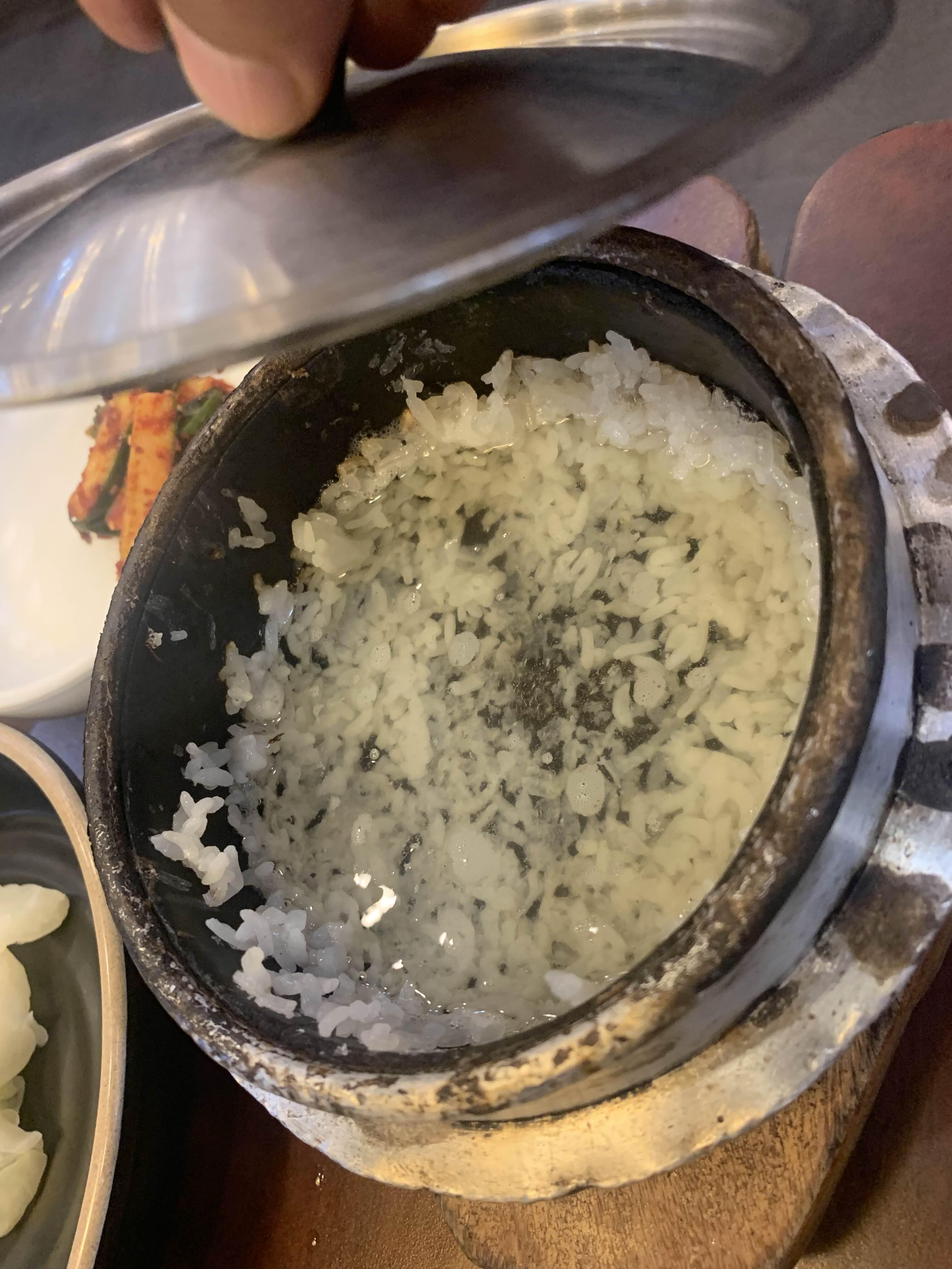 정갈하게 나온 한정식 2인분으로 32,000원 상차림입니다. 이천 쌀밥을 우선 공기에 덜고, 주전자의 미지근한 물을 부어서 누룽지를 만들었습니다. 그리고, 쌀밥을 한 숟가락 맛보는데....