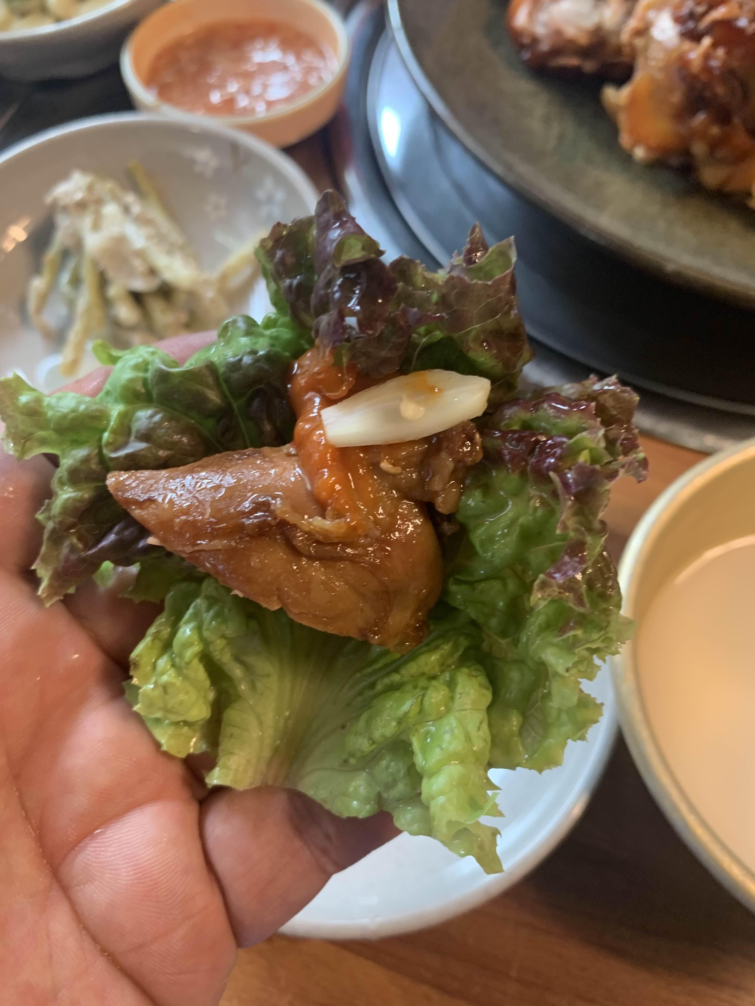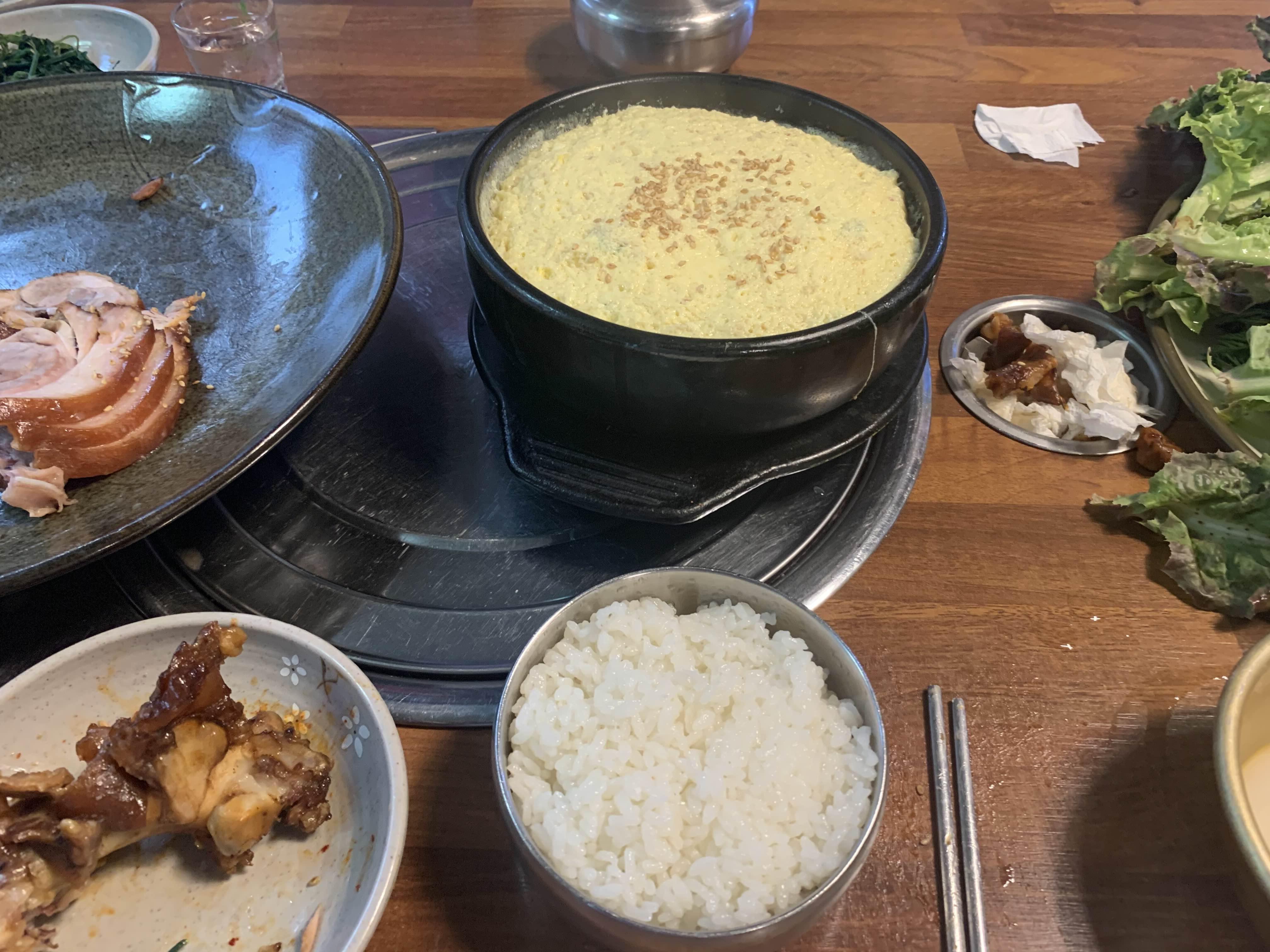 쌈채소로 족발은 싸 먹다가 싸 먹는 게 질림 줌.... 뼈다귀를 잡고 뜯어먹고~ 어느 정도 족발 맛을 다 보았으니.... 후식으로 공깃밥을 주문했습니다. 공깃밥만 주문하면, 백반으로 변신되는 반찬! 따뜻한 음식이 좀 당기어~ 달걀찜 하나 추가해 보았습니다. ㅎㅎ